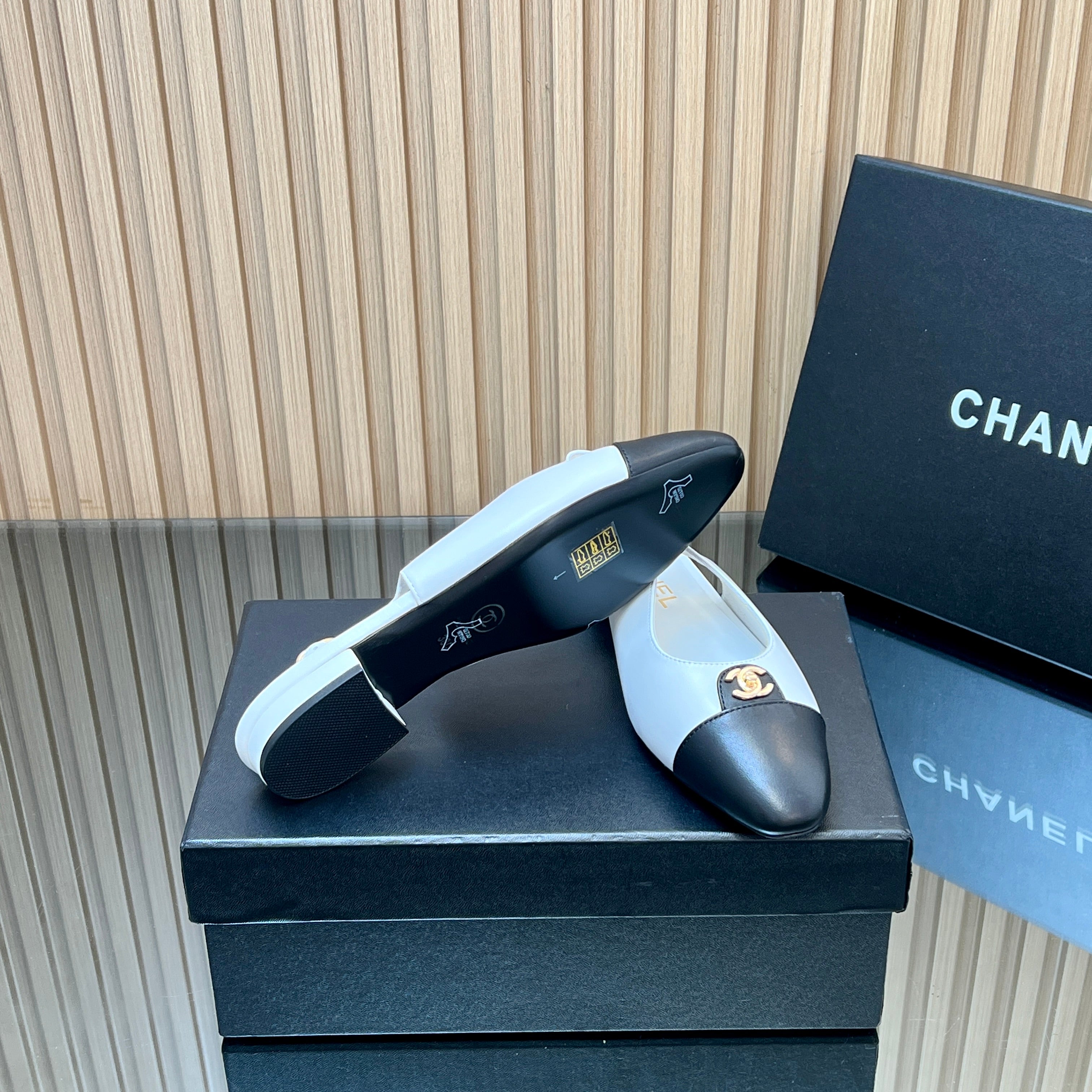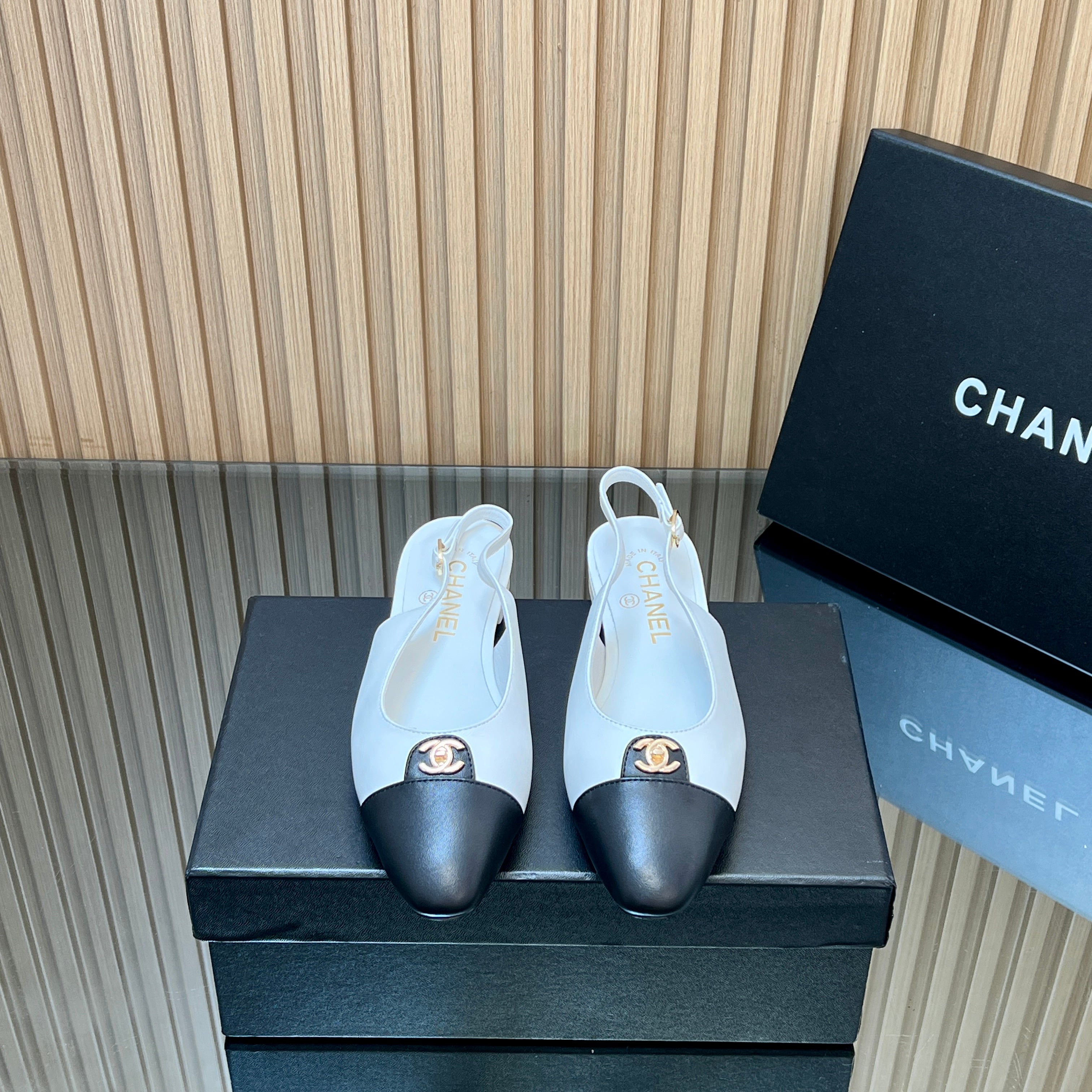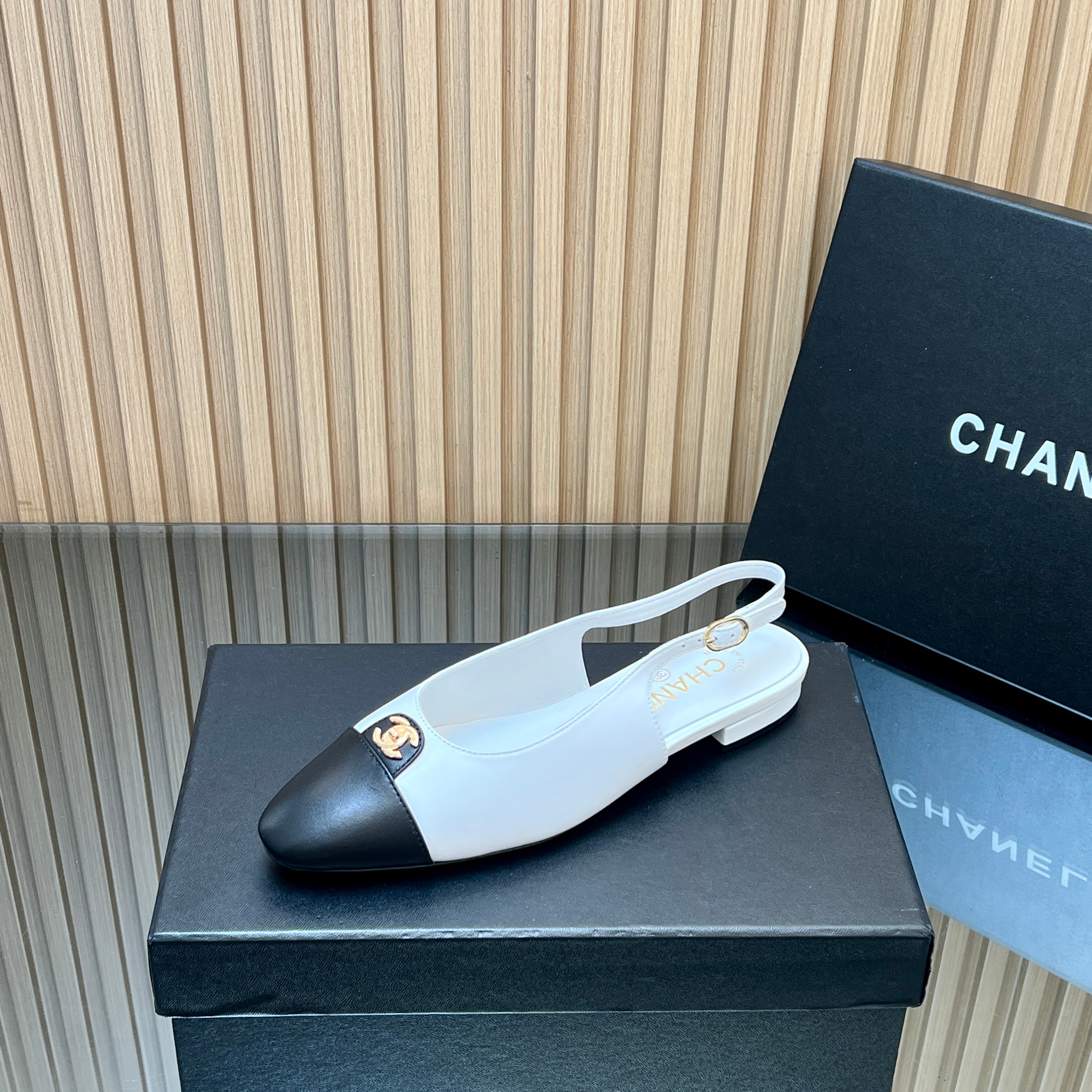 CHANEL 25S SLINGBACK FLATS IN WHITE CALFSKIN GOLD HARDWRE