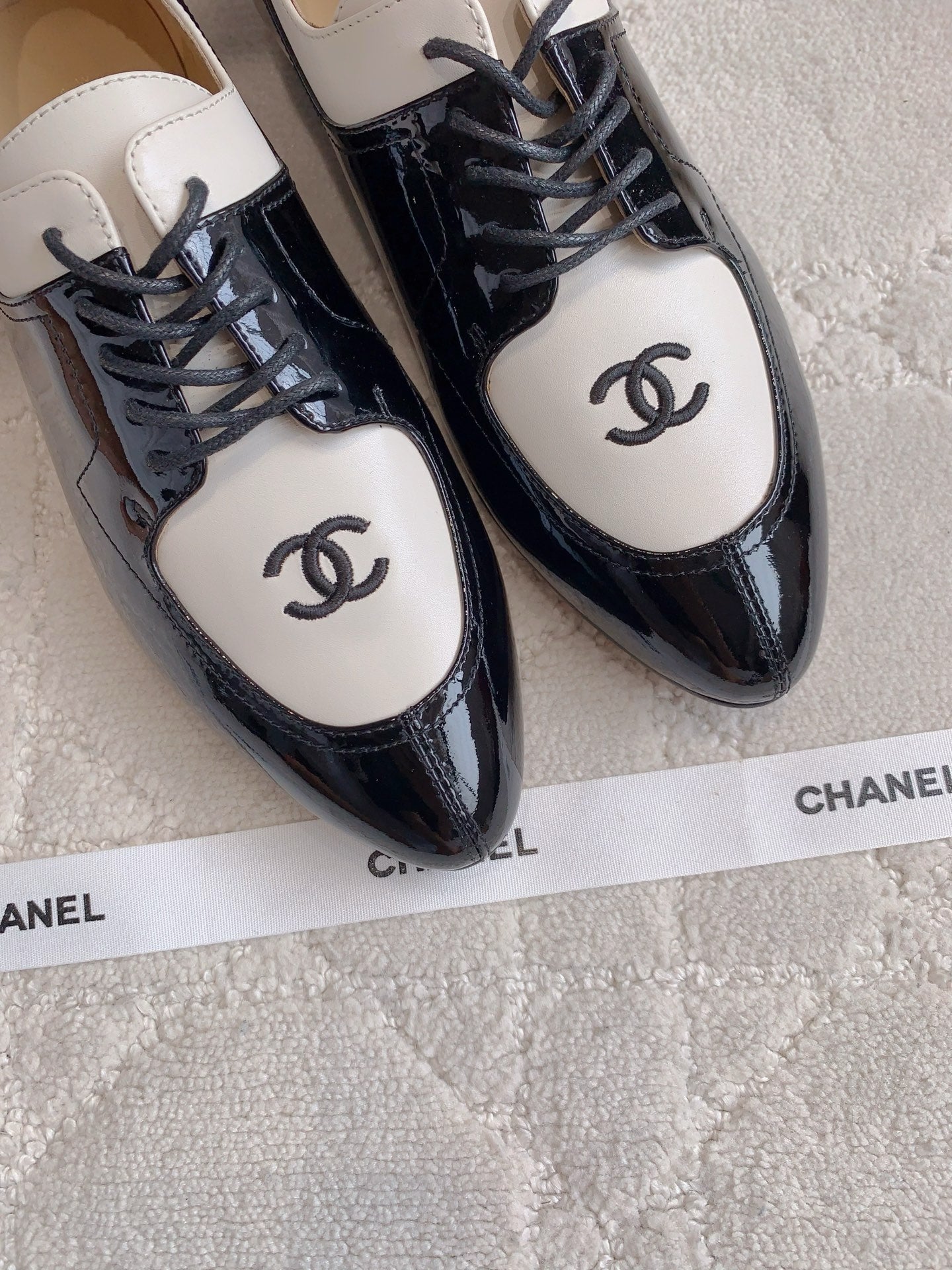 CHANEL 25S TWO TONE LACE UP IN BLACK AND WHITE SHINY CALFSKIN