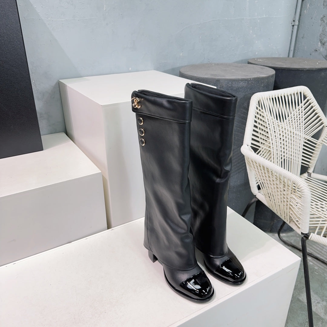 CHANEL HEELED KNEE-HIGH BOOTS 25S 85 MM IN BLACK LAMBSKIN WITH GOLD HARDWARE