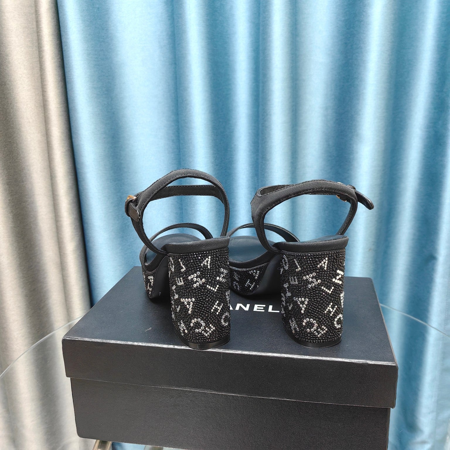 Chunky Heel Rhinestone High Sandals Black Lambskin