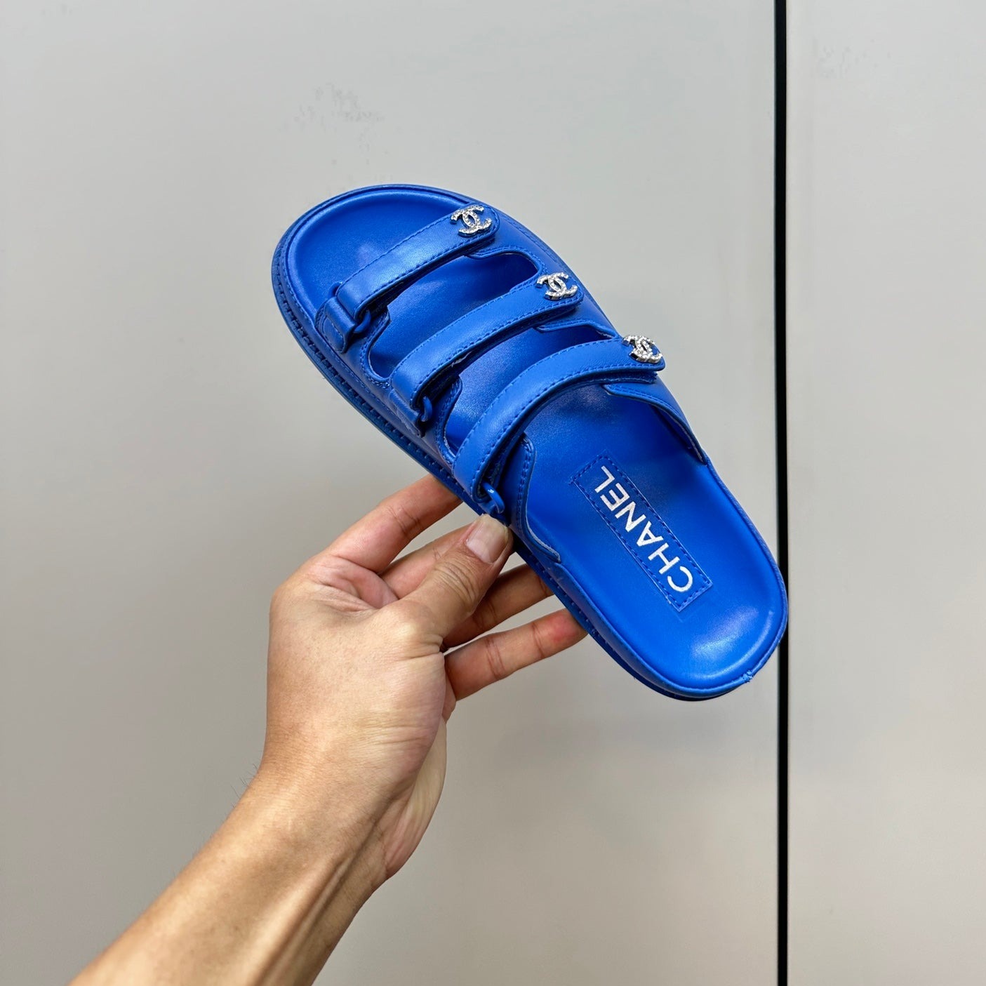 dad sandals blue 3 rows lambskin mules