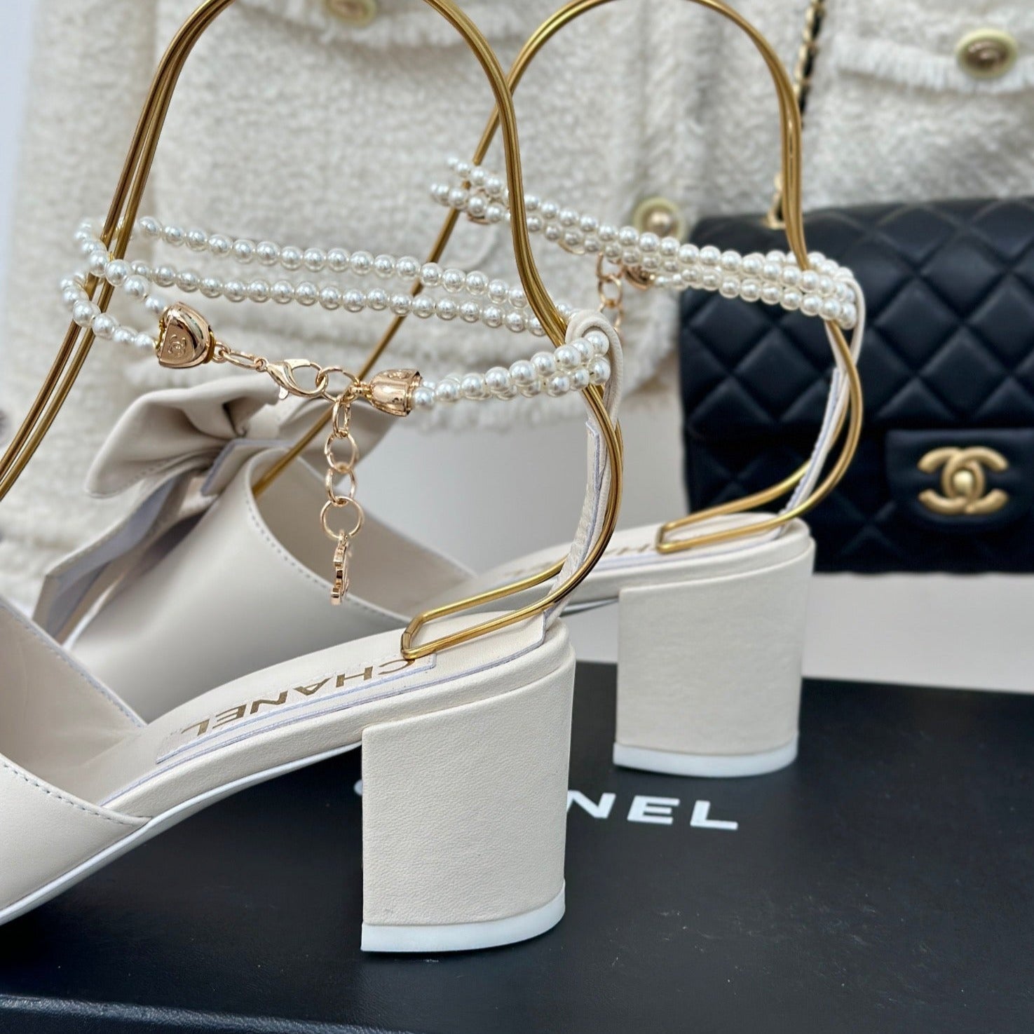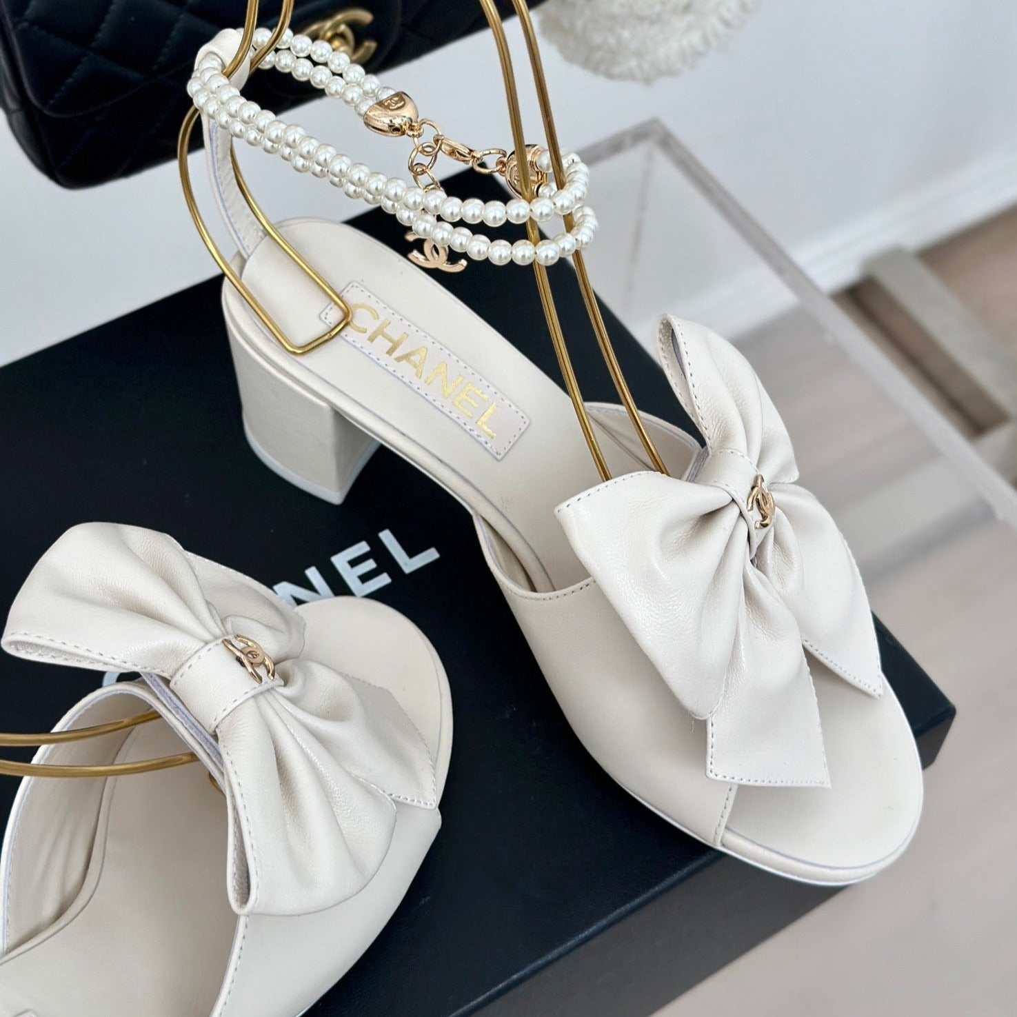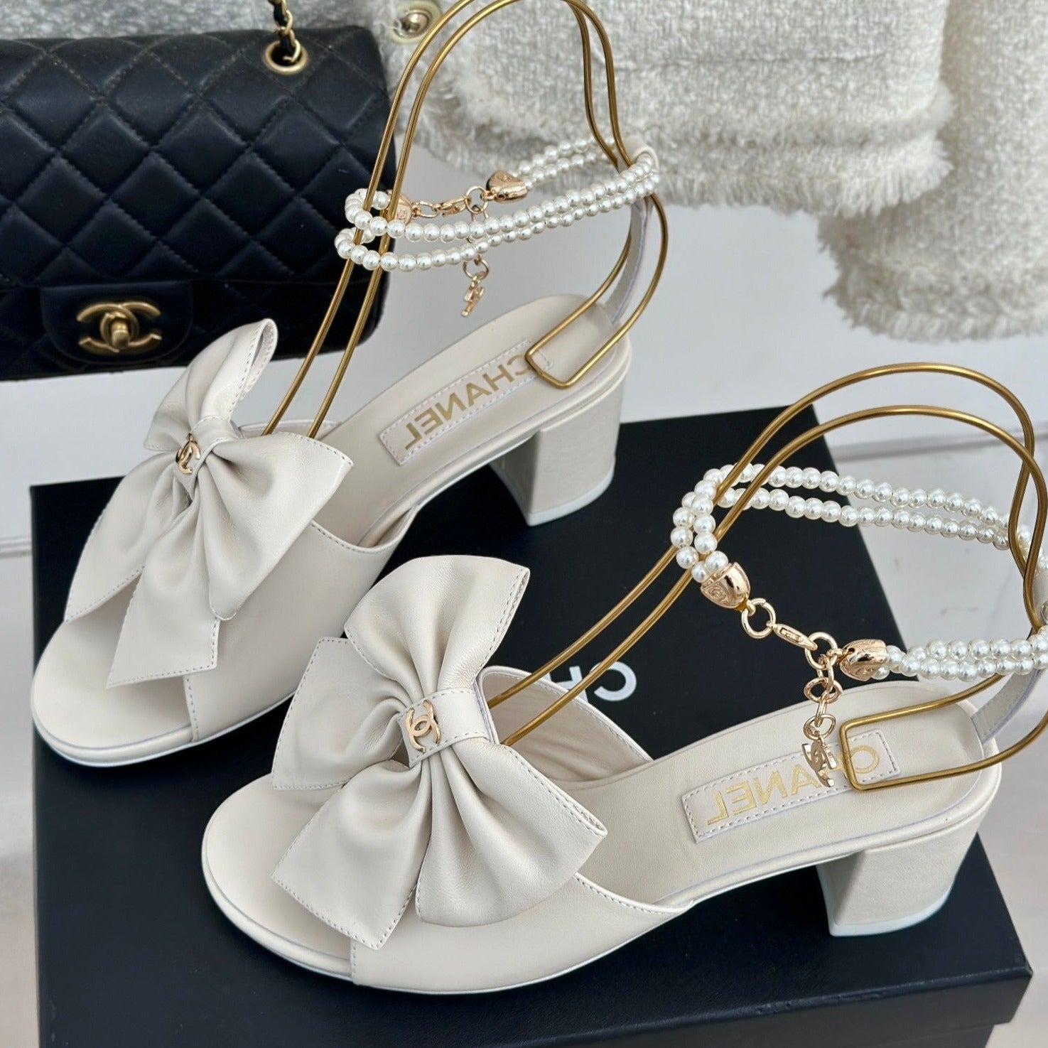 Double C Big Bow Pearl Chain High Sandals White Lambskin
