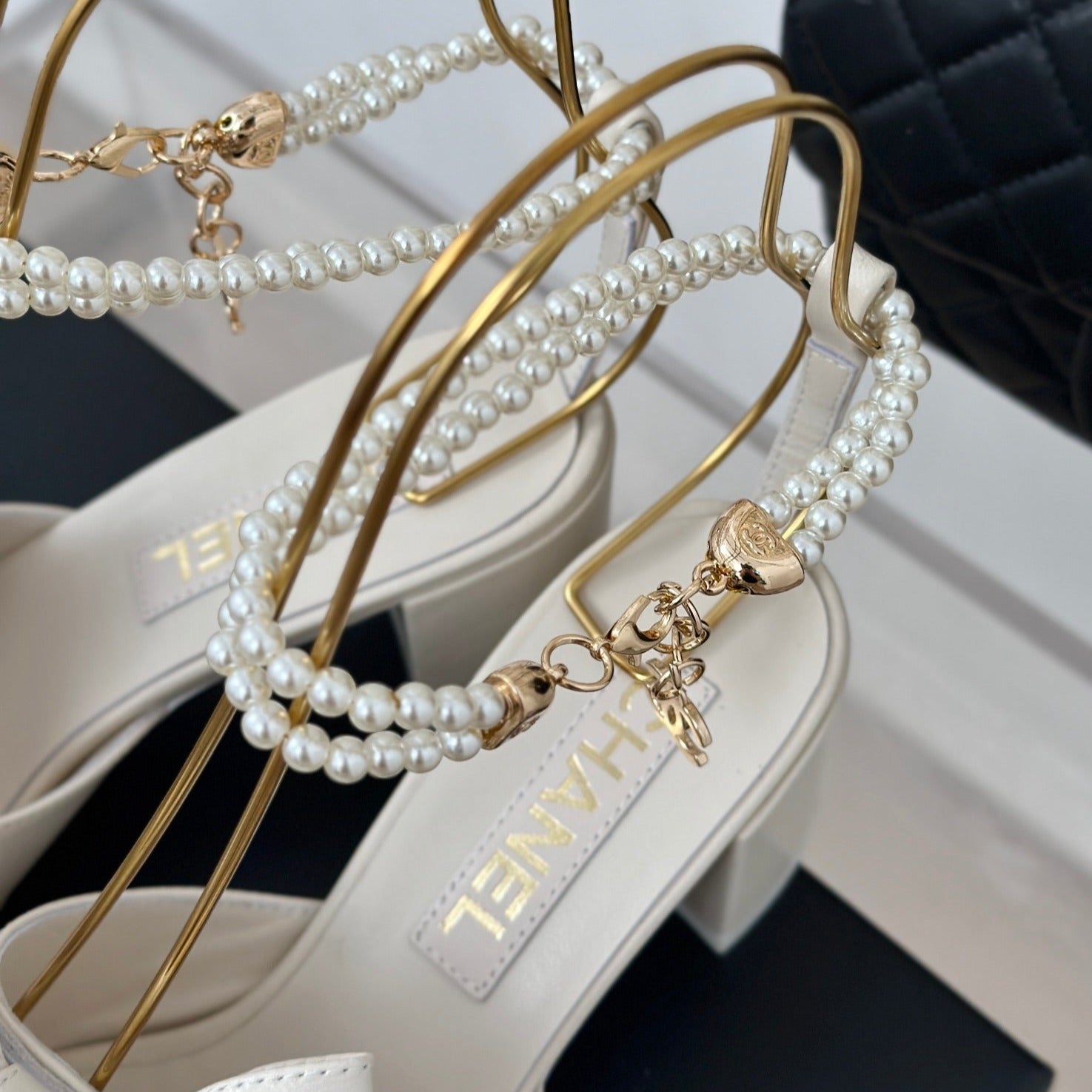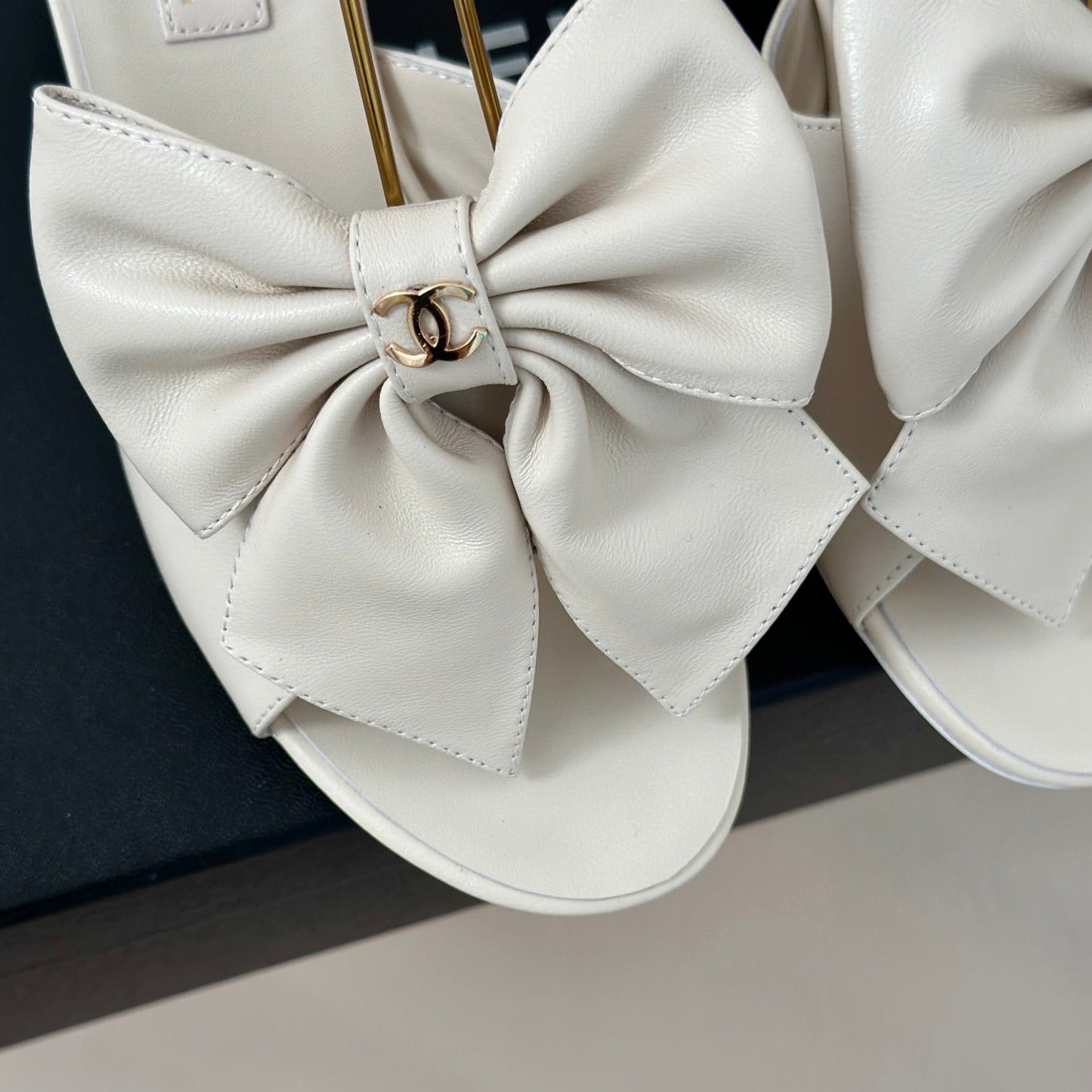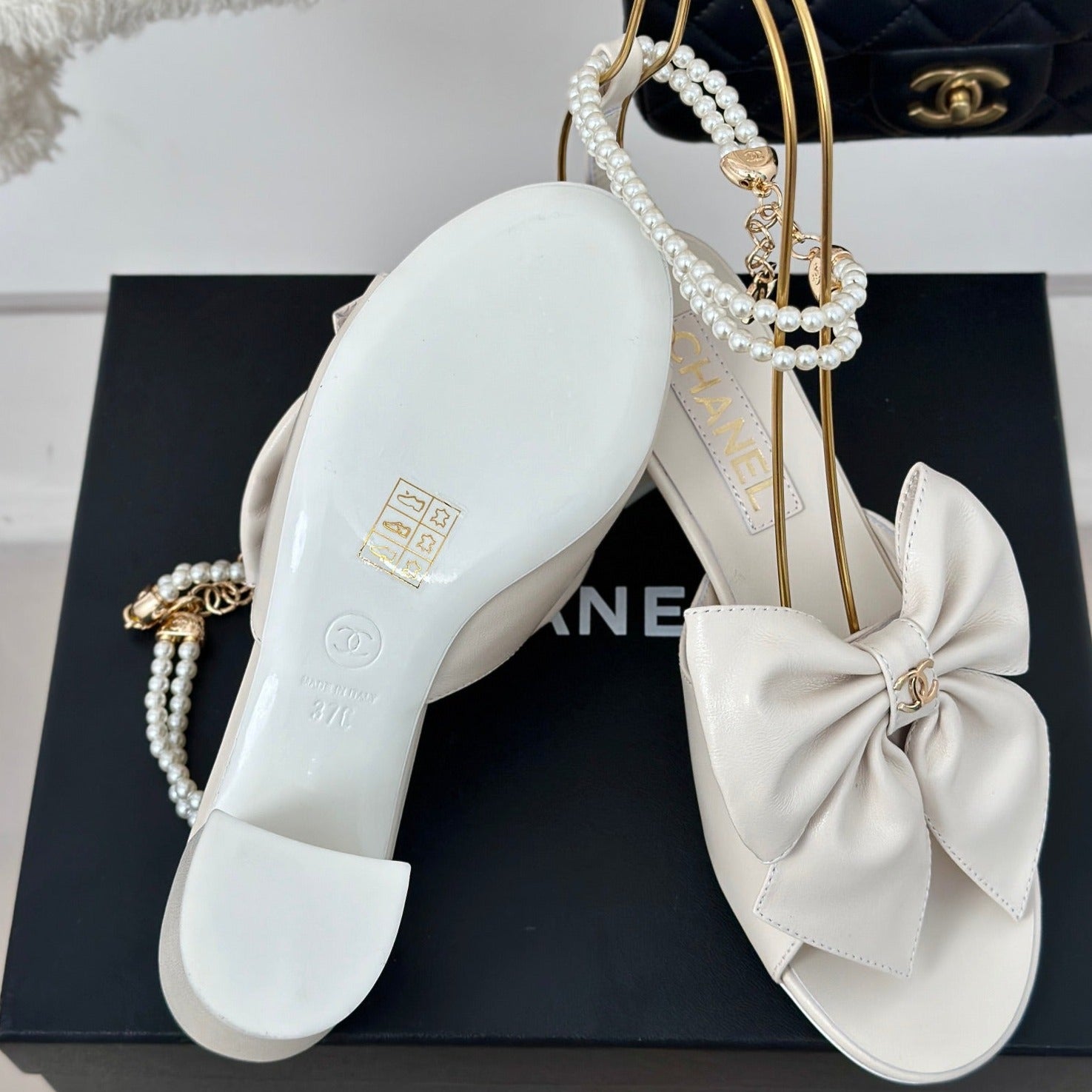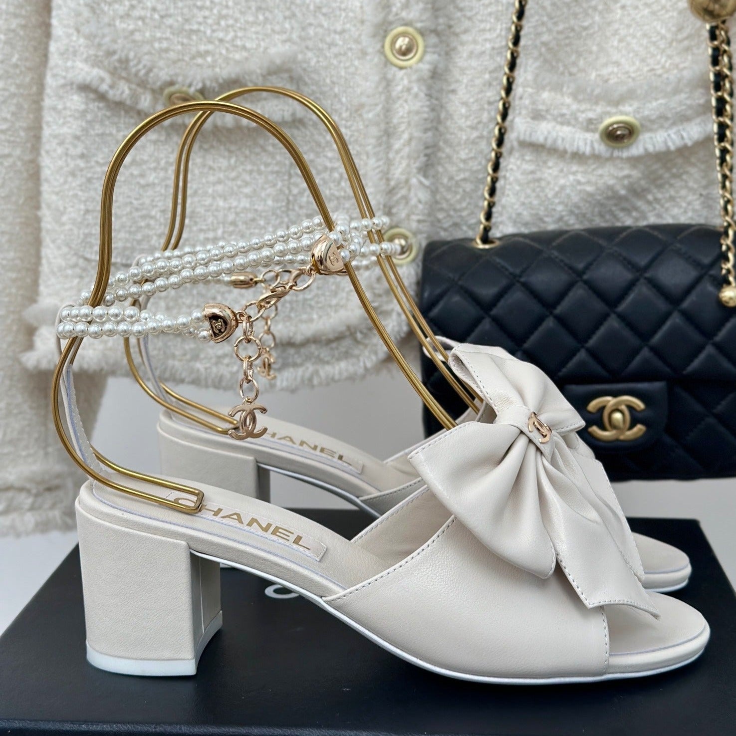 Double C Big Bow Pearl Chain High Sandals White Lambskin