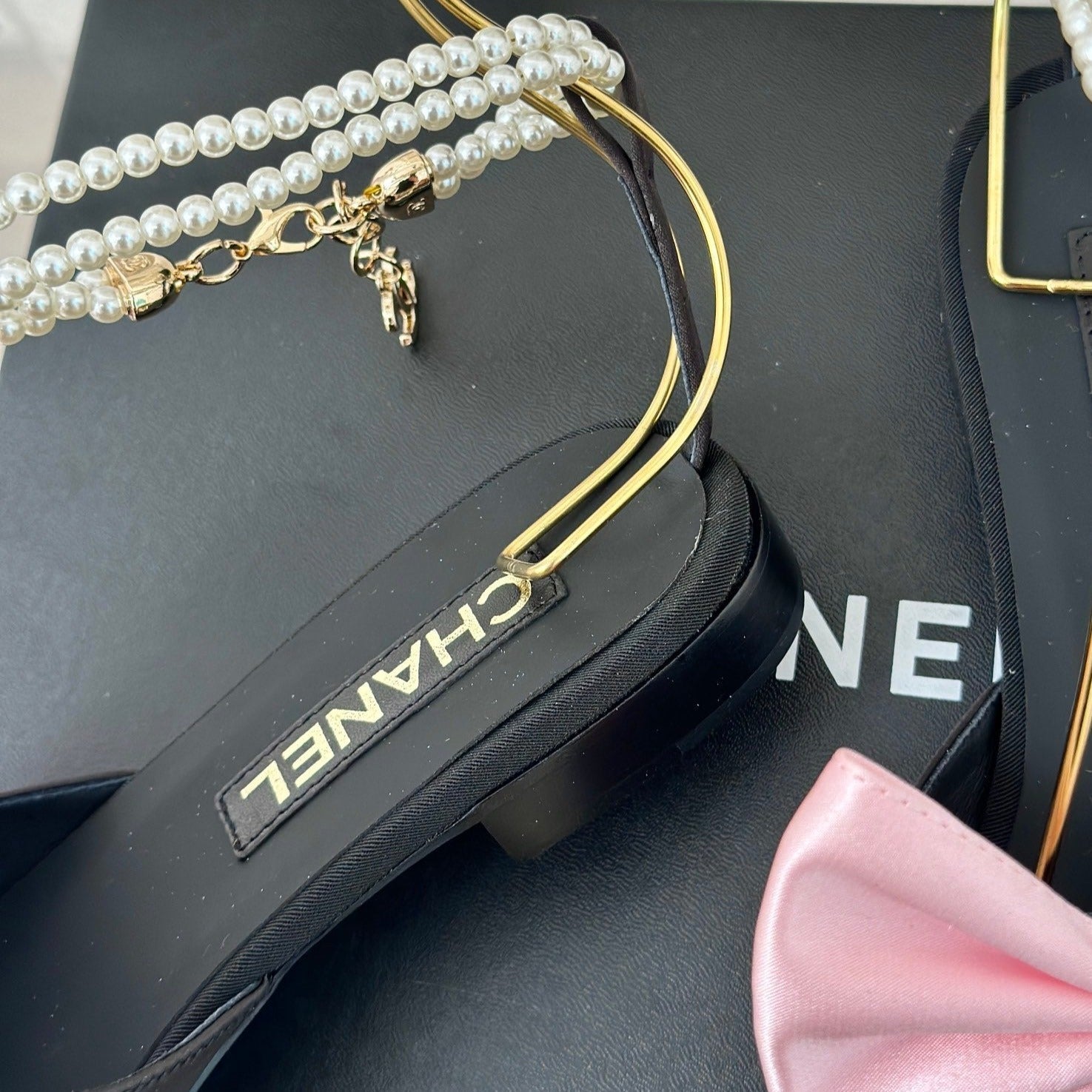 Double C Big Bow Pearl Chain Sandals Light Pink Black Lambskin