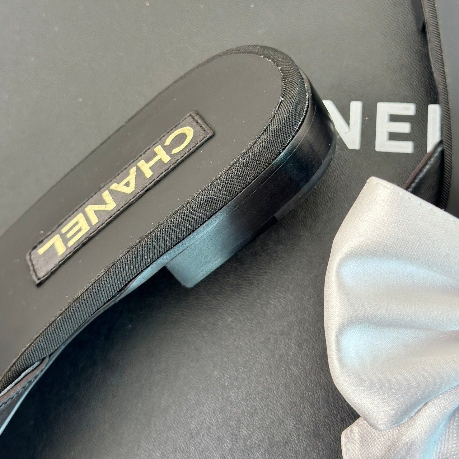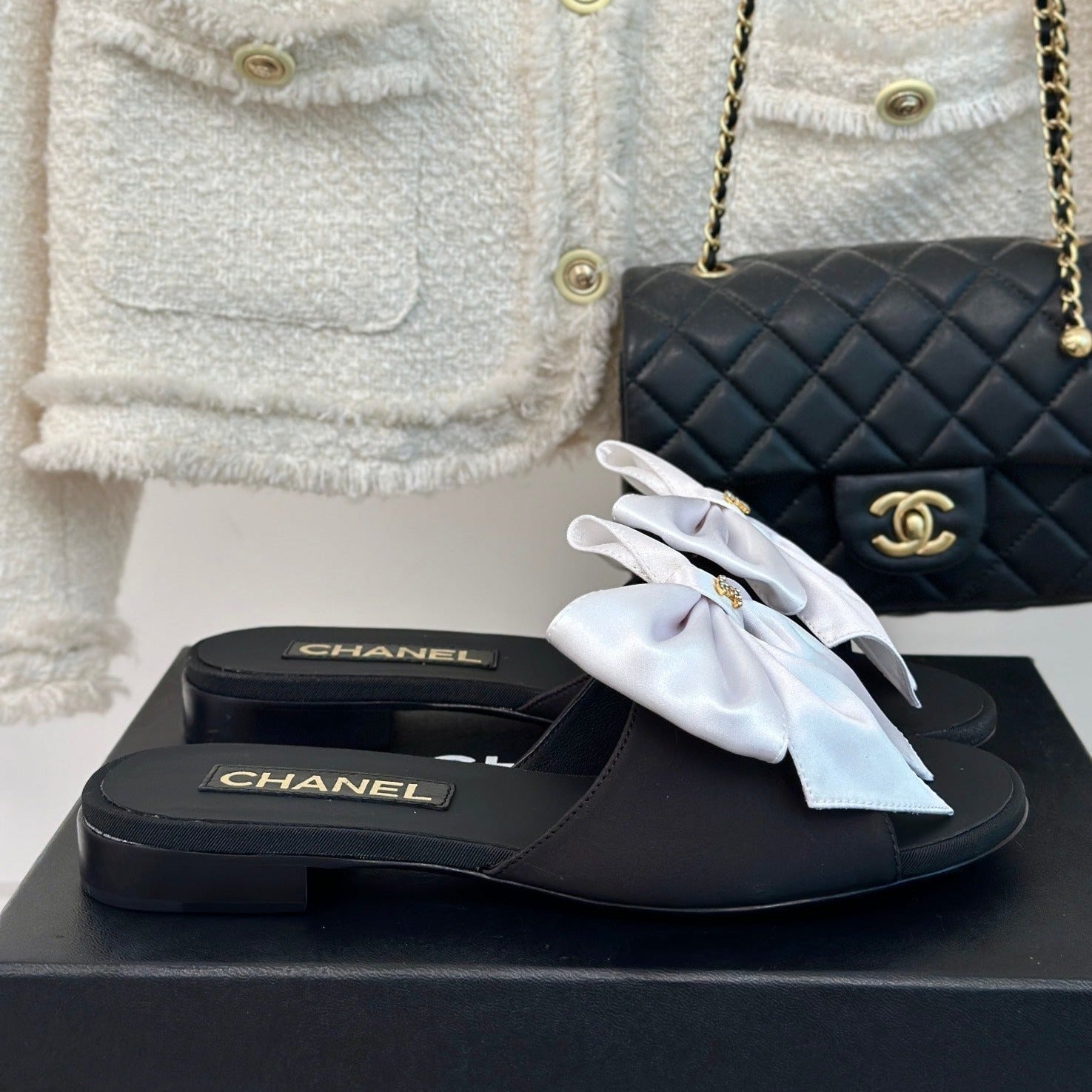 Double CC big bow flat sandals Sheepskin White Black