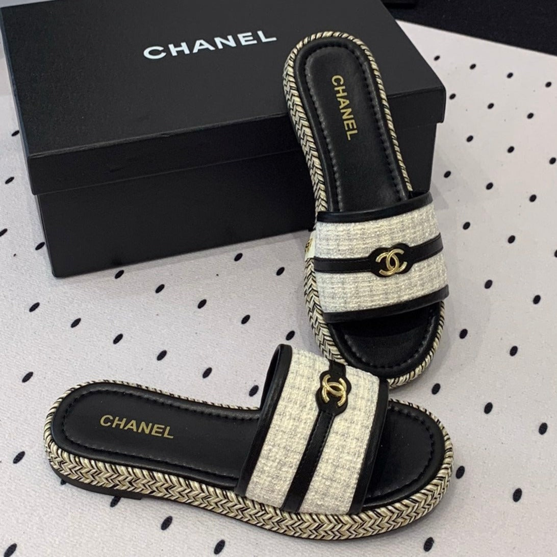 Double CC Women White Black Slippers Calfskin