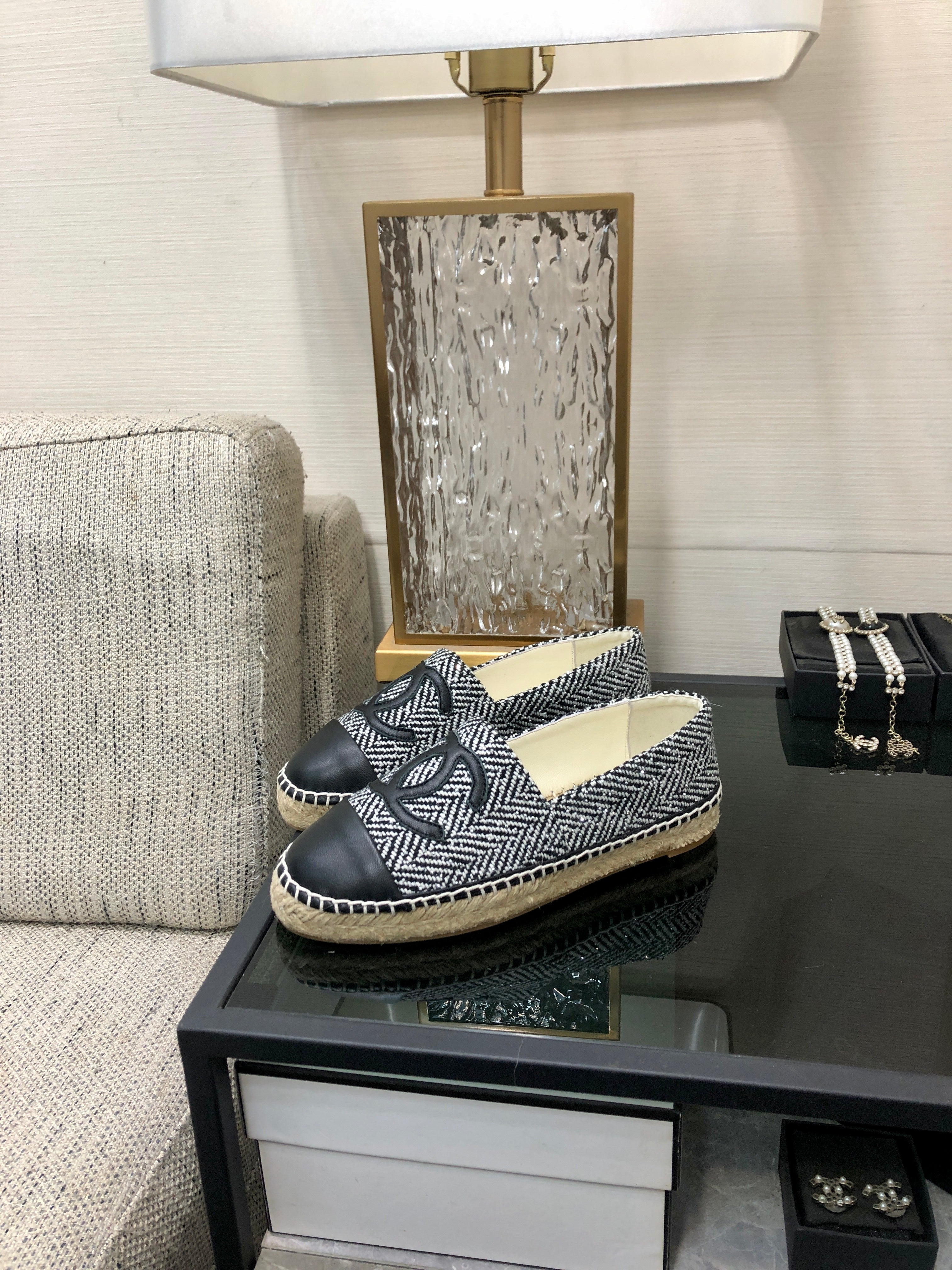ESPADRILLE BLACK MIX WHITE TWEED FABRIC AND CALFSKIN FLATS 185046