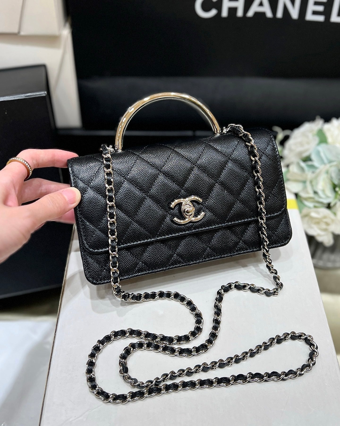 FLAP BAG WITH SILVER-TONE HANDLE 18 IN BLACK LAMBSKIN