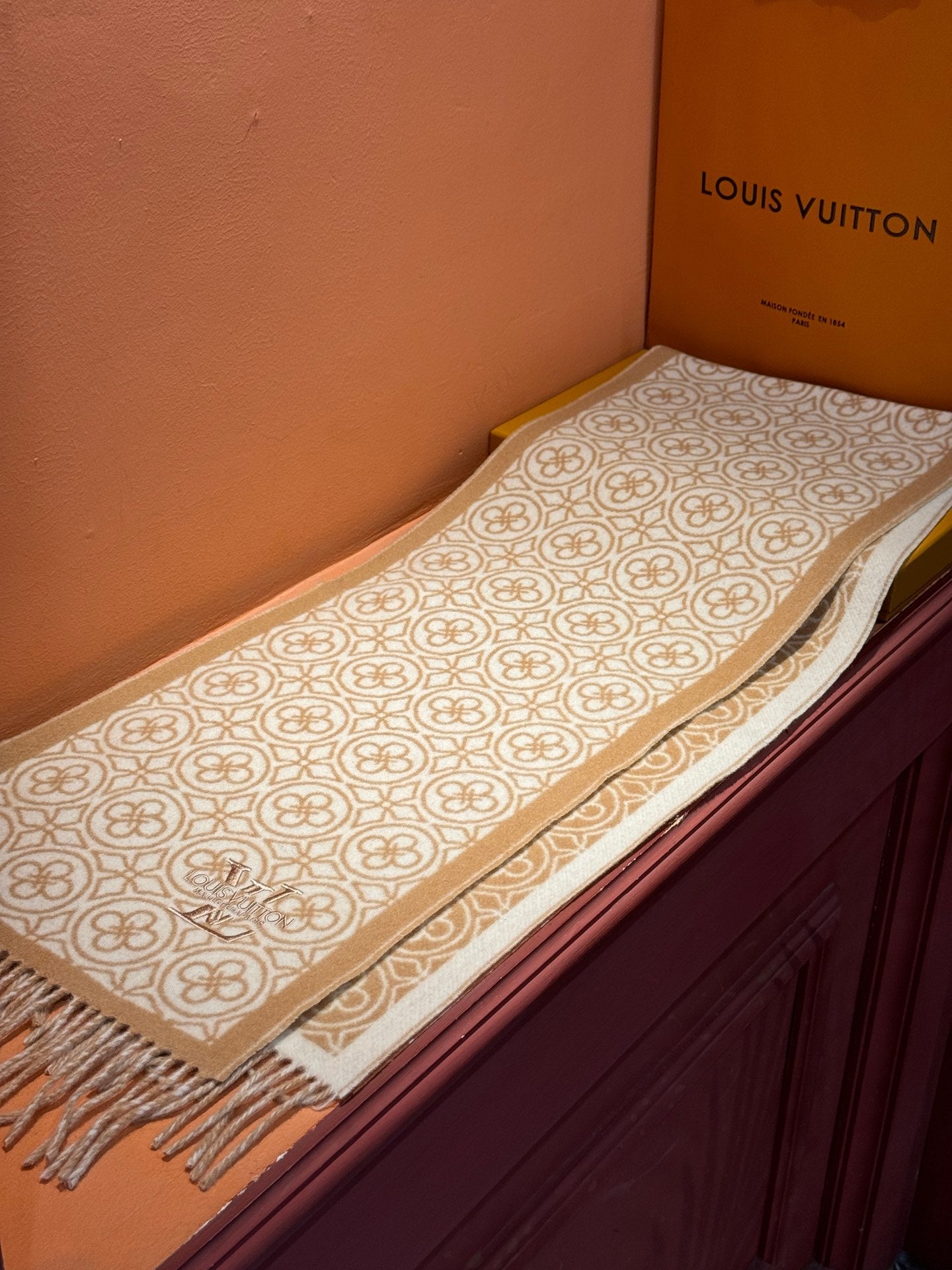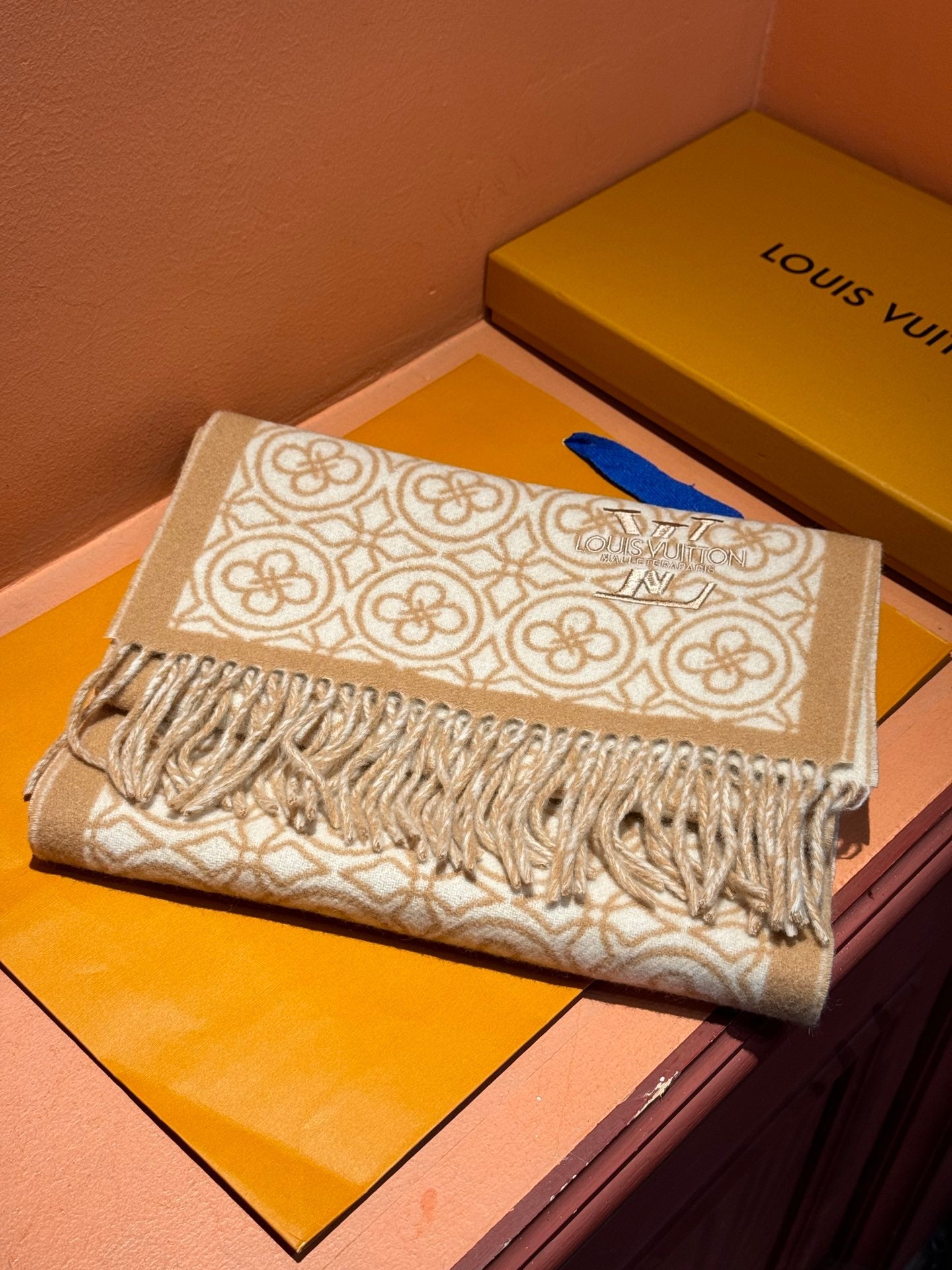 FLOWER MONOGRAM SCARF 180 CM IN TORTILLA BROWN MIX WHITE CASHMERE 388304