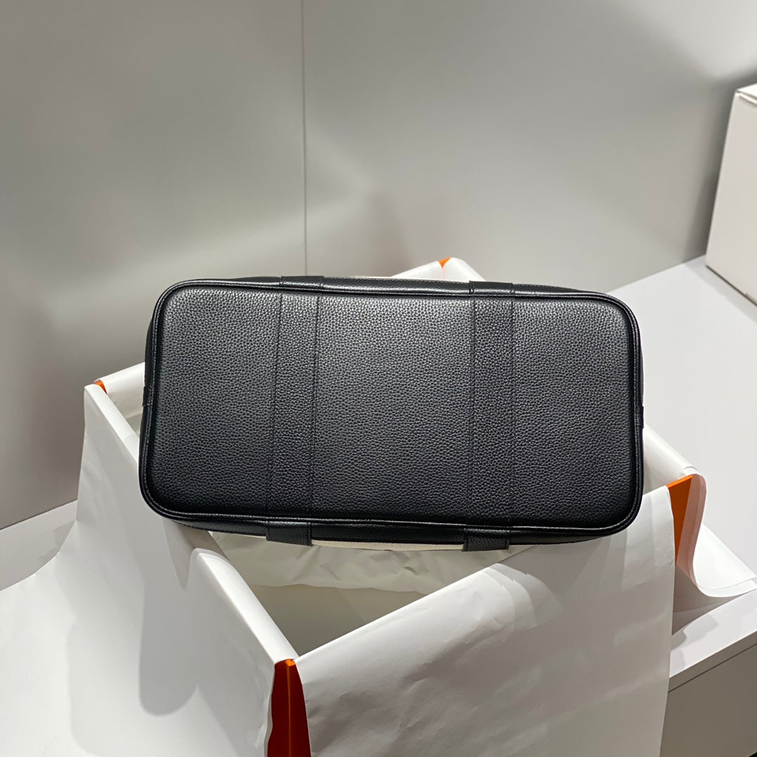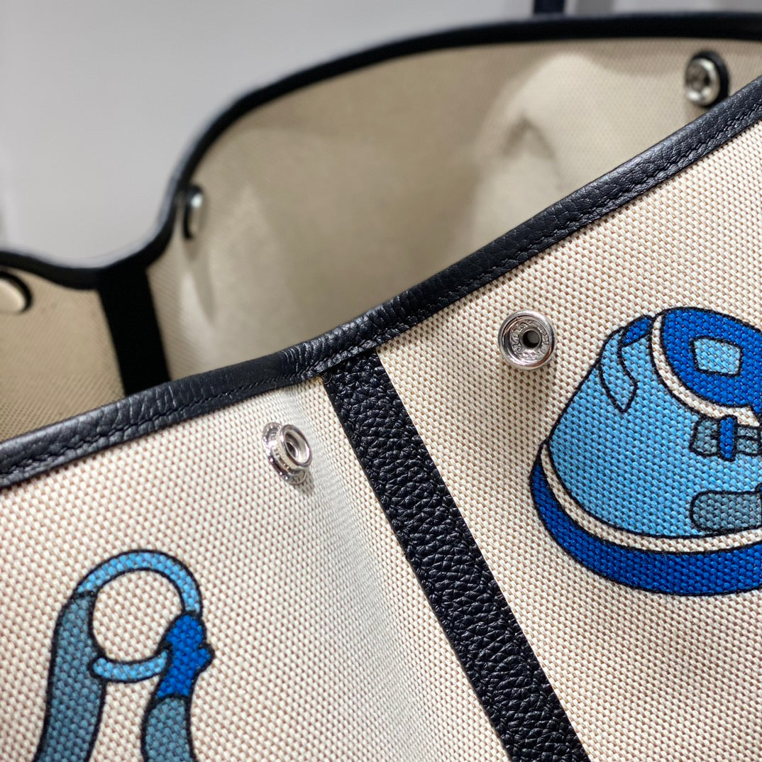 GARDEN PARTY 36 IN BLUE IVORY TOILE H CANVAS BLACK CALFSKIN EQUESTRIAN HARNESS PRINT