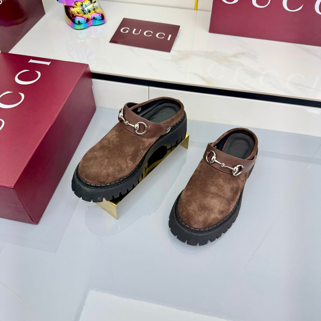 GG PLATFORM MULES 25S IN BROWN SUEDE