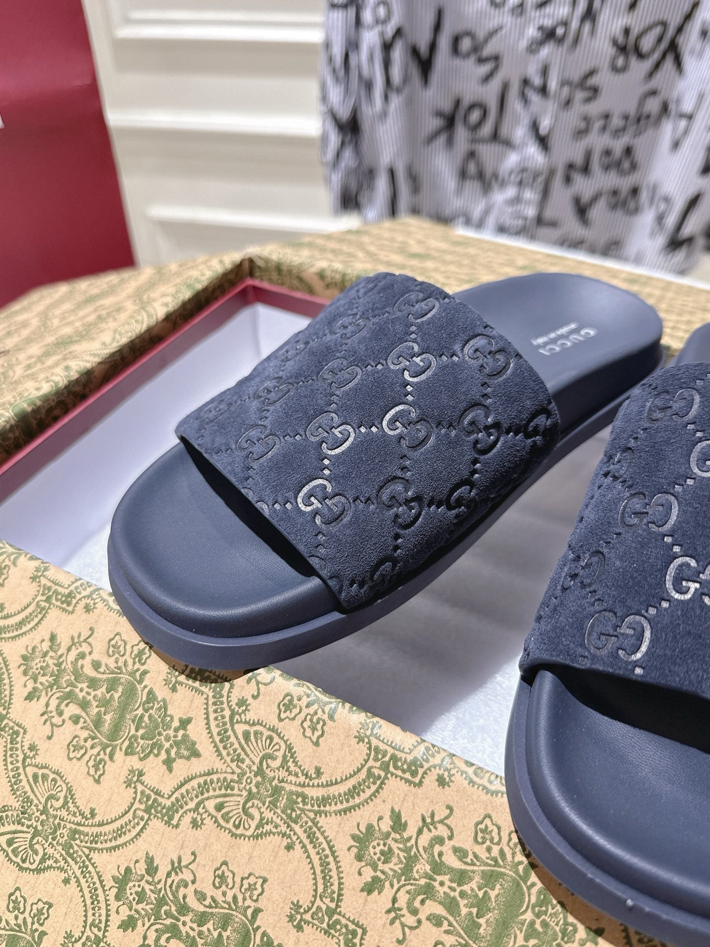 GG SLIDES IN NAVY BLUE SUEDE WITH EMBOSSED LOGO STYLE 4
