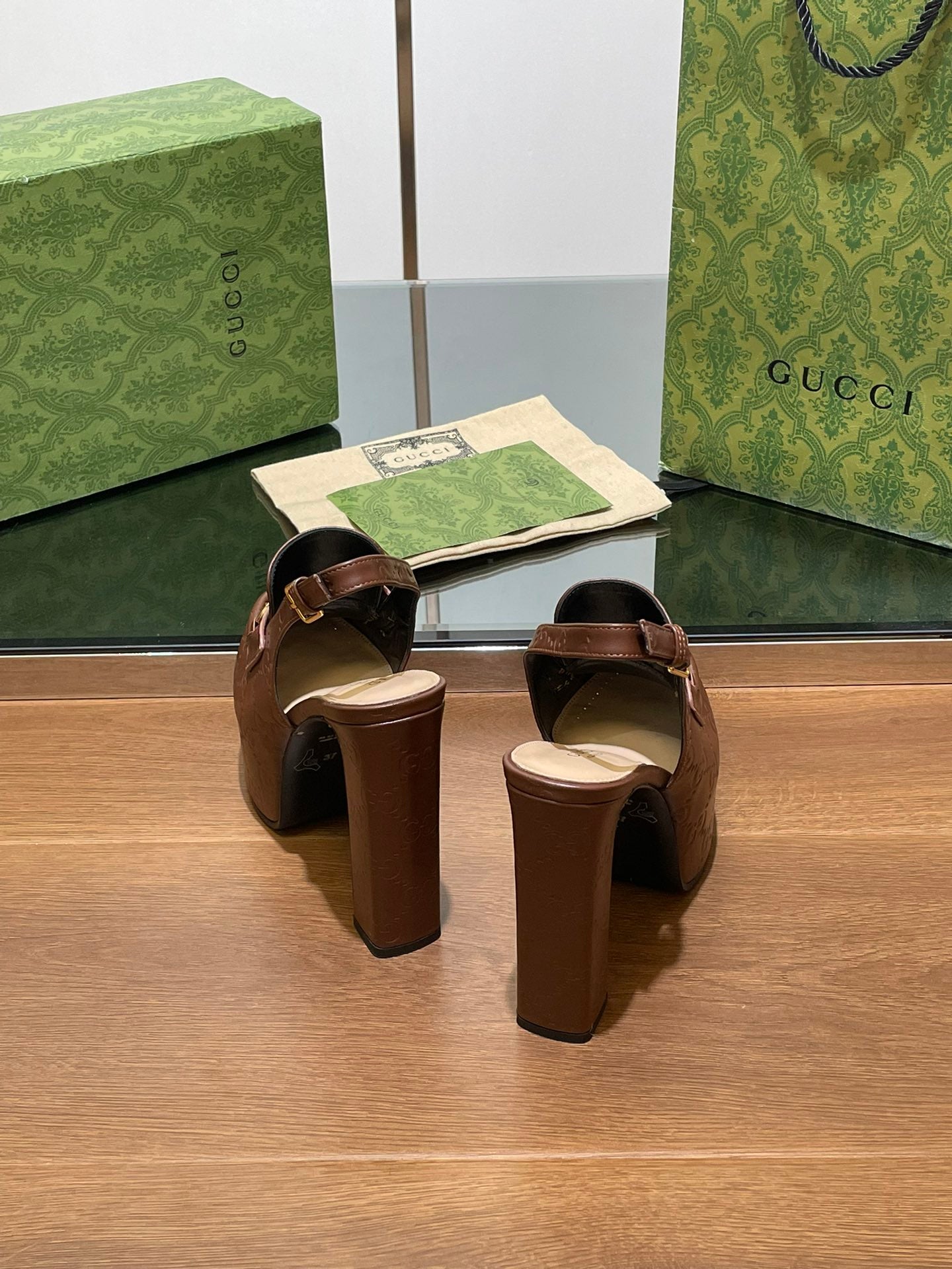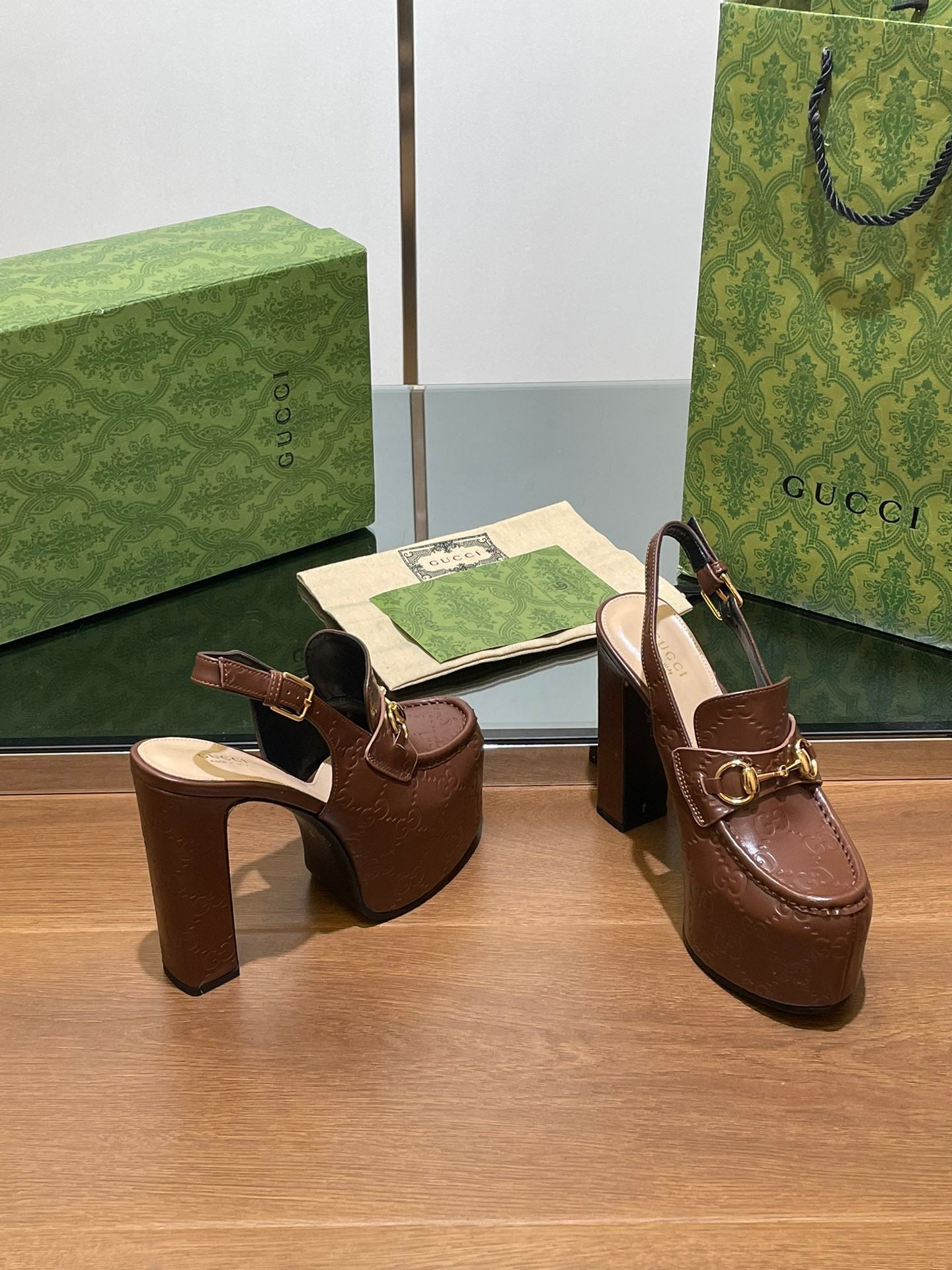 GG WOMEN'S HORSEBIT PLATFORM LOAFER SLINGBACK IN DARK BROWN EMBOSSED CALFSKIN