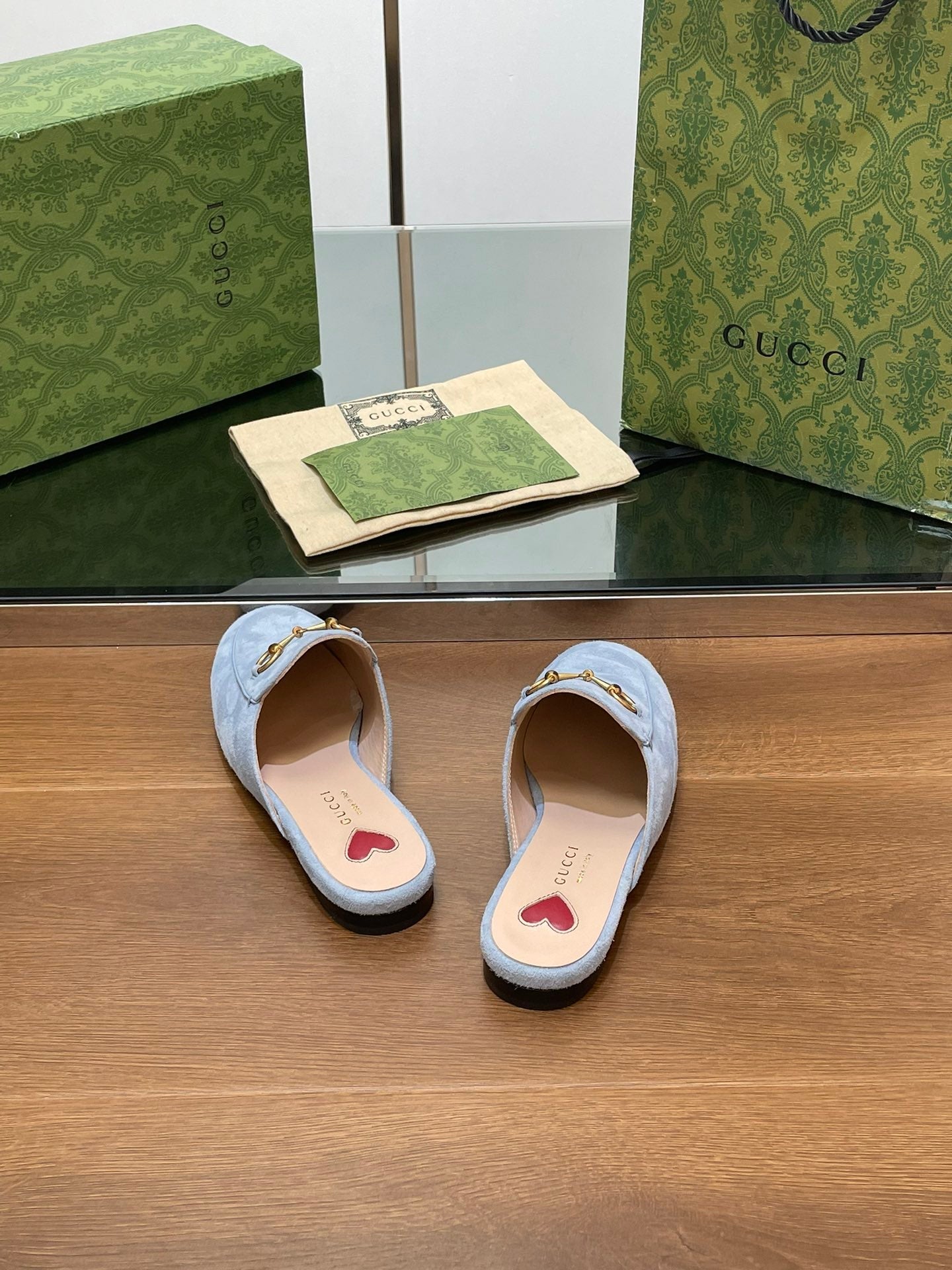 HORSEBIT MULE IN LIGHT BLUE SUEDE WITH GOLD HARDWARE