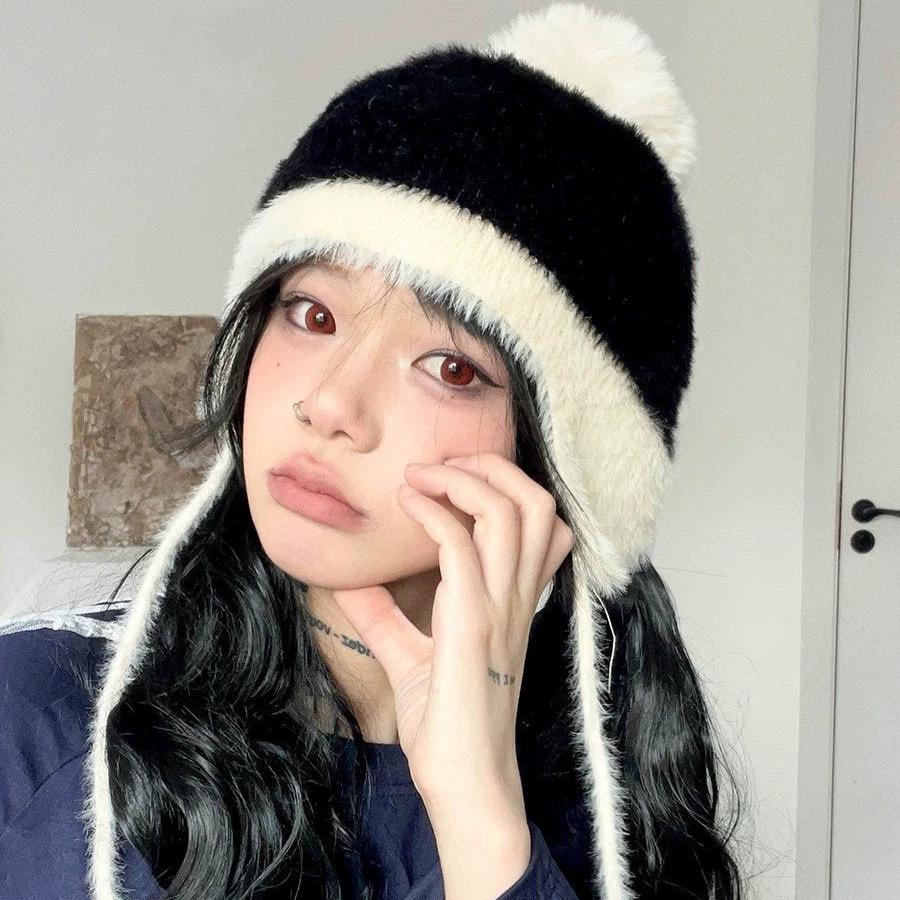 • Sweet girl-style knit hat for women with contrasting colors, ear covers, and a cute pom-pom. Cozy knit design for fall and winter with tie straps, keeping you warm while giving a face-slimming effect.