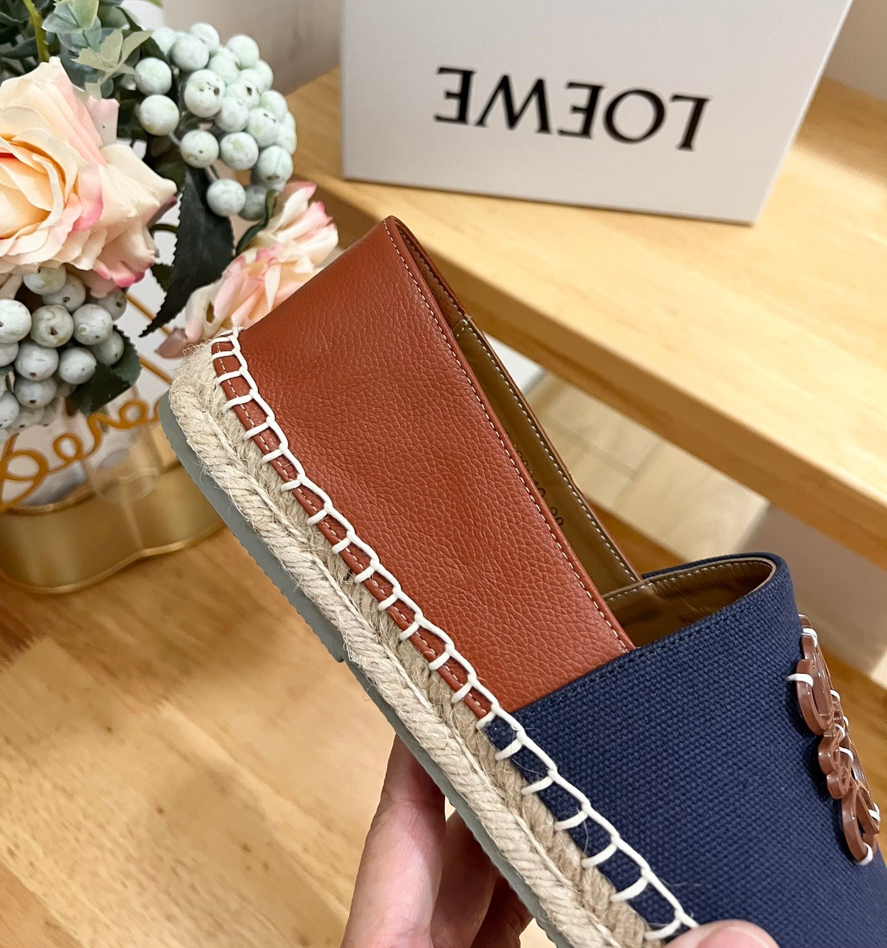 Loew Anagram Espadrille Denim Brown Leather and Canvas