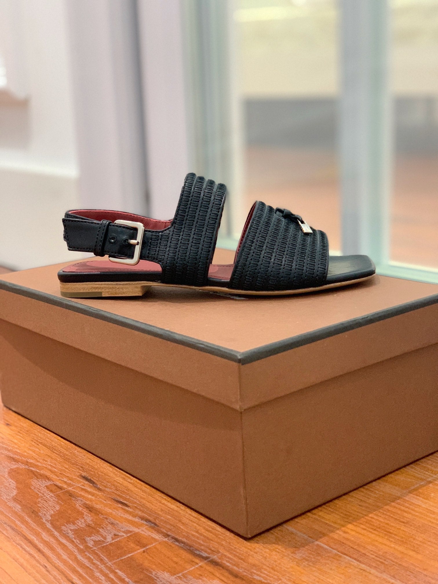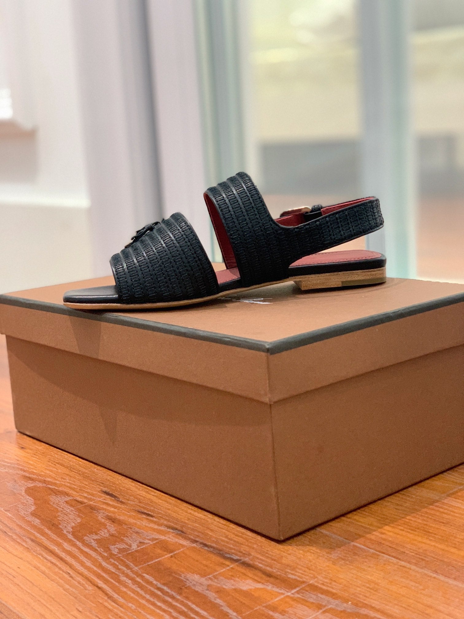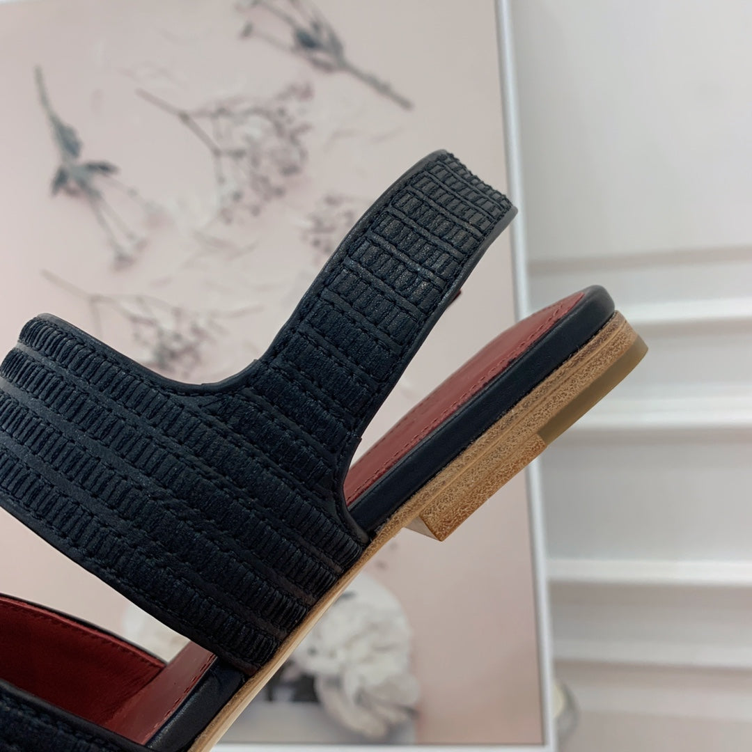 LP RAFFIA CHARMS STRAP FLATS SANDAL BLACK CALFSKIN