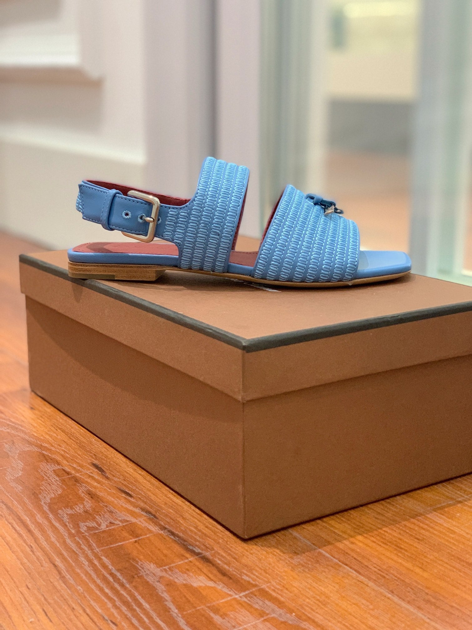LP RAFFIA CHARMS STRAP FLATS SANDAL SKY CALFSKIN
