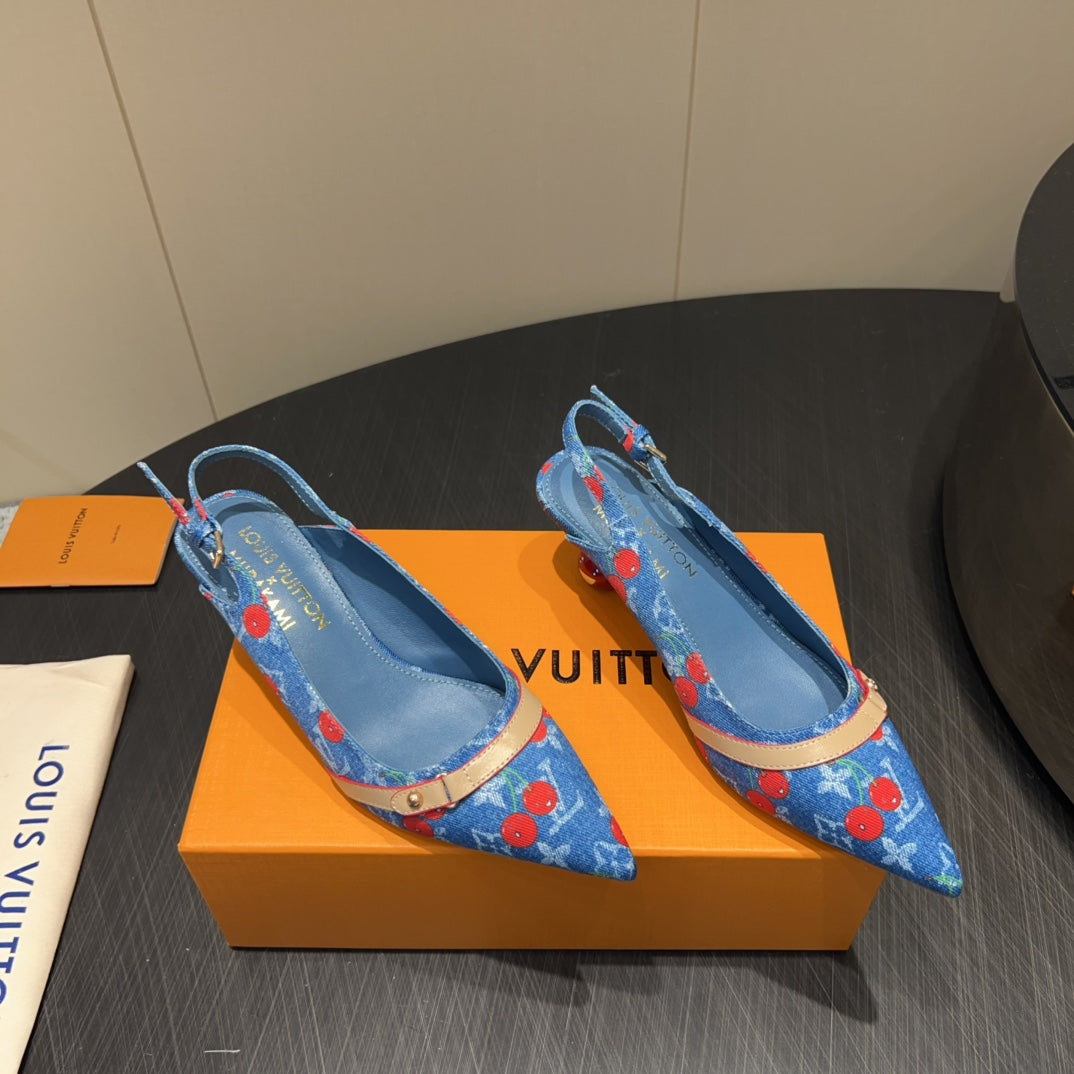 LV HIGH SLINGBACK LOGO AND CHERRY PRINT 25S 55MM IN BLUE DENIM