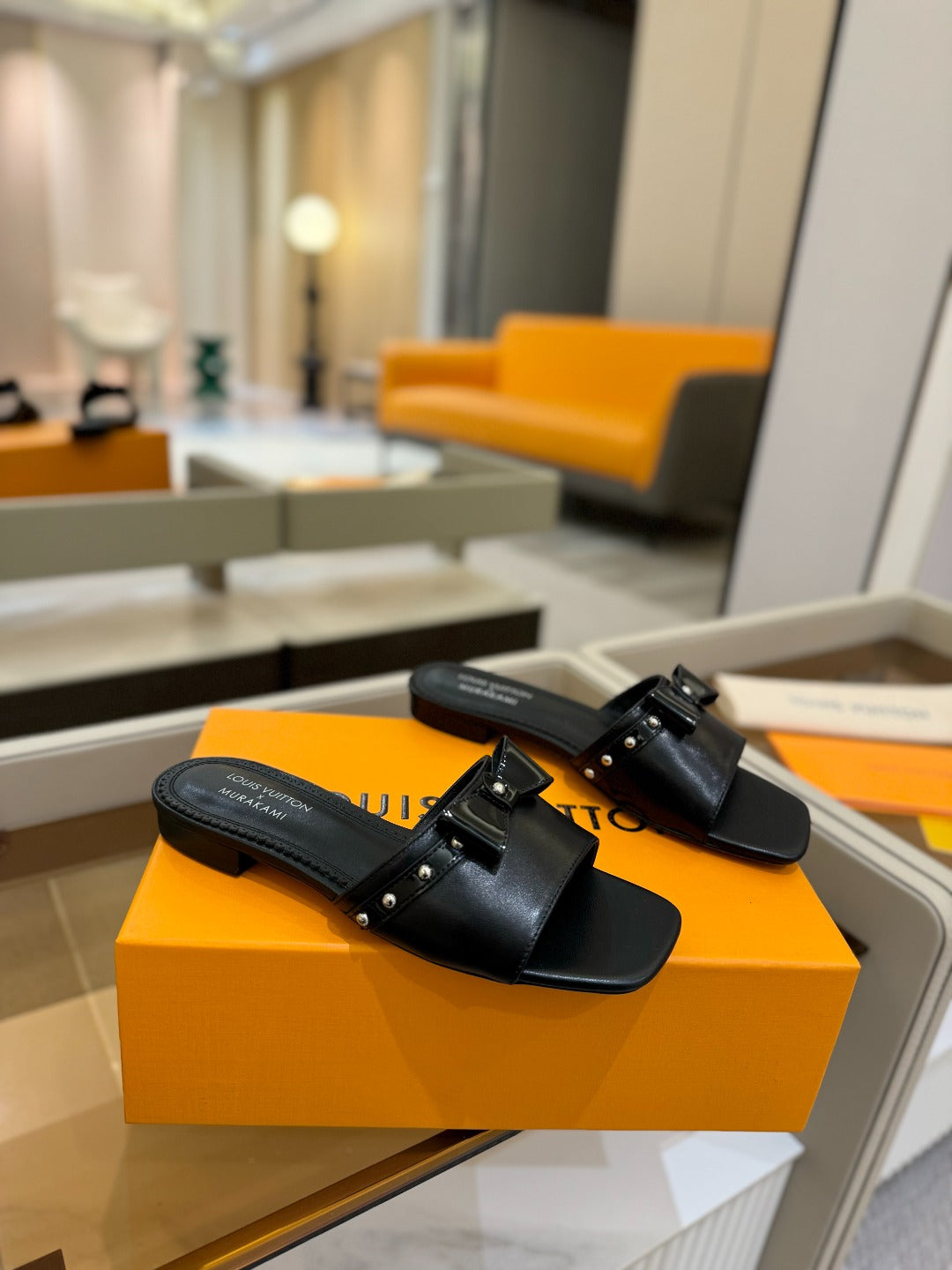LV X TM 6AM FLAT MULE IN BLACK CALFSKIN