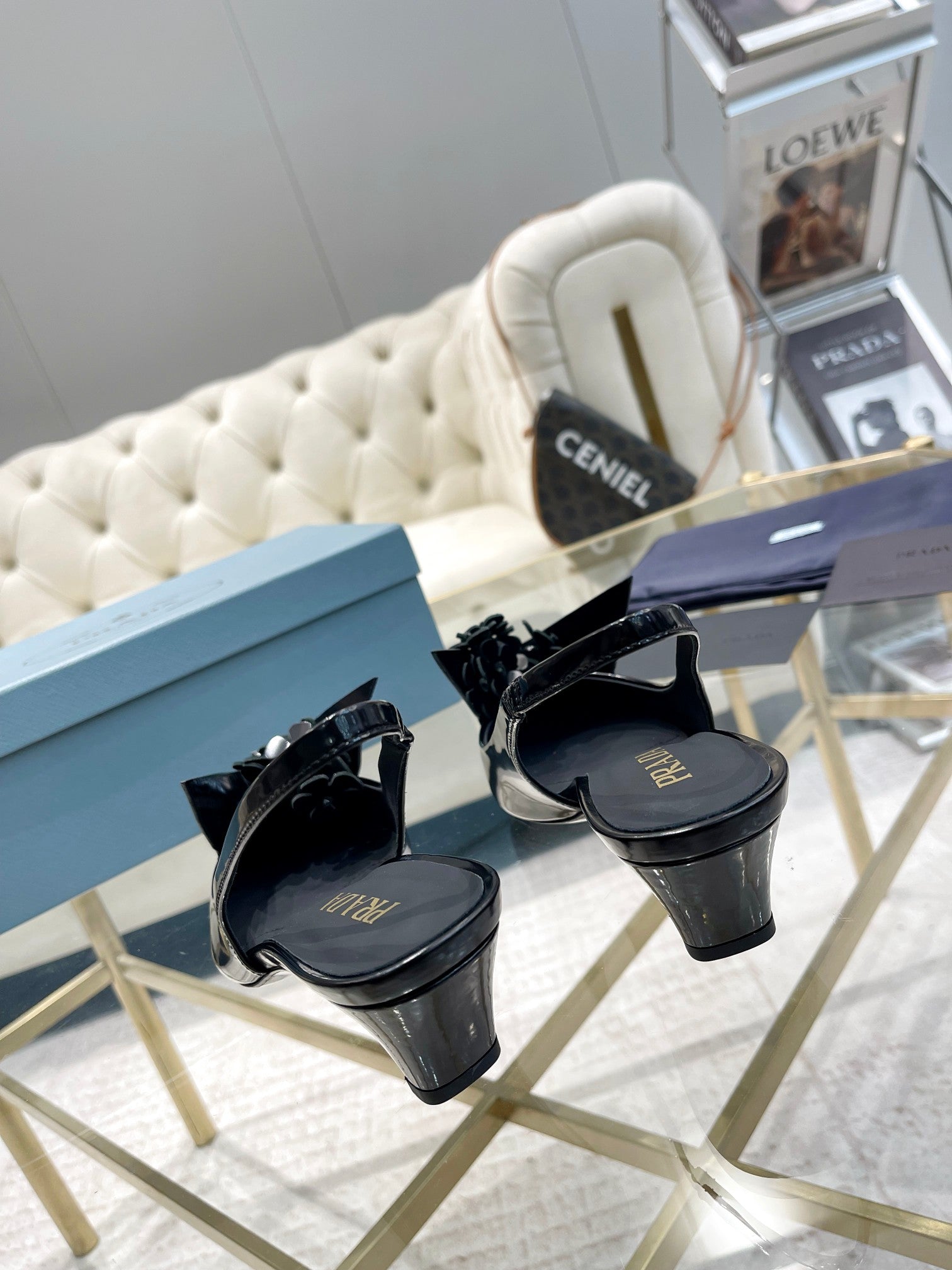 MEDIUM HEEL SLINGBACK ATTACHED CREATIVE FLOWERS IN BLACK PATENT CALFSKIN