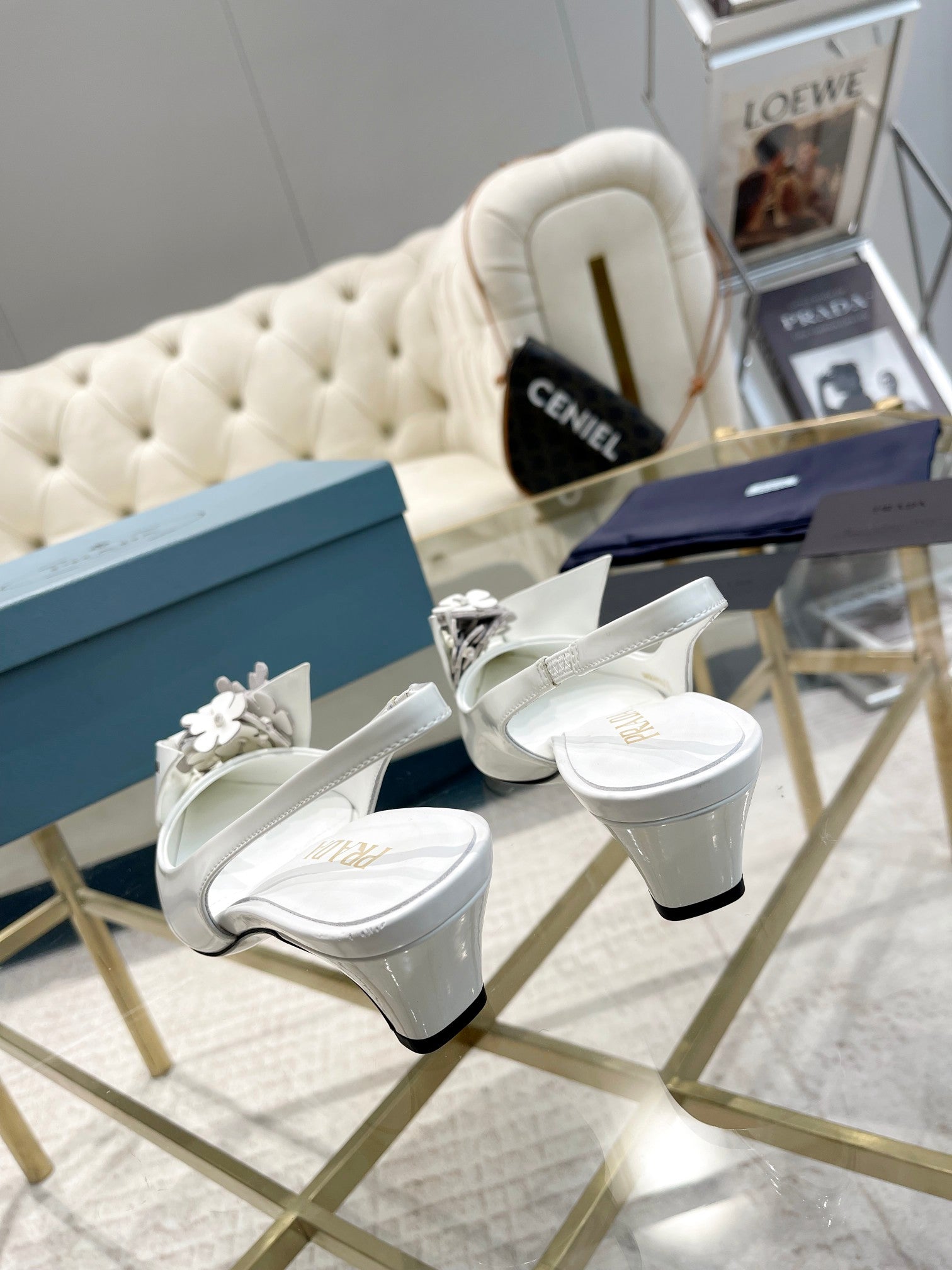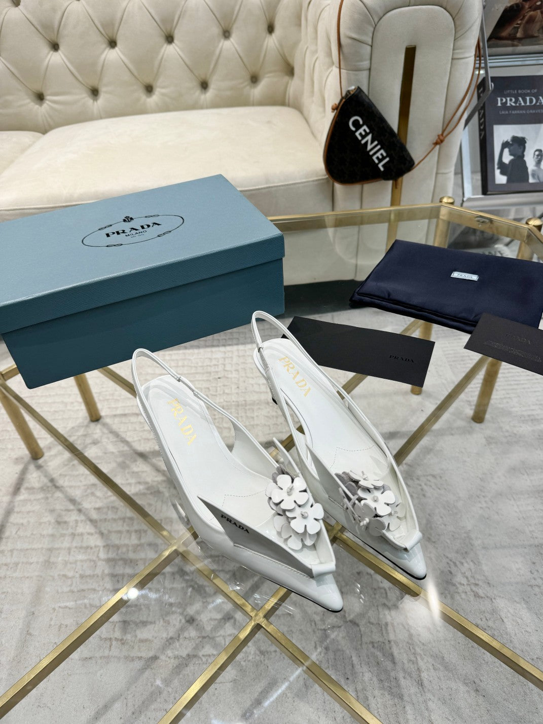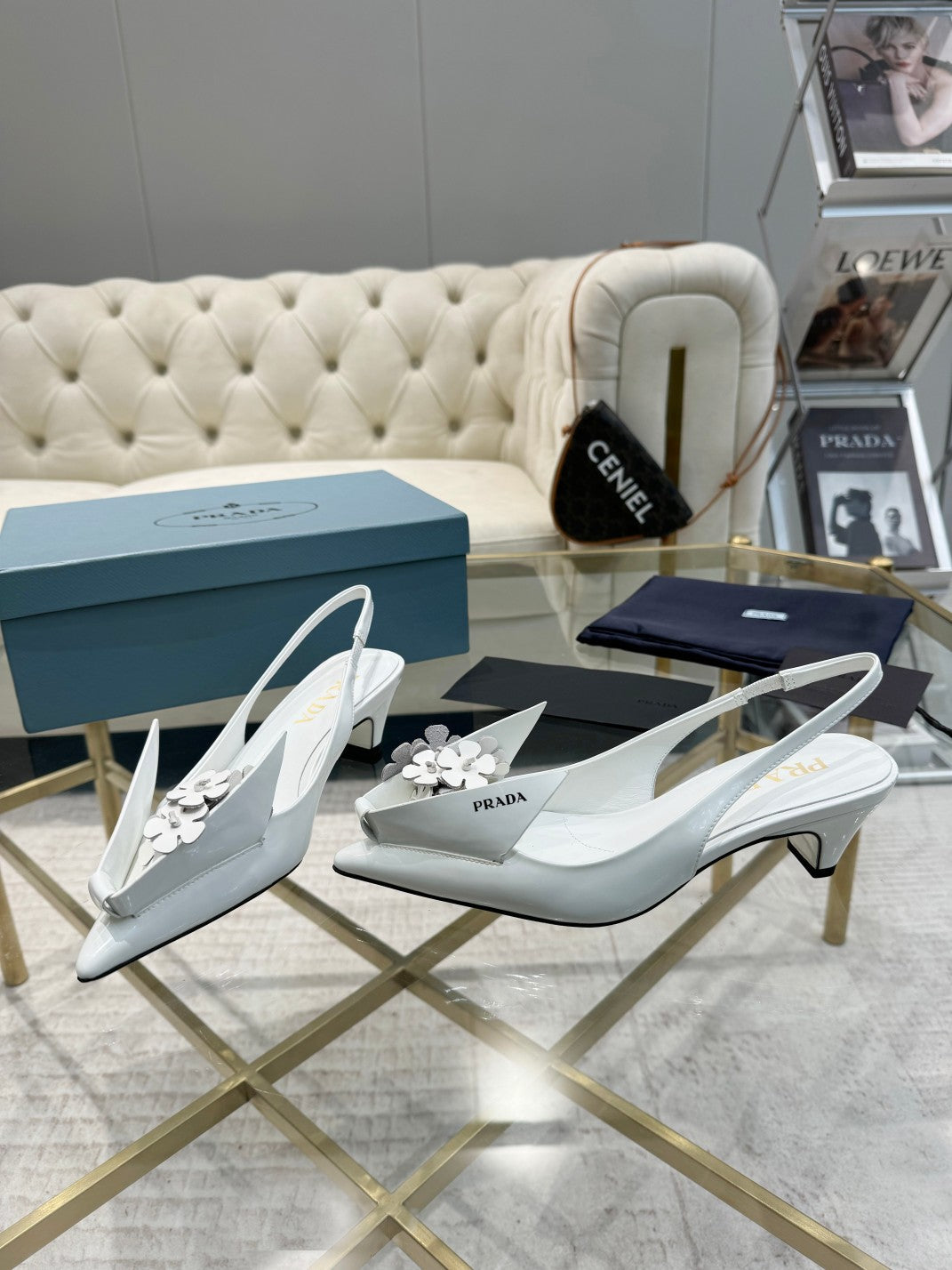 MEDIUM HEEL SLINGBACK ATTACHED CREATIVE FLOWERS IN WHITE PATENT CALFSKIN