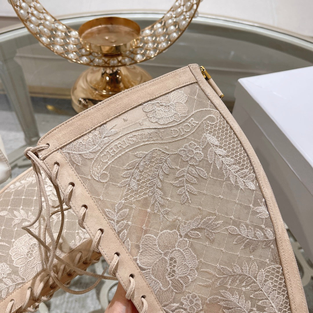 NAUGHTILY-D BOOT NUDE BEIGE TRANSPARENT MESH AND SUEDE EMBROIDERED WITH ROSES MOTIF 35 MM