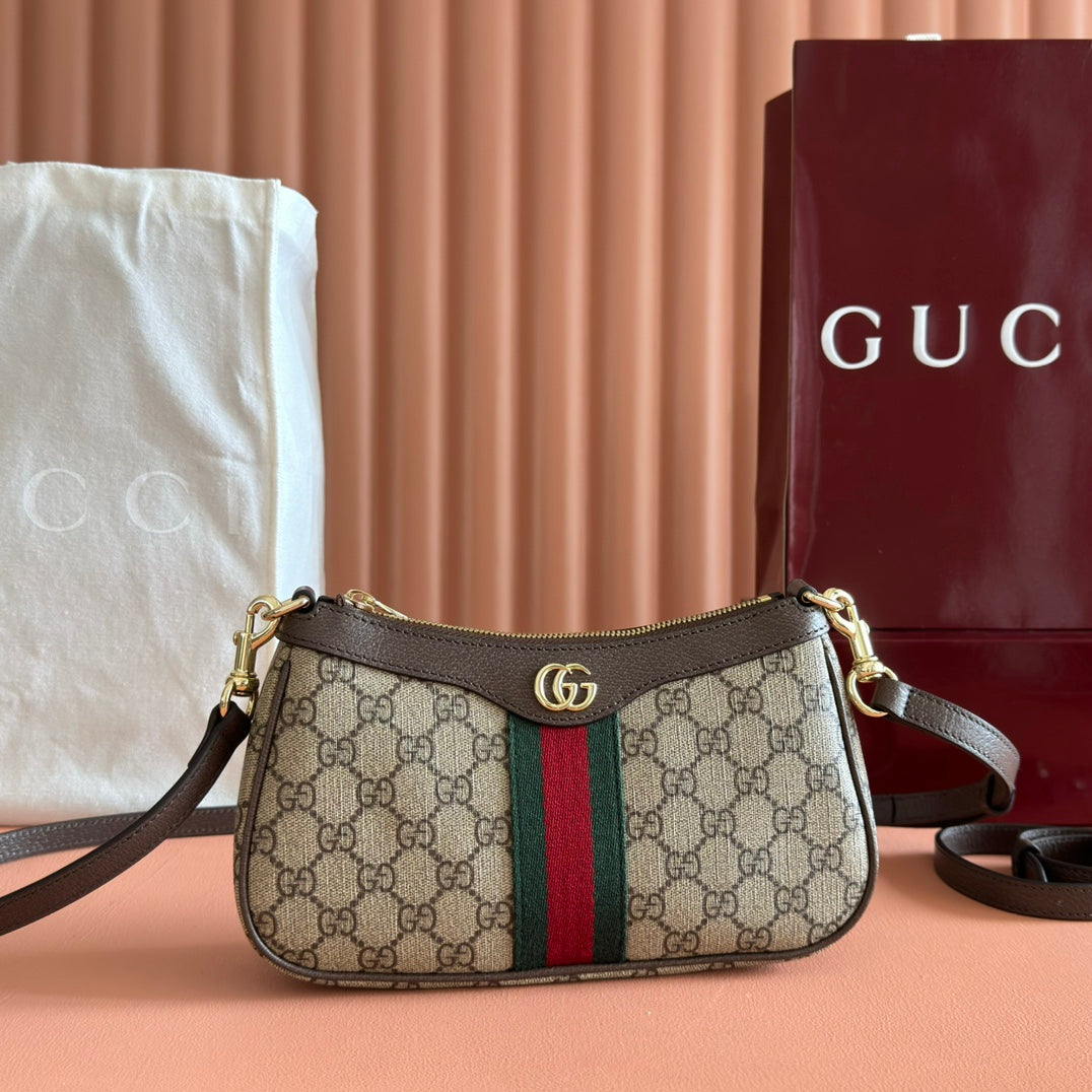 OPHIDIA SMALL SHOULDER BAG 26 IN BEIGE AND DARK BROWN CANVAS