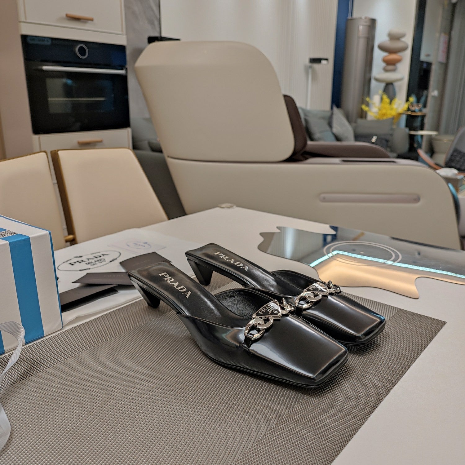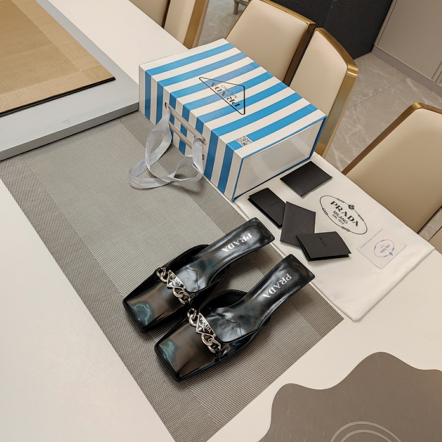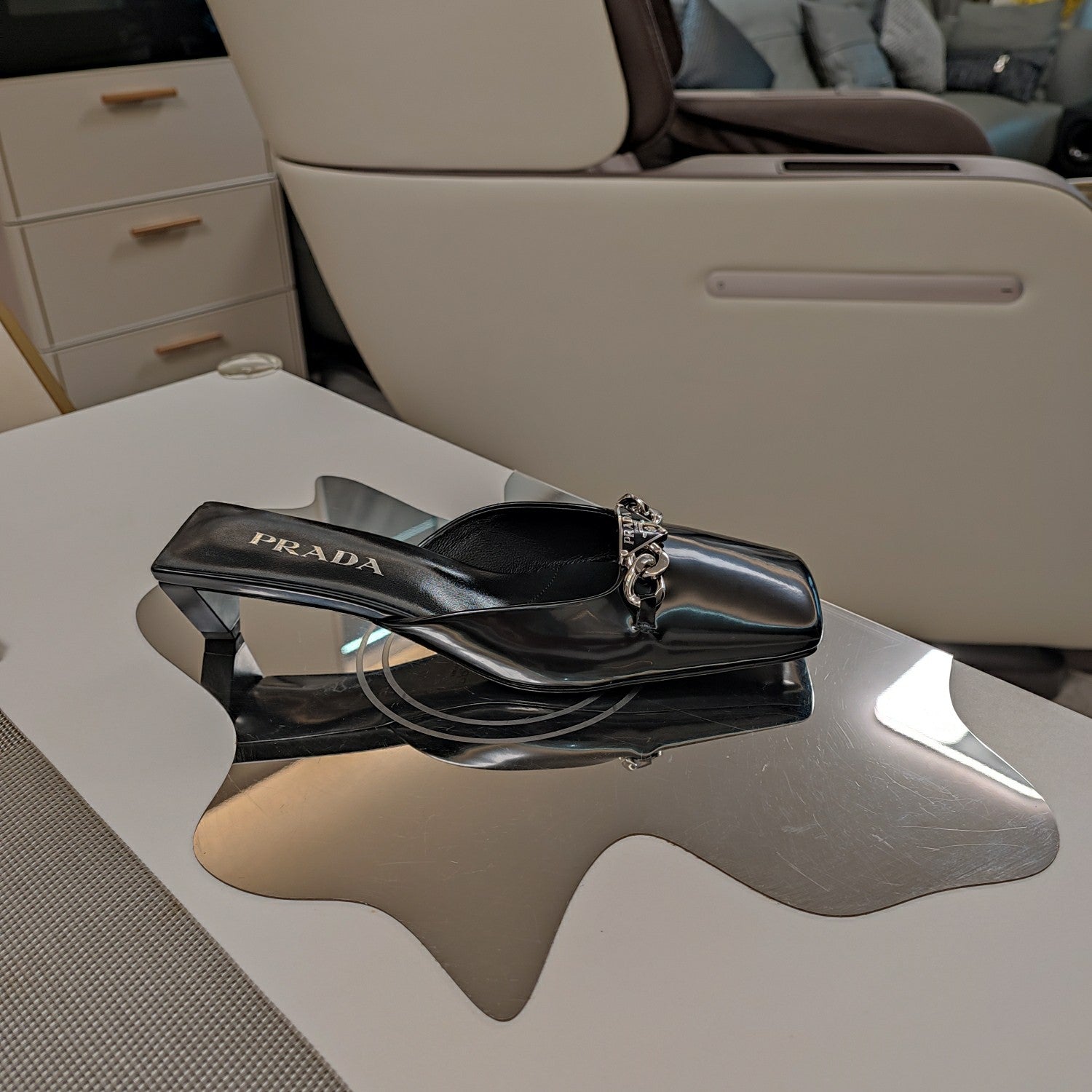 PRA SQUARE TOE MULES BLACK CALFSKIN WITH CHAIN