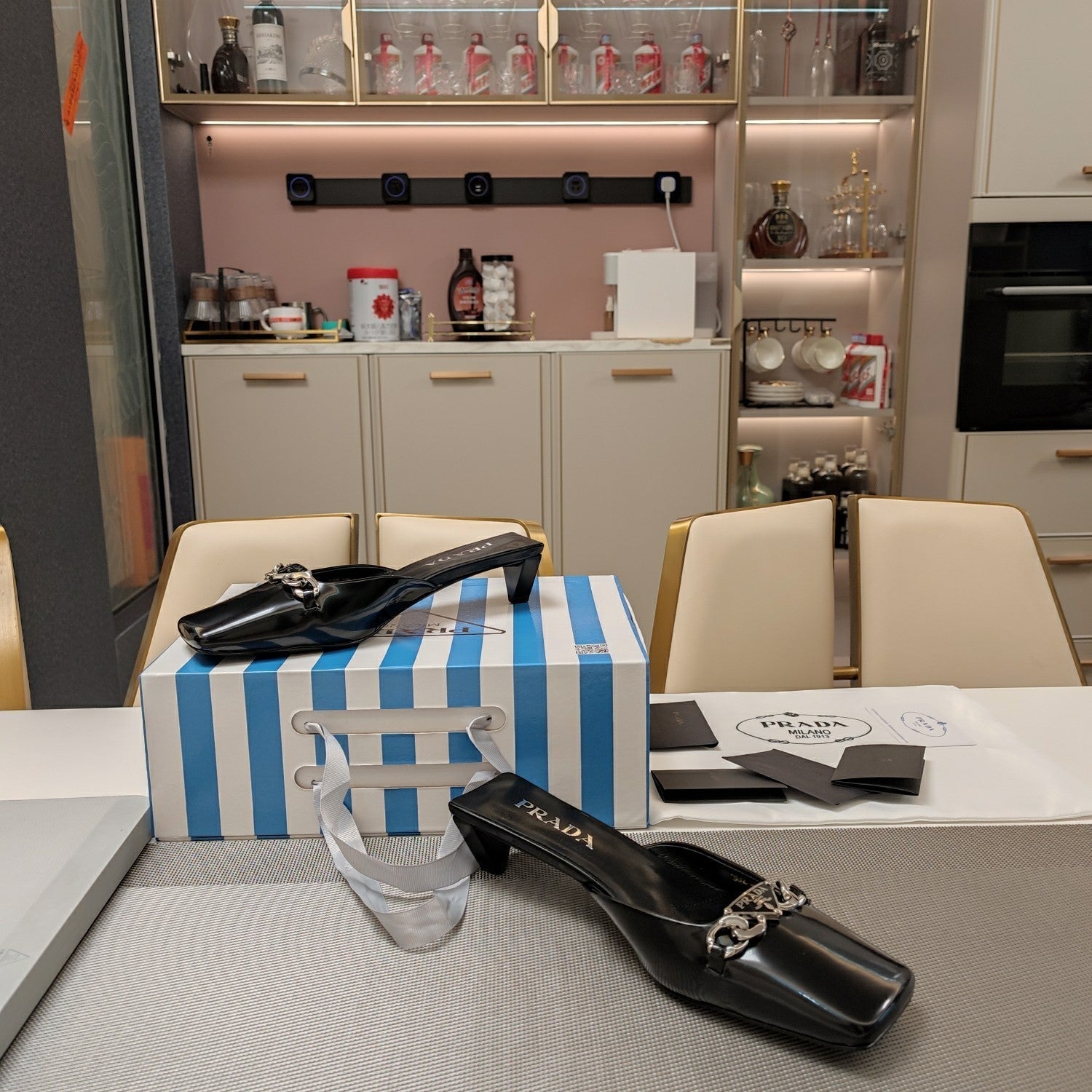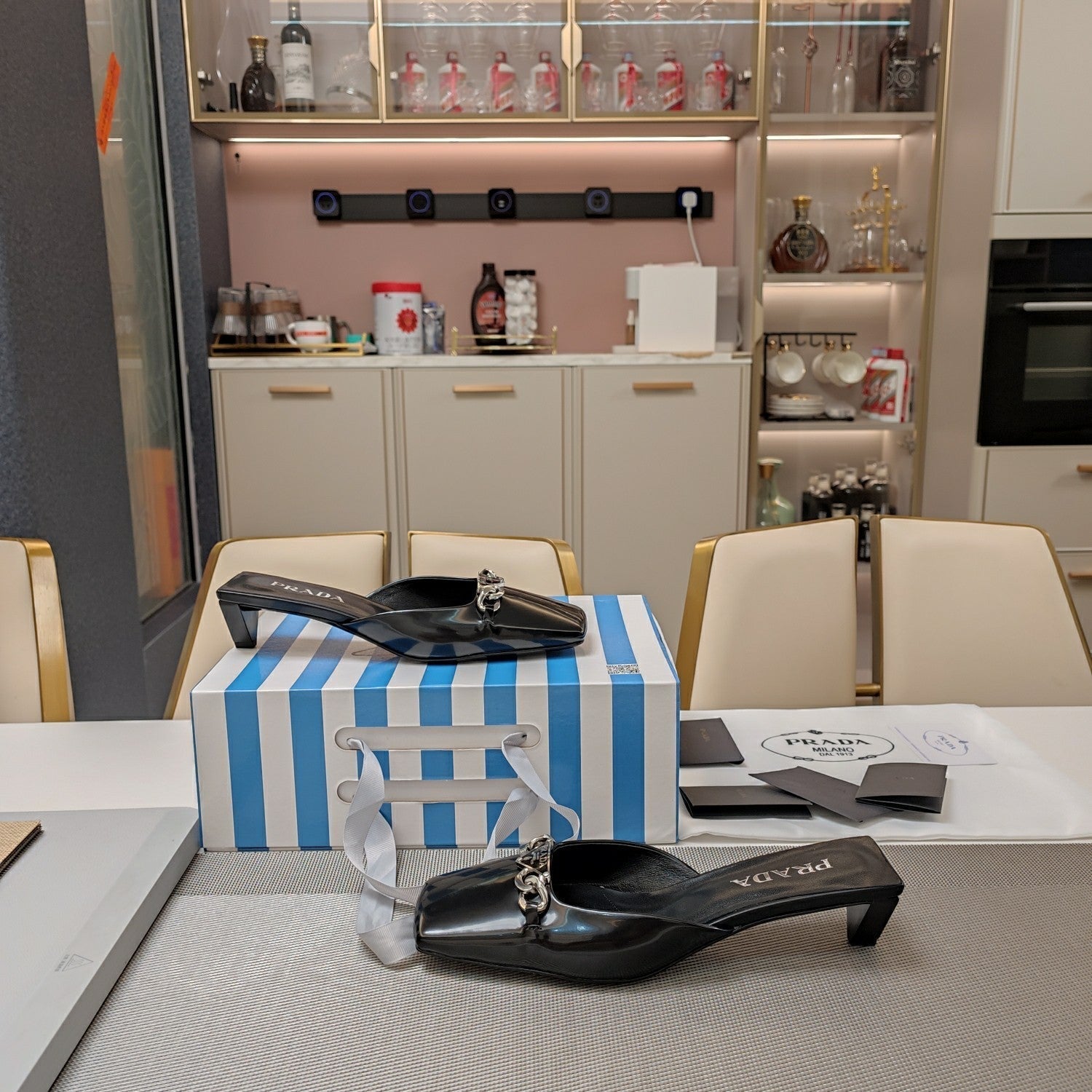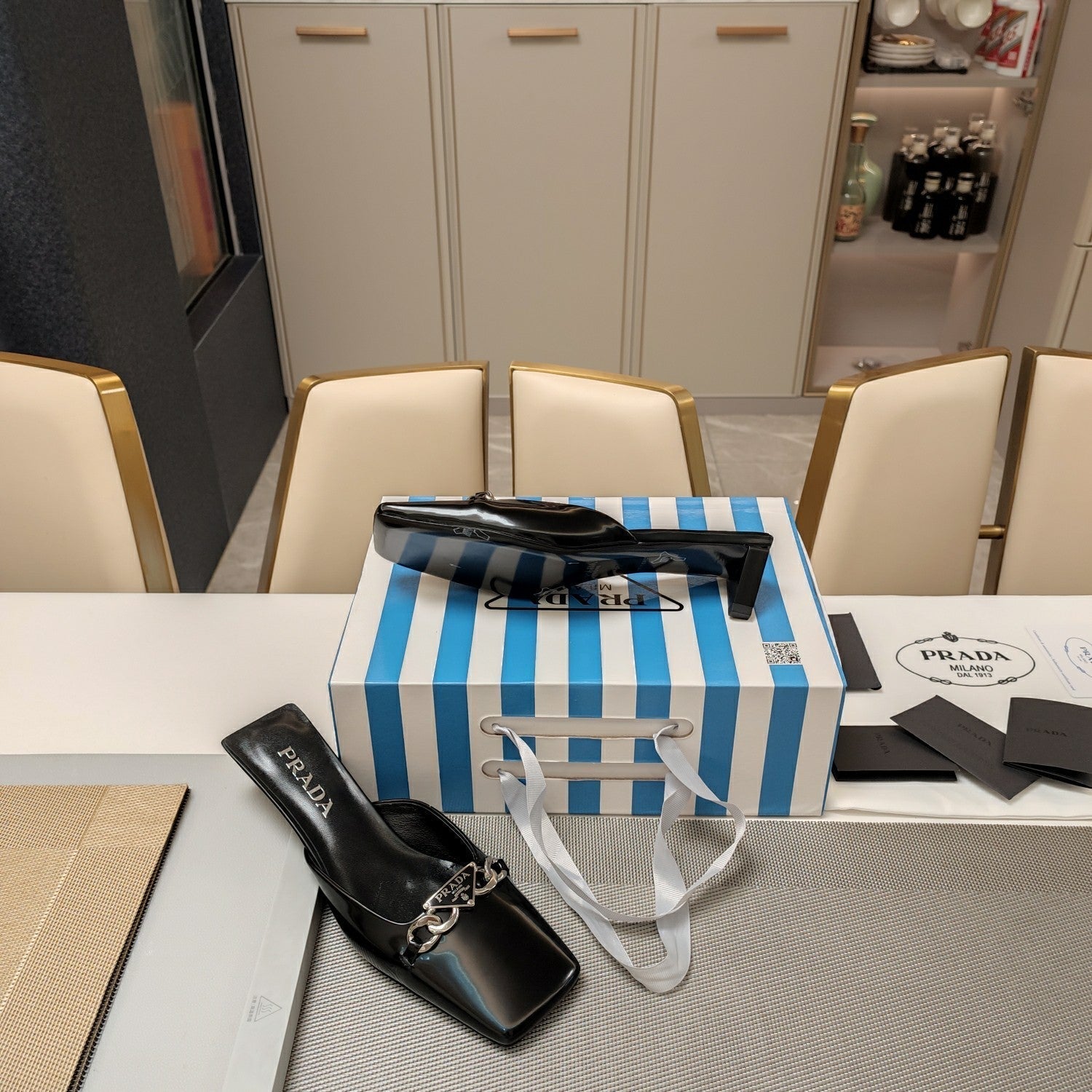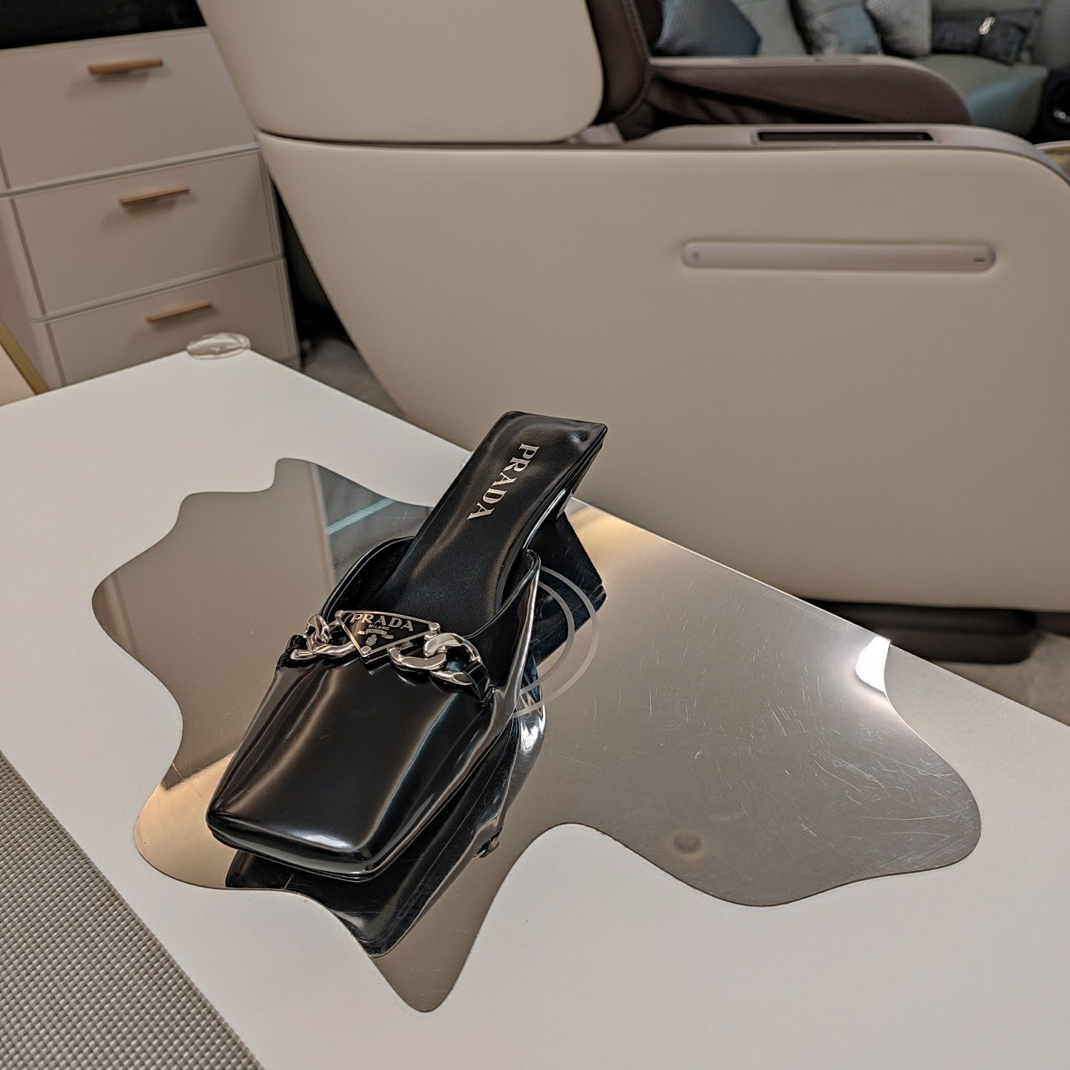 PRA SQUARE TOE MULES BLACK CALFSKIN WITH CHAIN