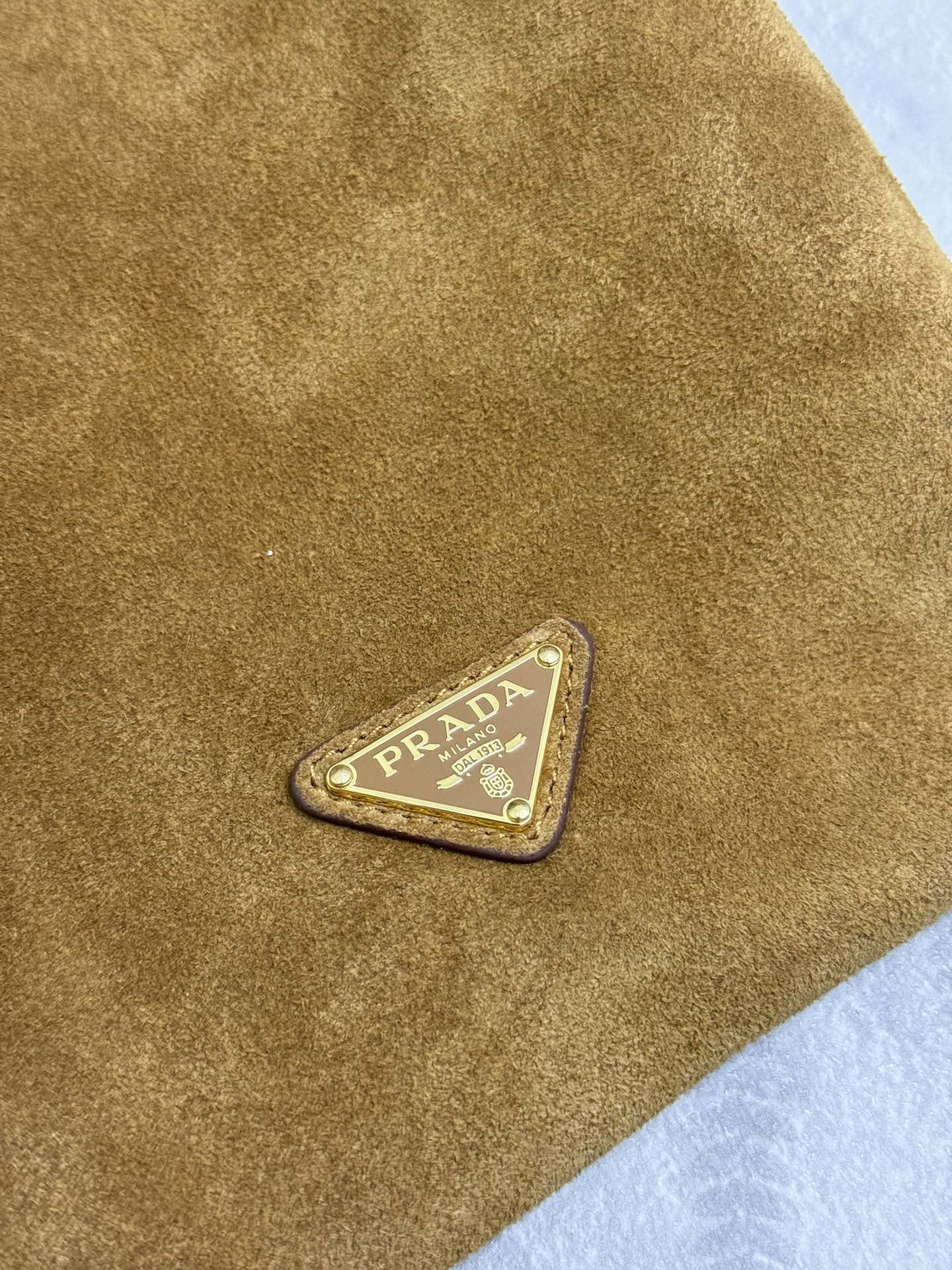PRADA 25S BUCKET BAG 20 IN LIGHT CARAMEL SUEDE GOLD HARDWRE