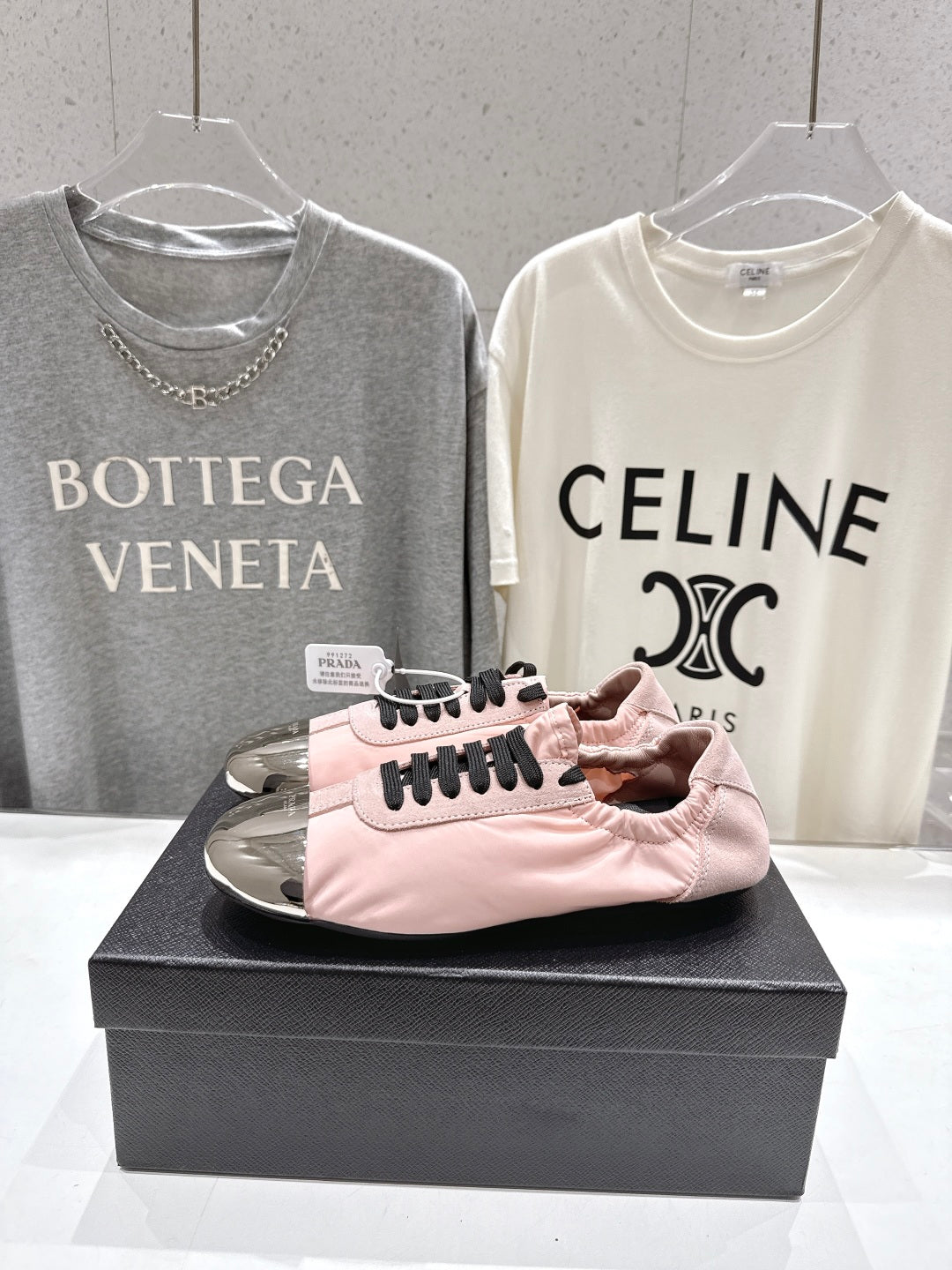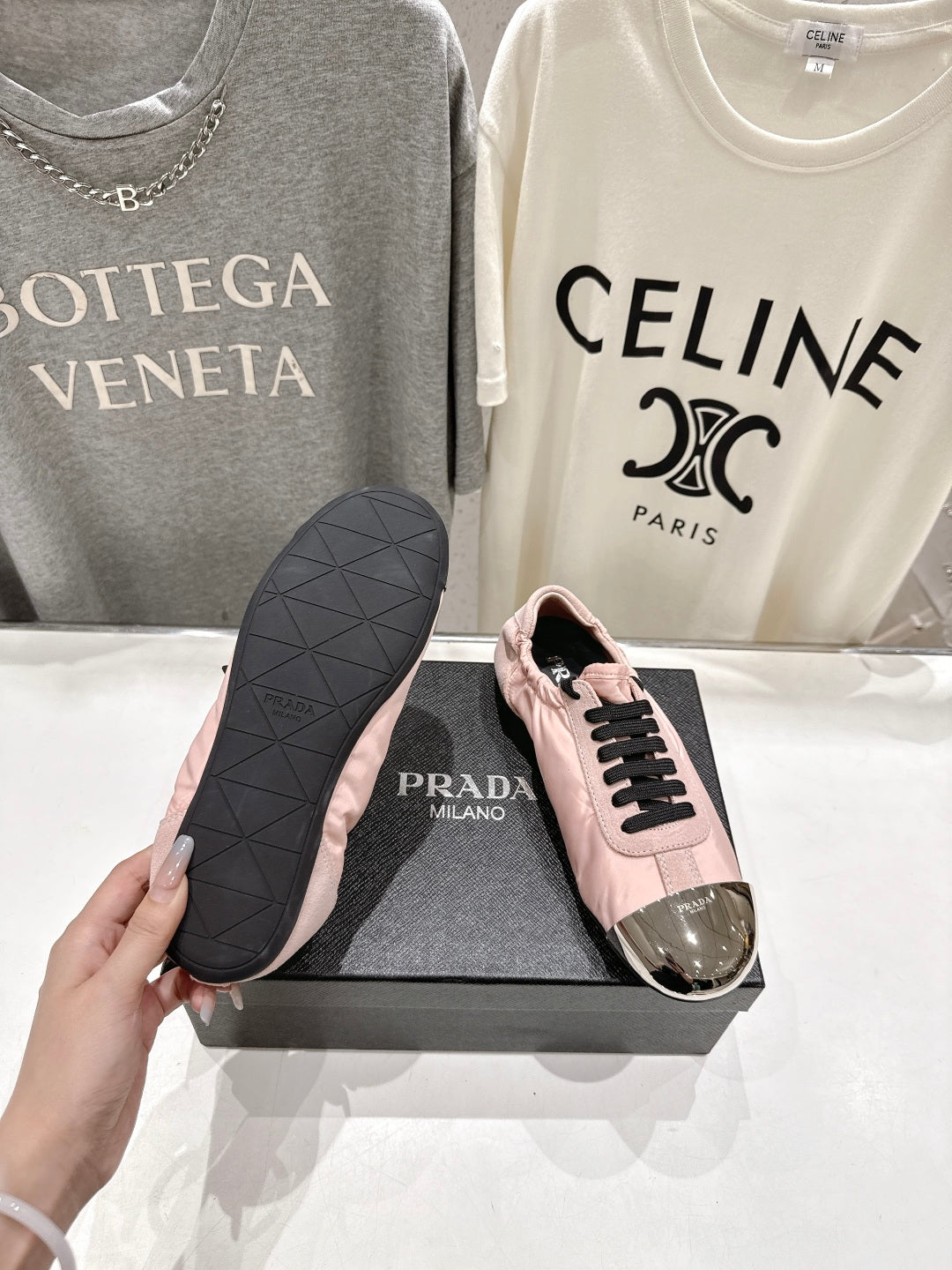 PRADA 25S COLLAPSE RE NYLON AND SUEDE SNEAKERS IN LIGHT PINK WITH METAL TOECAP