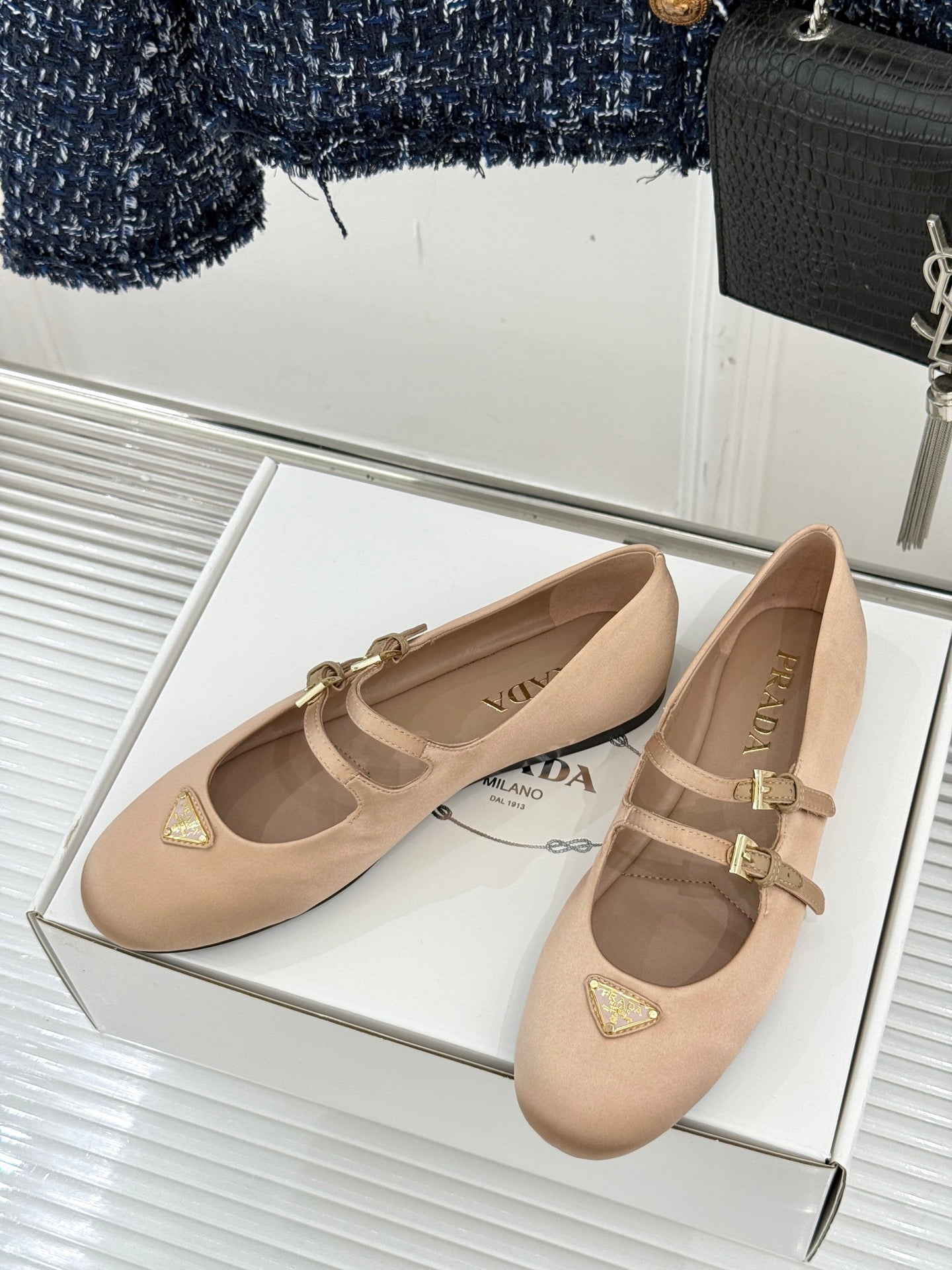 PRADA 25S DOUBLE STRAP BALLERINAS IN NUDE SATIN