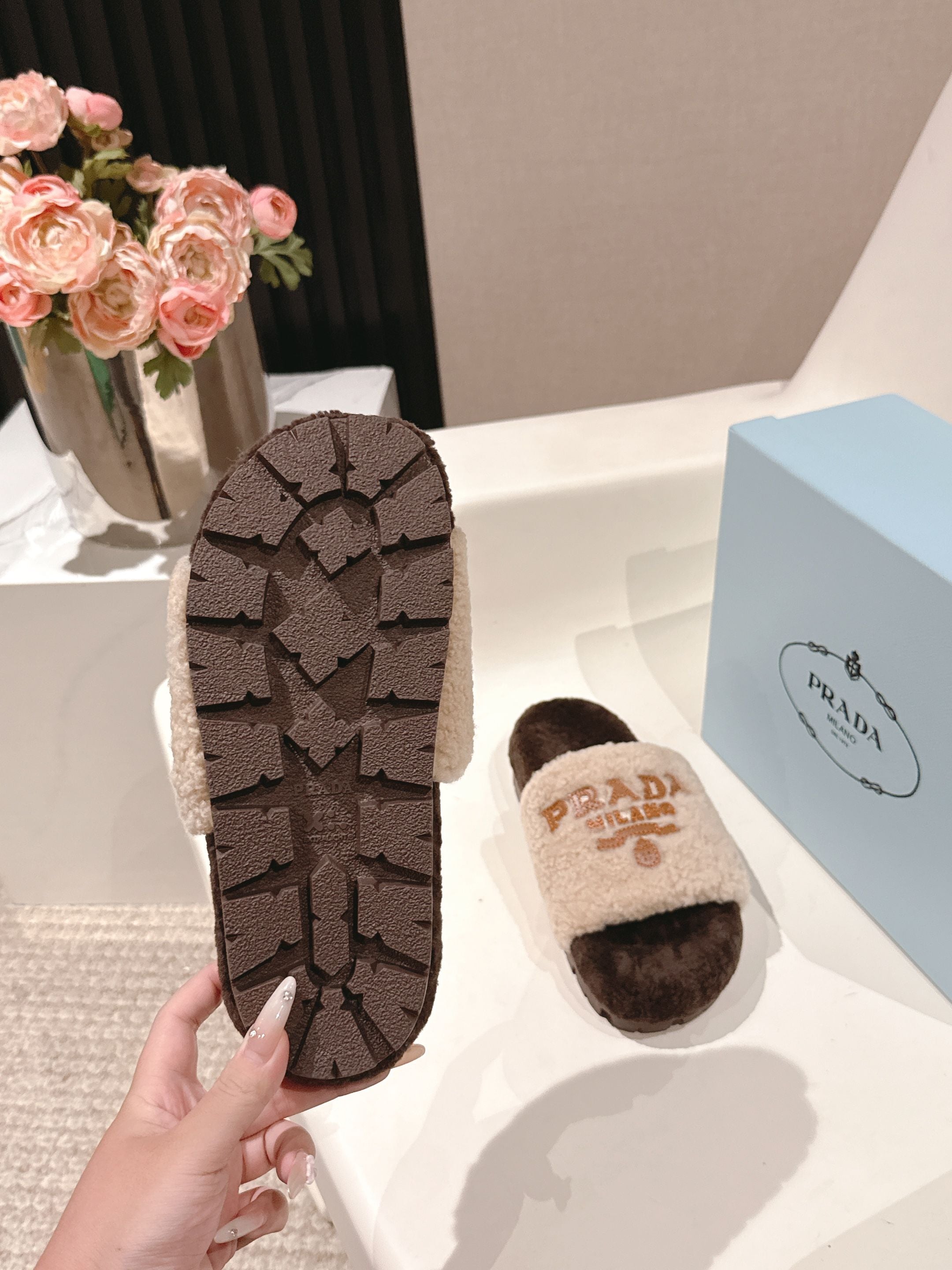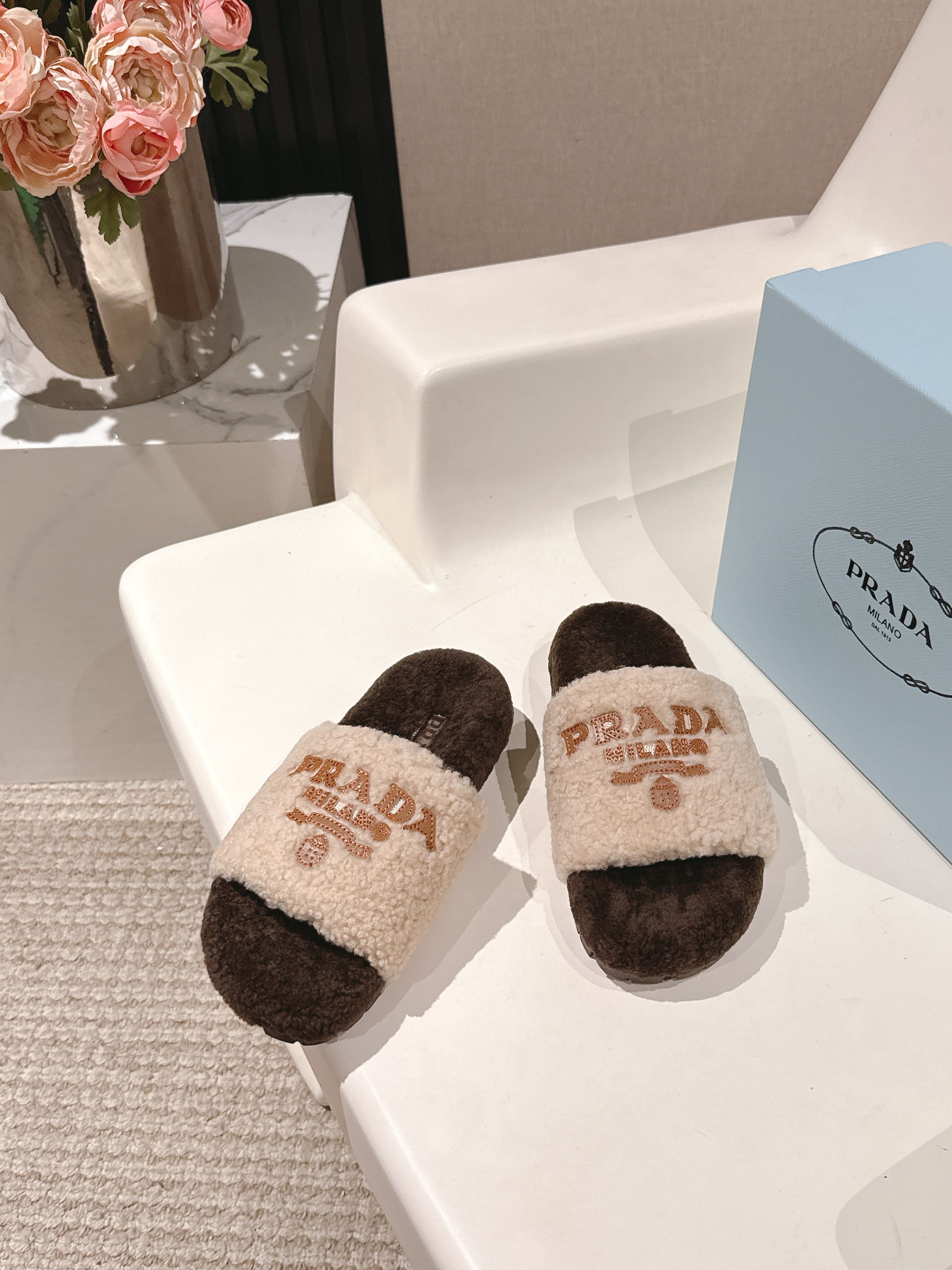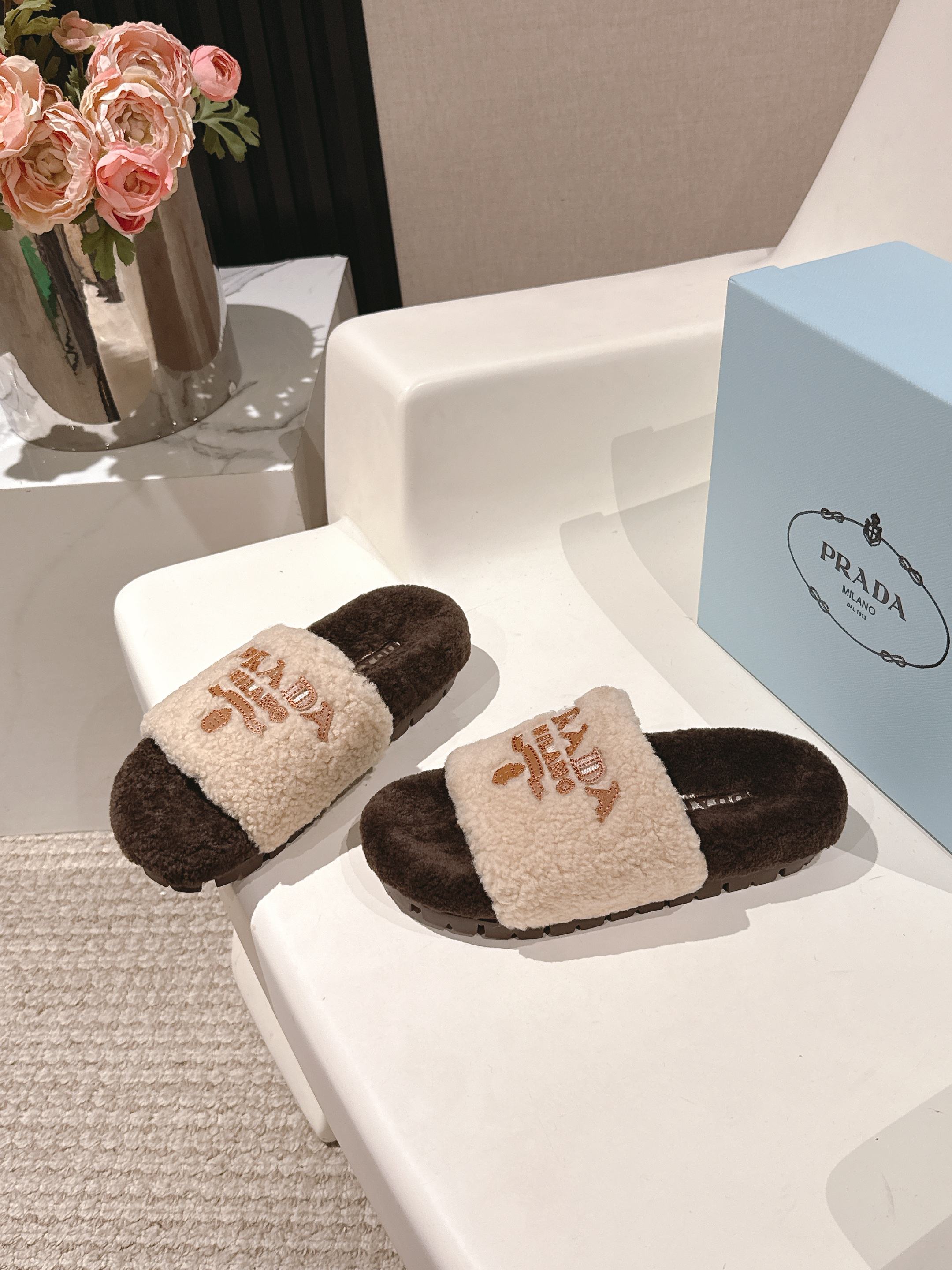 PRADA 25S FLAT MULES IN CREAM AND DARK BROWN RABBIT FUR