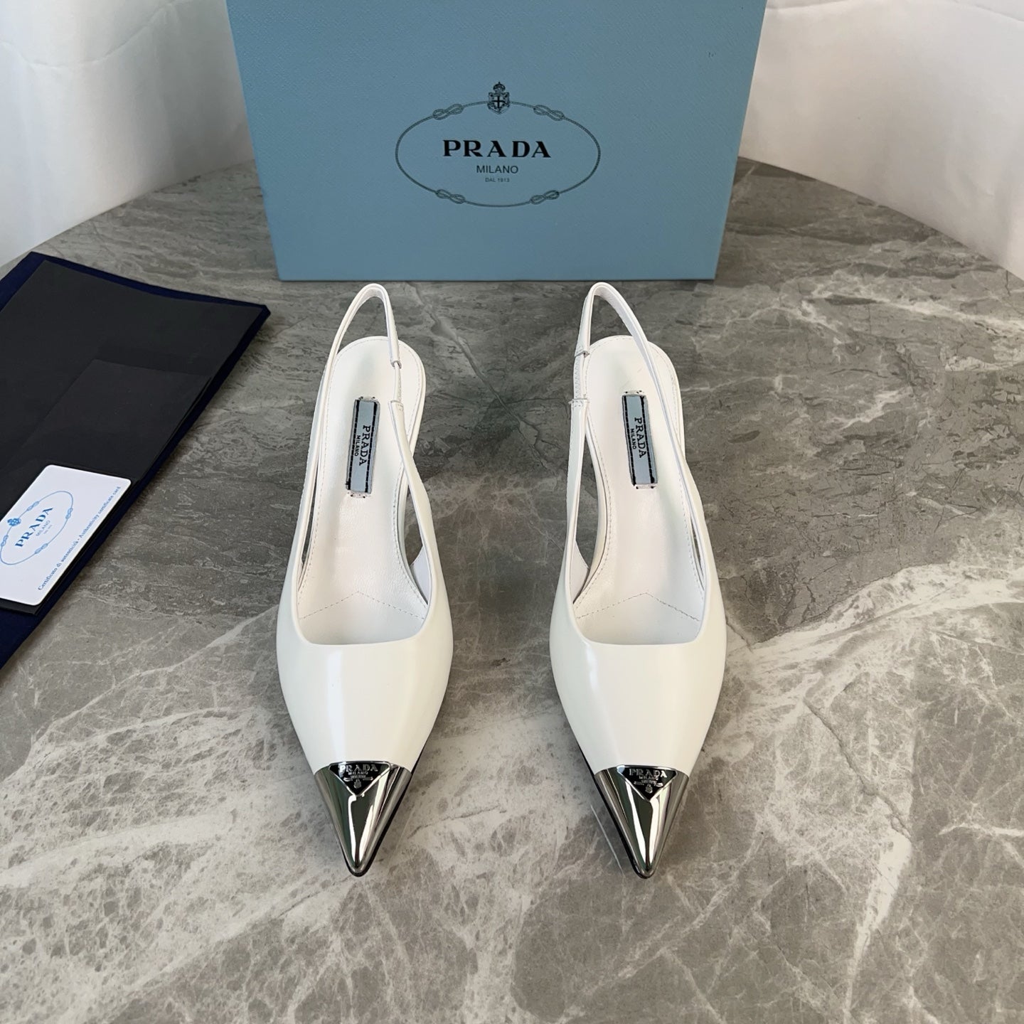 PRADA 25S METAL-TOE SLINGBACK PUMPS IN WHITE CALFSKIN