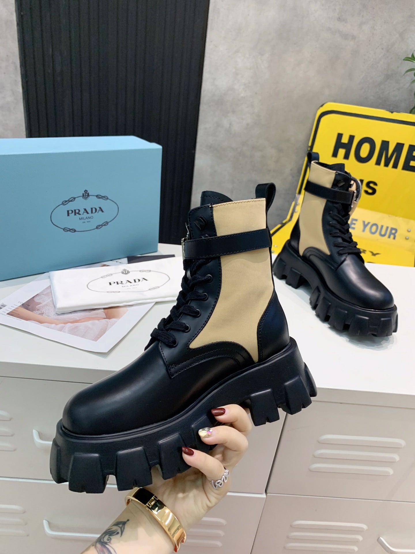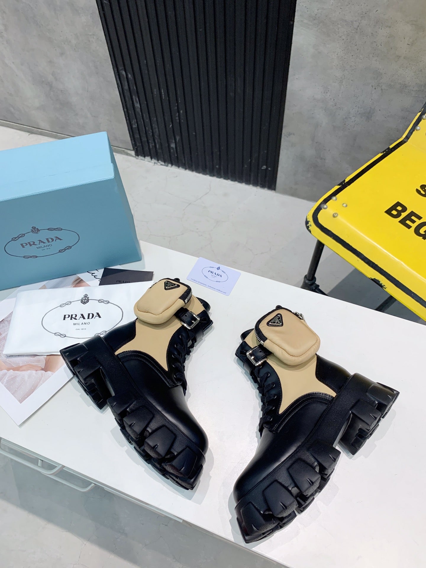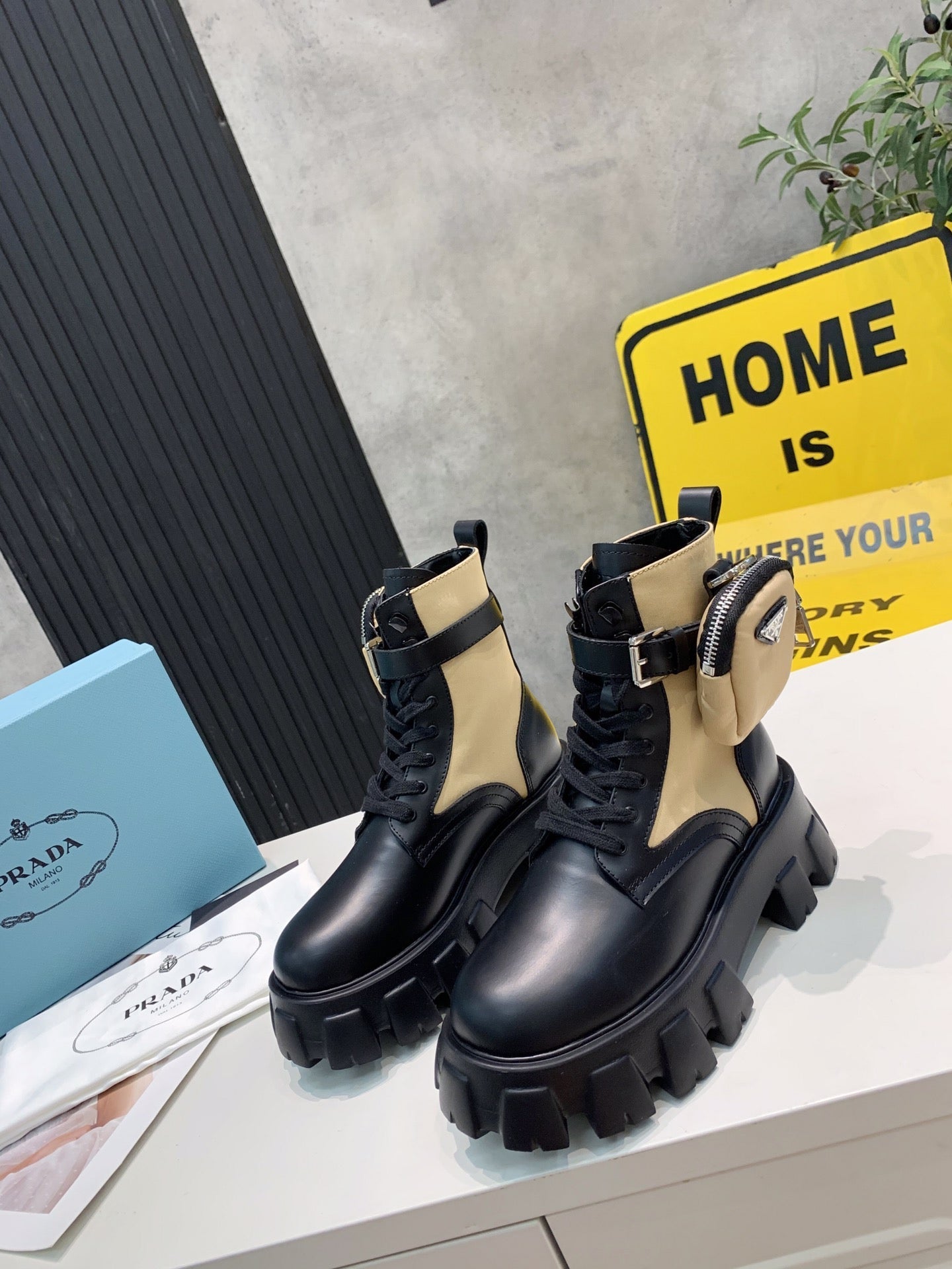 PRADA 25S MONOLITH BRUSHED AND RE NYLON BOOTS WITH POUCH BLACK AND MUTED OLIVE