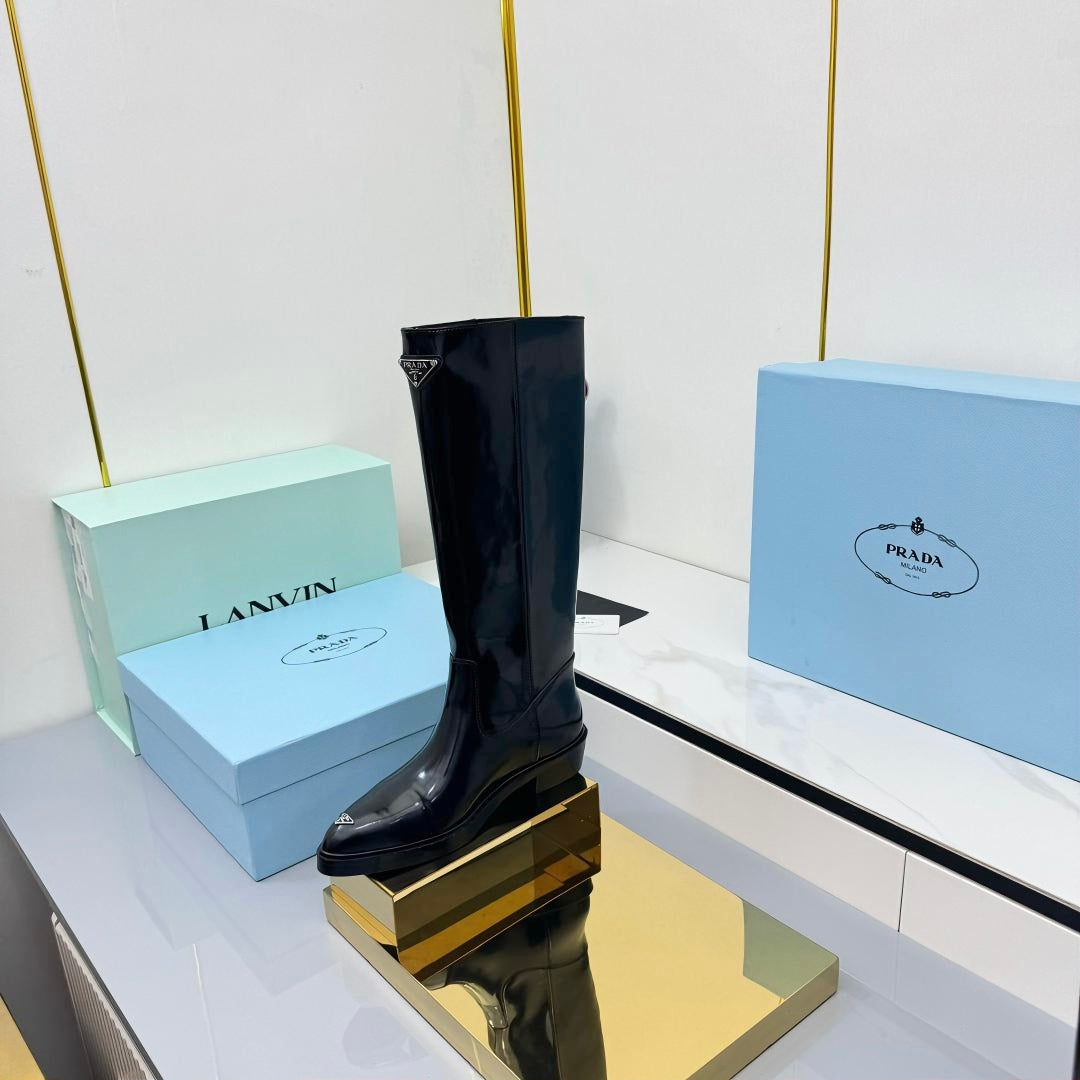PRADA 25S POINTED TALL BOOTS 50MM IN BLACK GLOSSY CALFSKIN WITH LOGO
