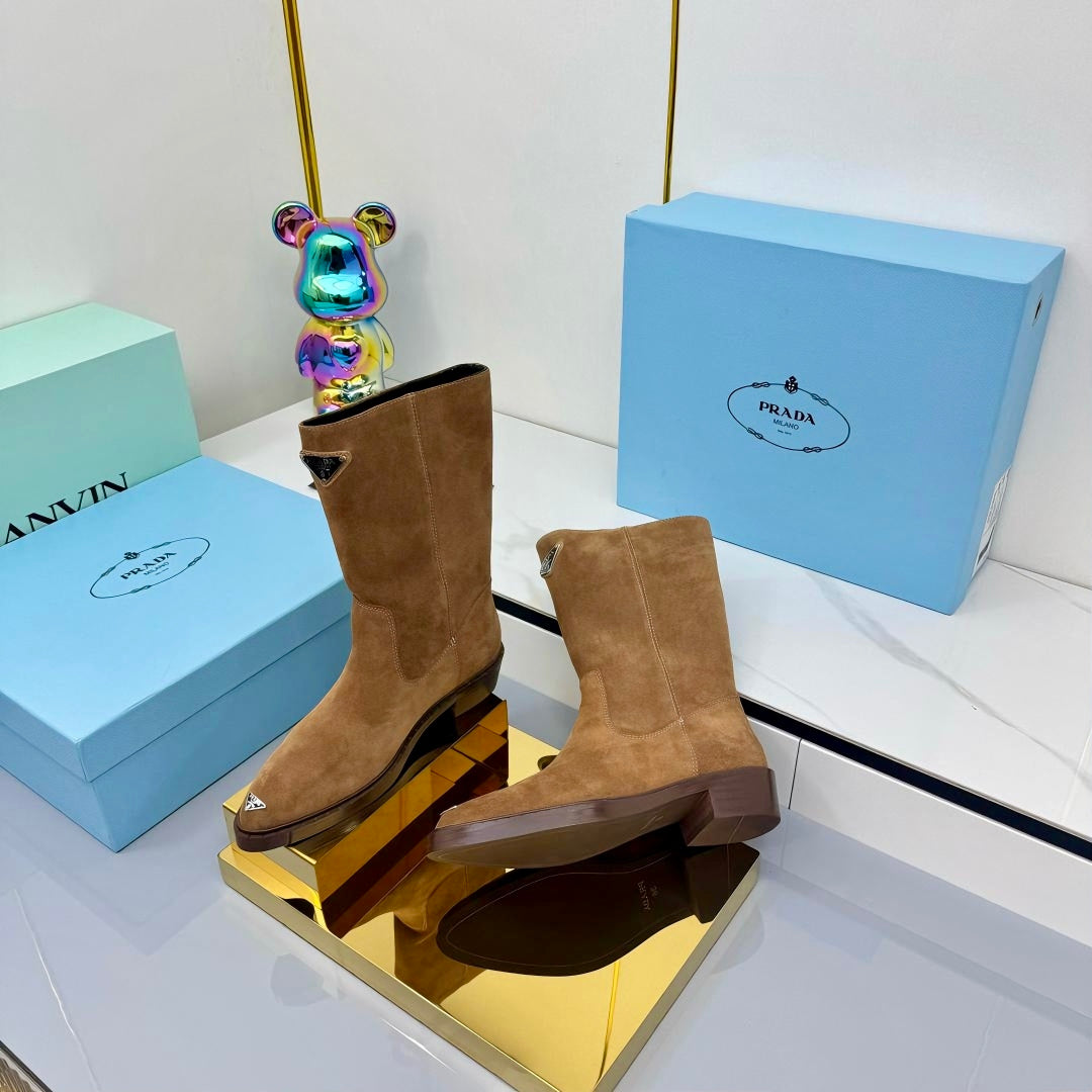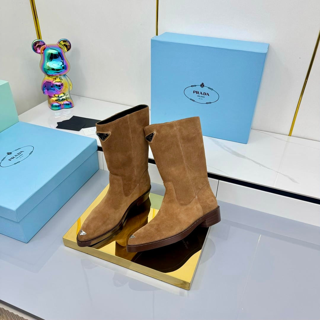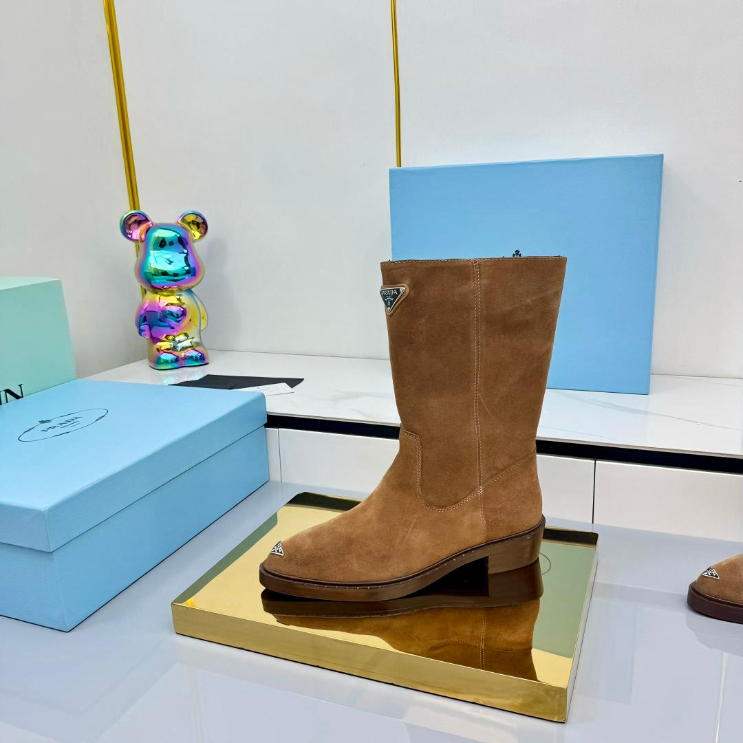 PRADA 25S POINTED TOE HIGH BOOTS 50MM IN DARK BROWN SUEDE WITH LOGO