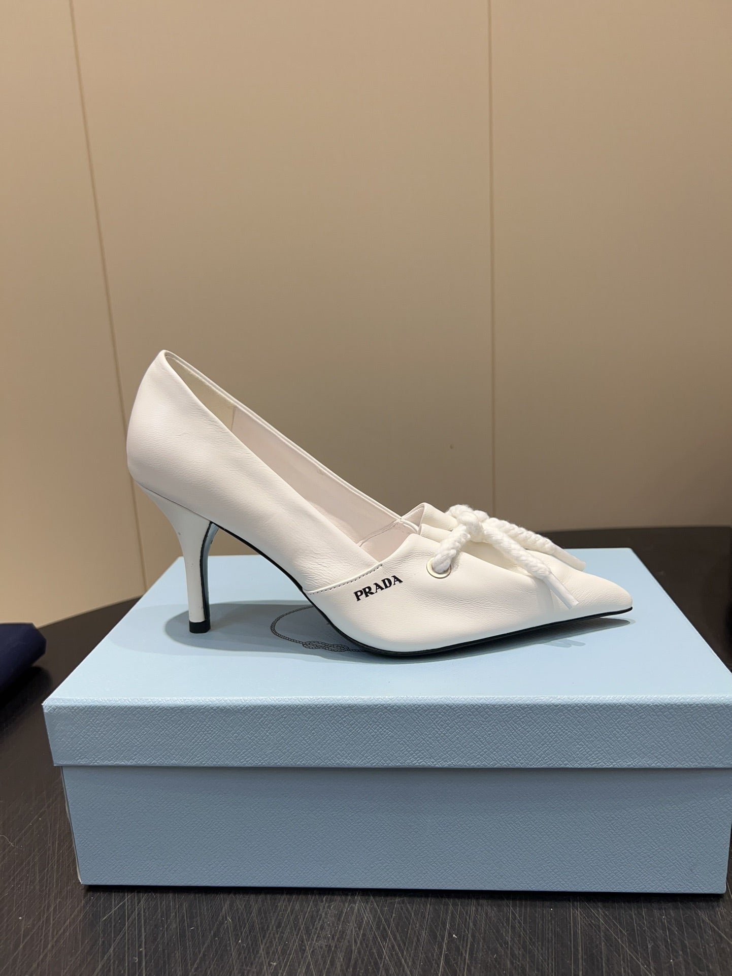 PRADA 25S POINTED TOE HIGH HEELS 85MM IN IVORY LAMBSKIN WITH TIE UP DESIGN