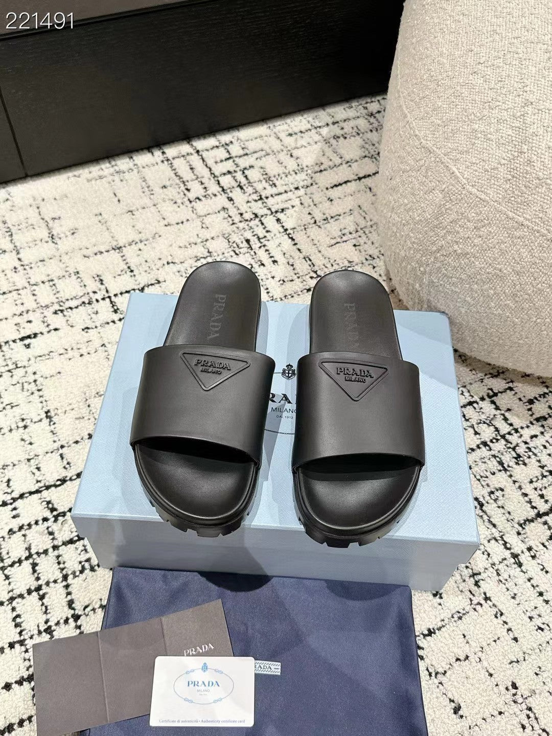 PRADA 25S RUBBER SLIDE IN CHARCOAL CALFSKIN WITH LOGO
