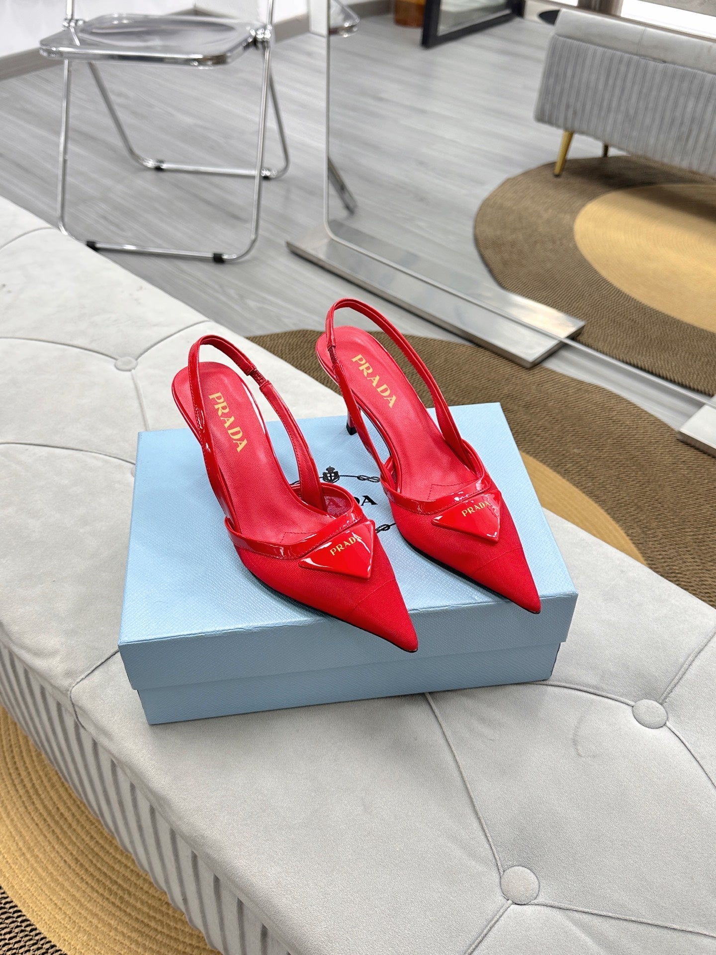 PRADA 25S TRIANGLE LOGO SLINGBACK PUMPS IN RED MESH FABRIC