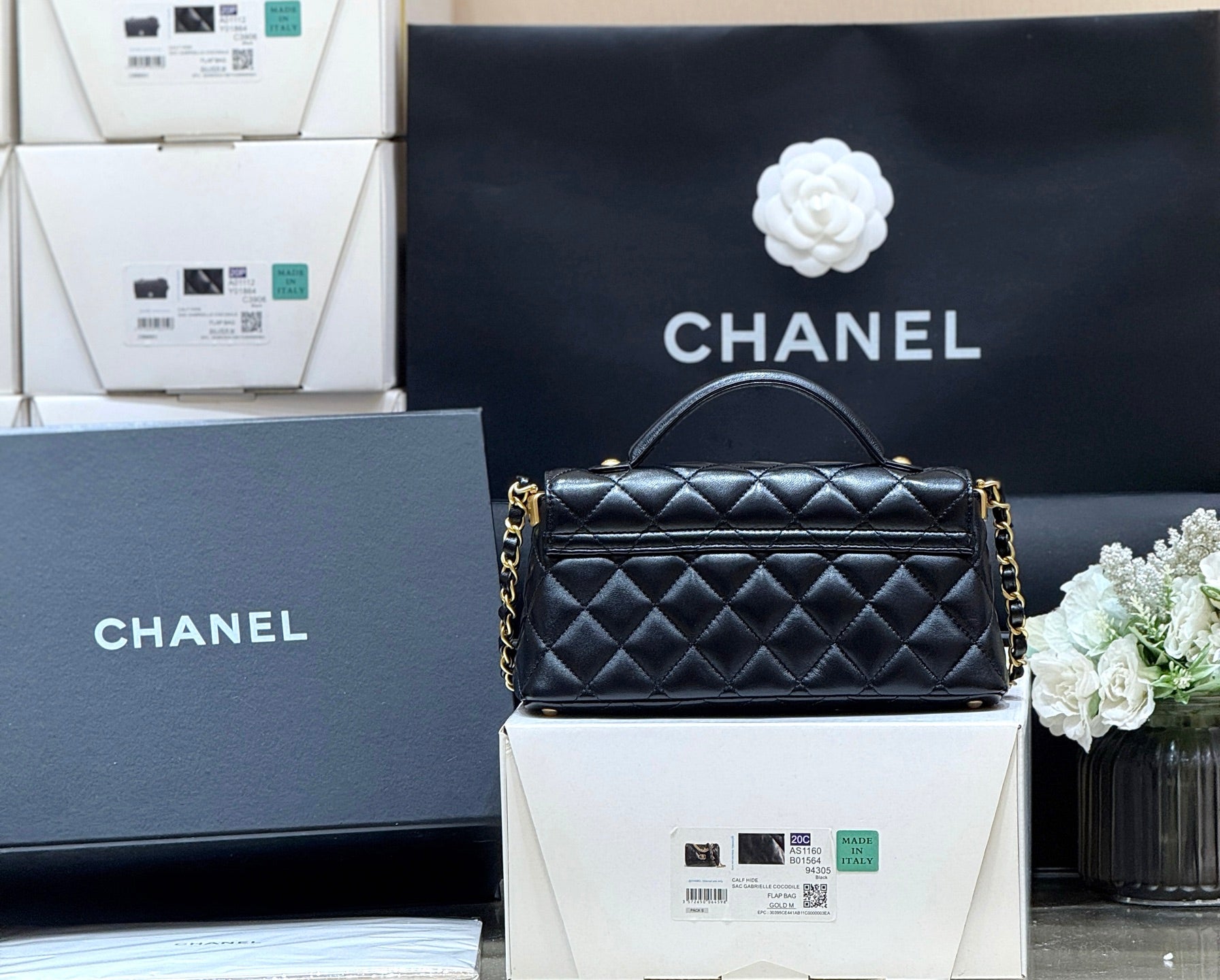 QUILTED FLAP BAG WITH HANDLE 20 IN BLACK LAMBSKIN GOLD PLATED METAL