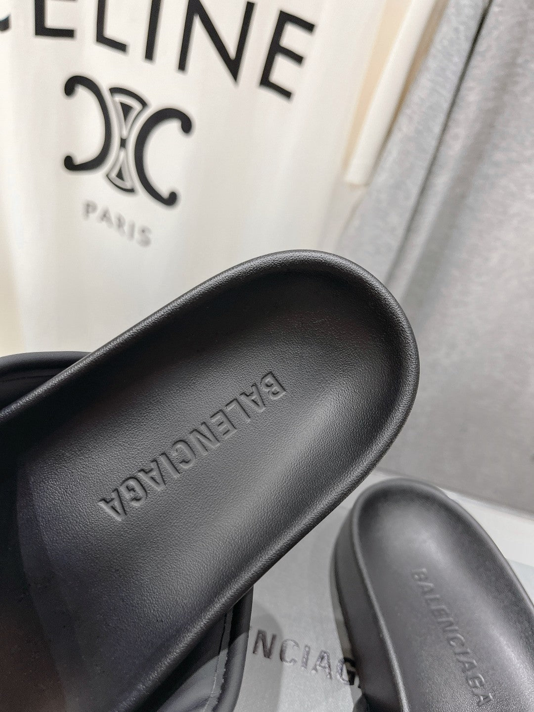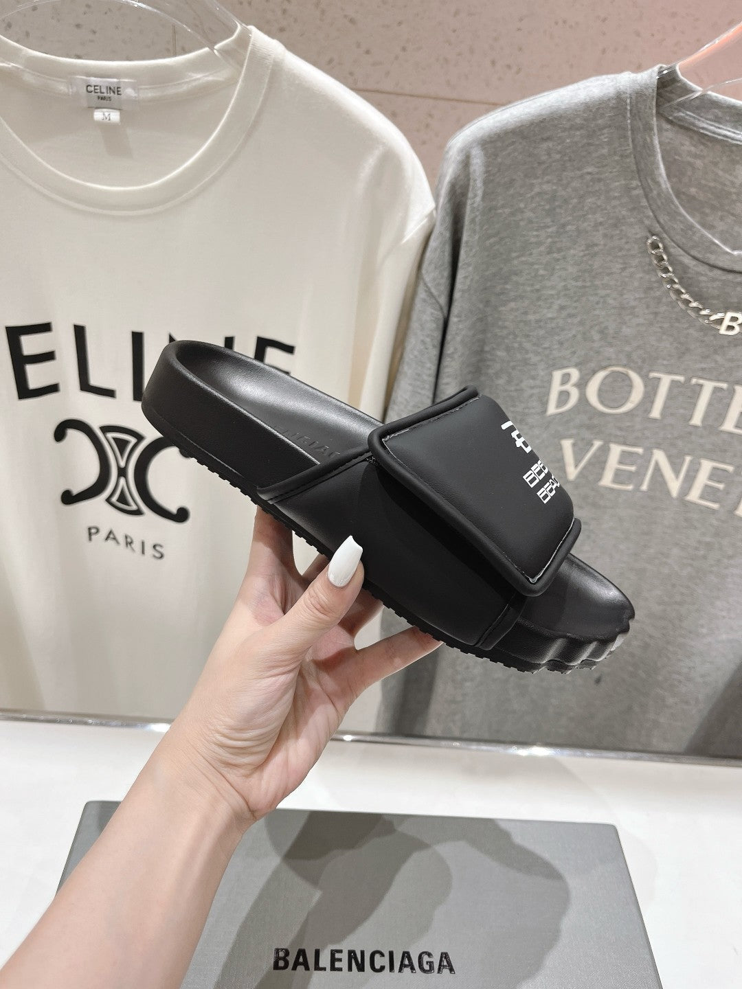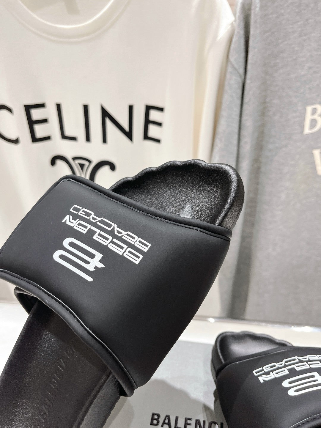 SLIDE SANDALS IN BLACK NYLON AND RUBBER WHITE PRINT