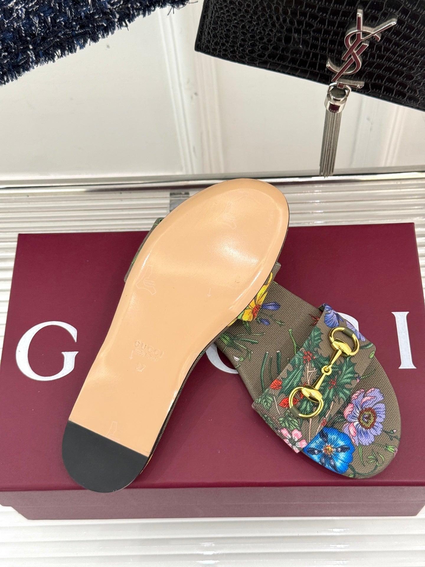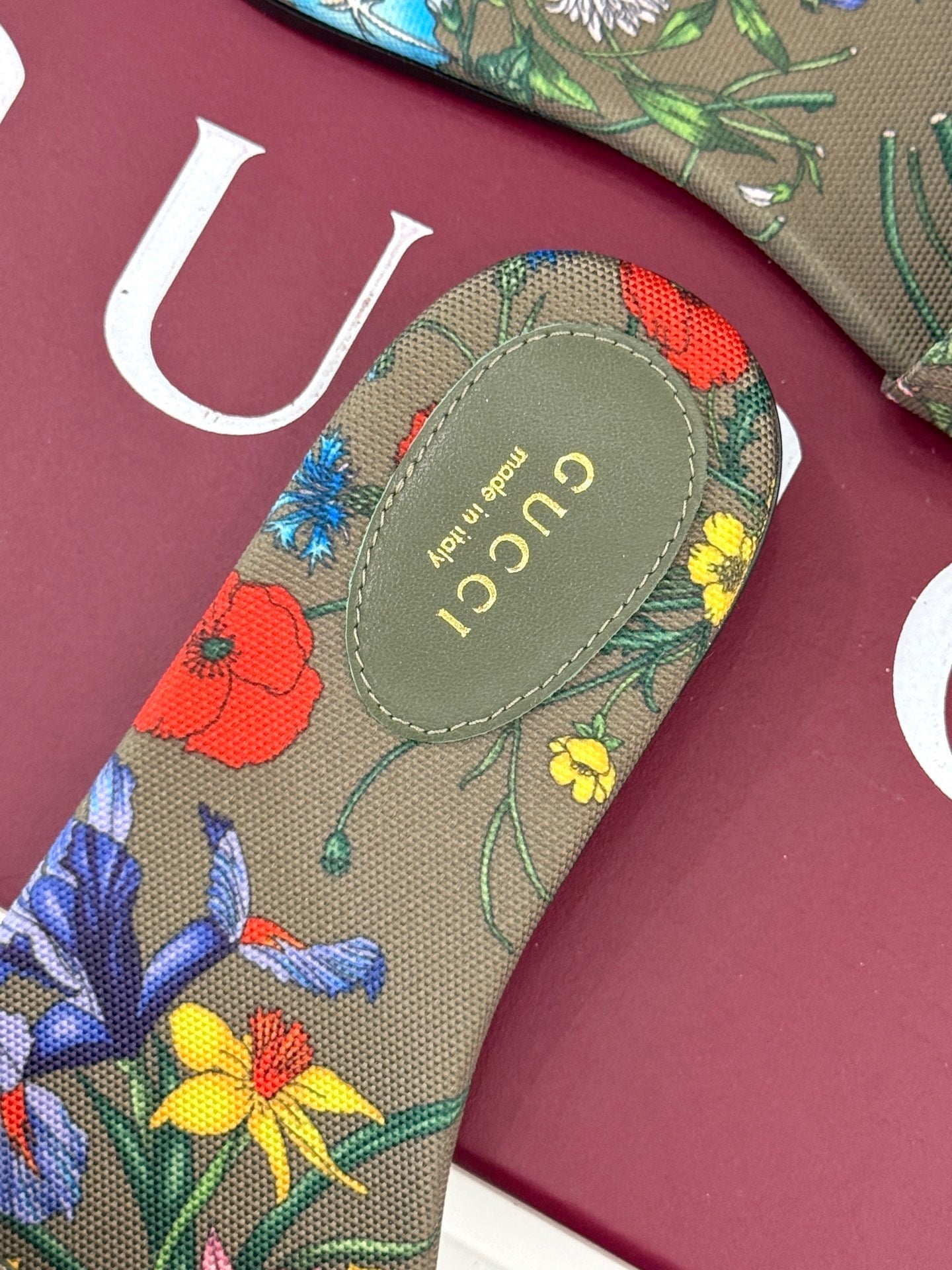 SLIDE SANDALS IN WARM BEIGE FABRIC FLORAL AND LEAF PRINT