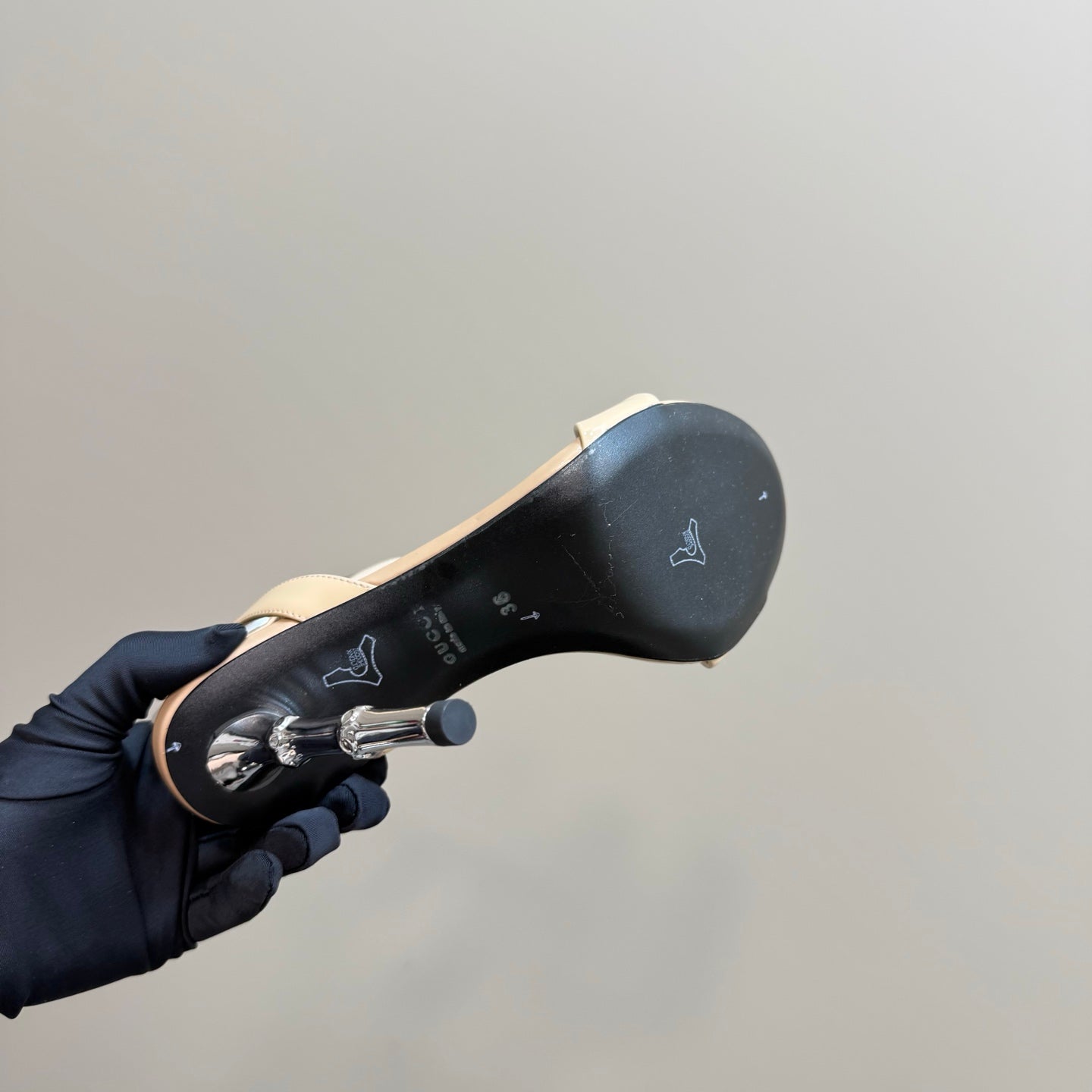 STRAP HIGH BAMBOO-EFFECT HEEL SANDAL IN BEIGE PATENT CALFSKIN