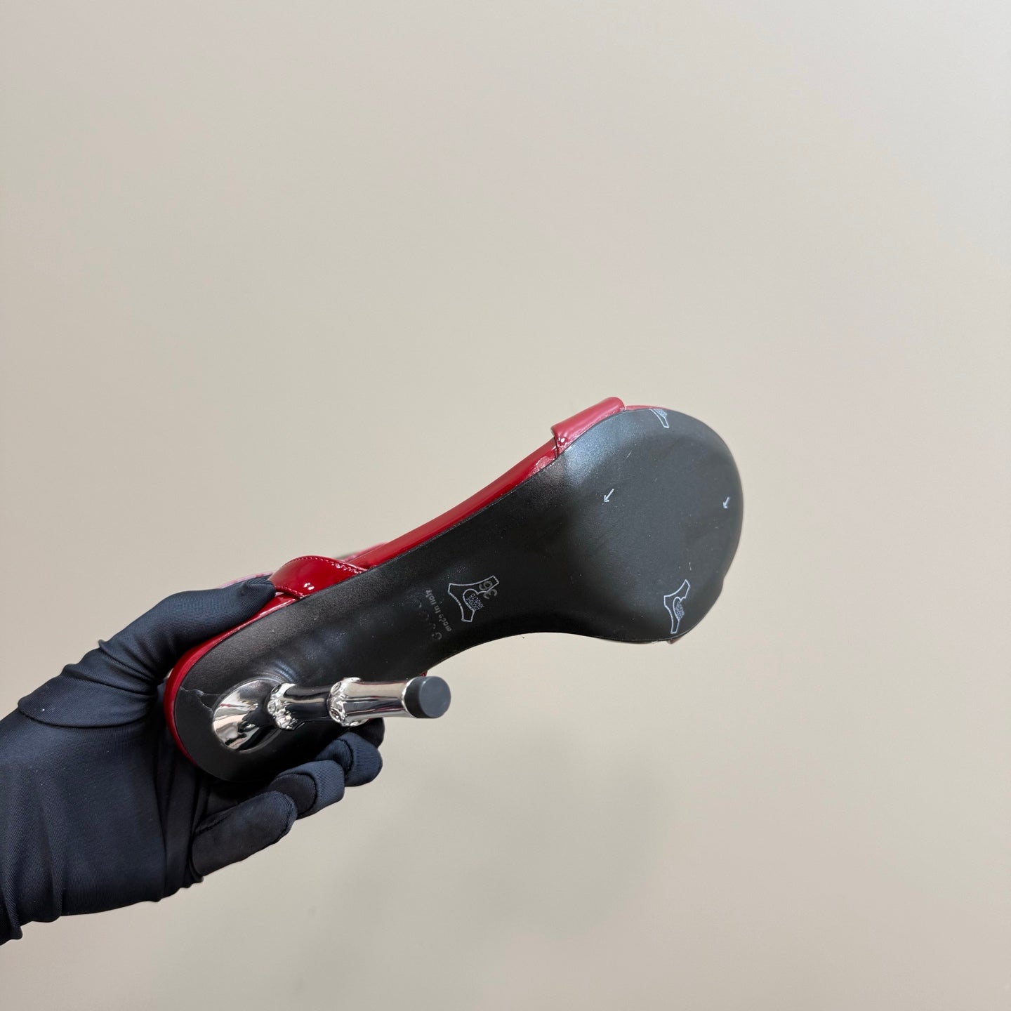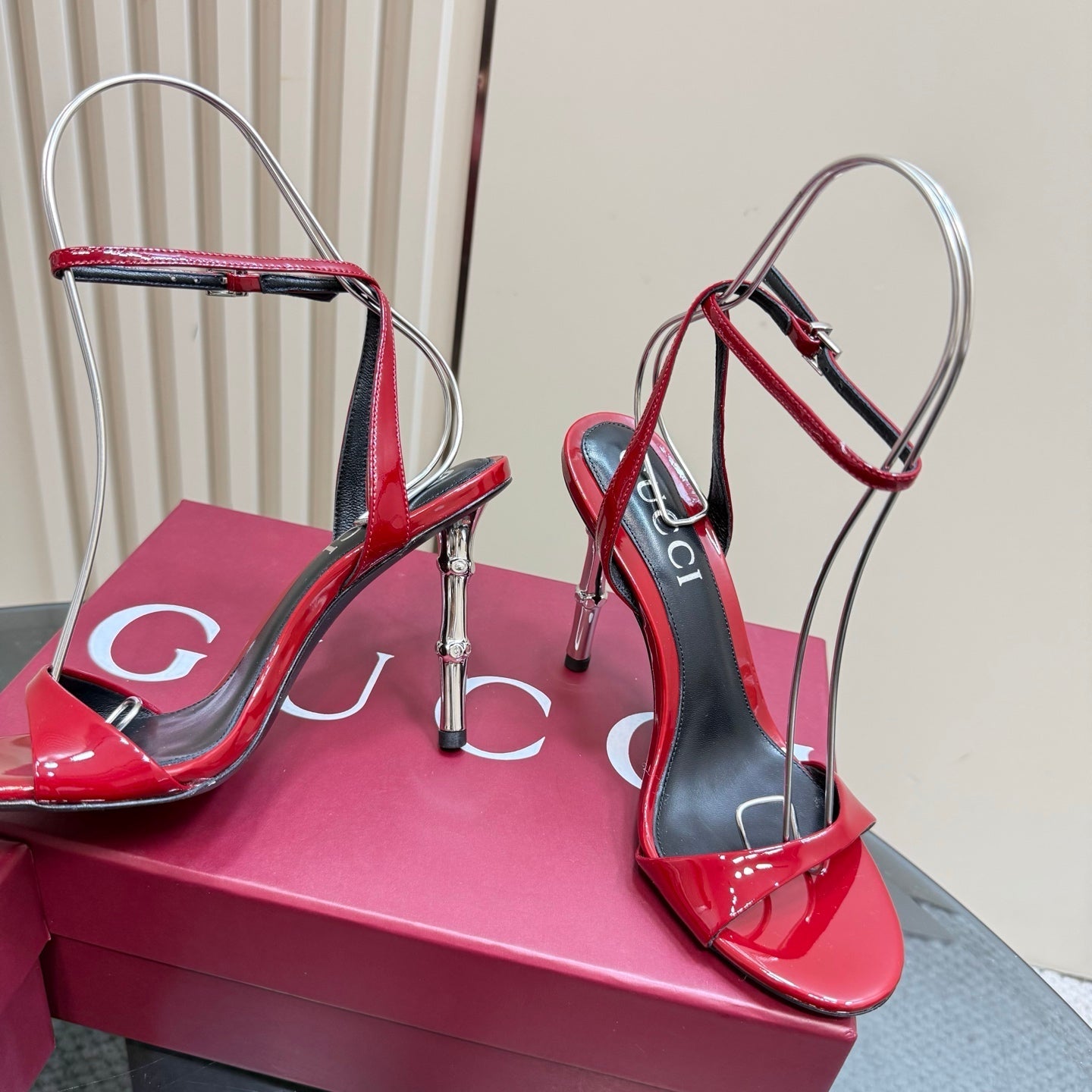 STRAP HIGH BAMBOO-EFFECT HEEL SANDAL IN RED PATENT CALFSKIN