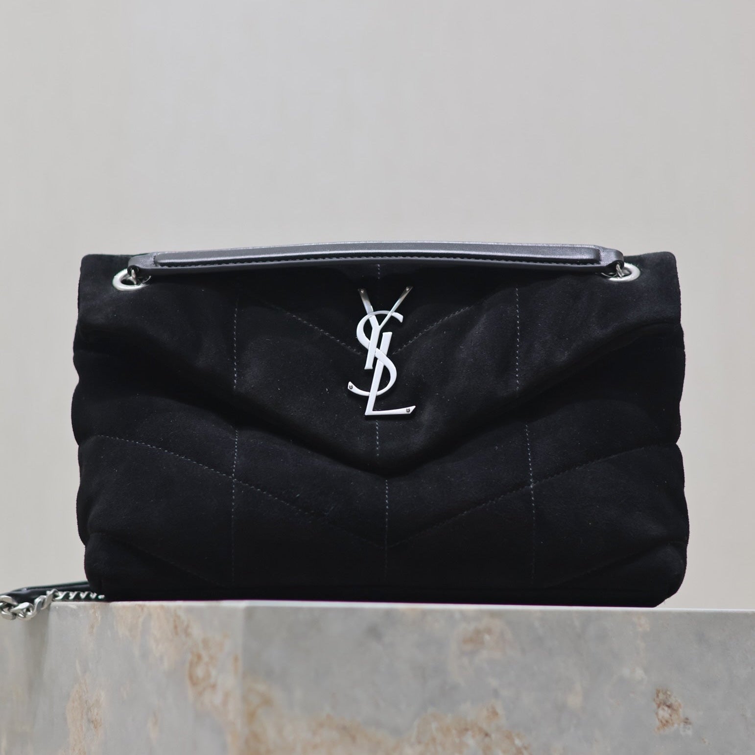 YSL 25S LOULOU PUFFER MM 29 IN BLACK SUEDE SILVER HARDWARE