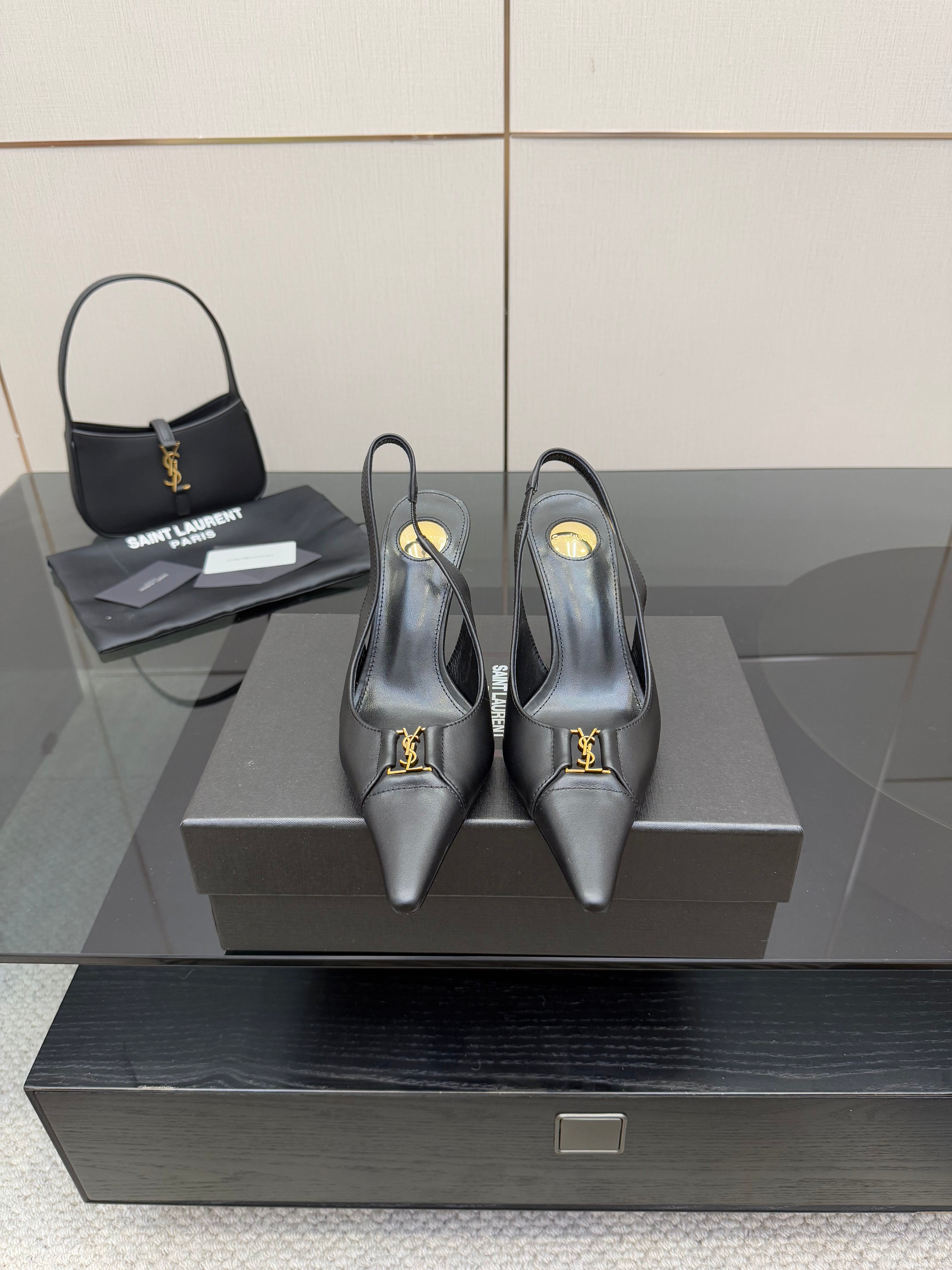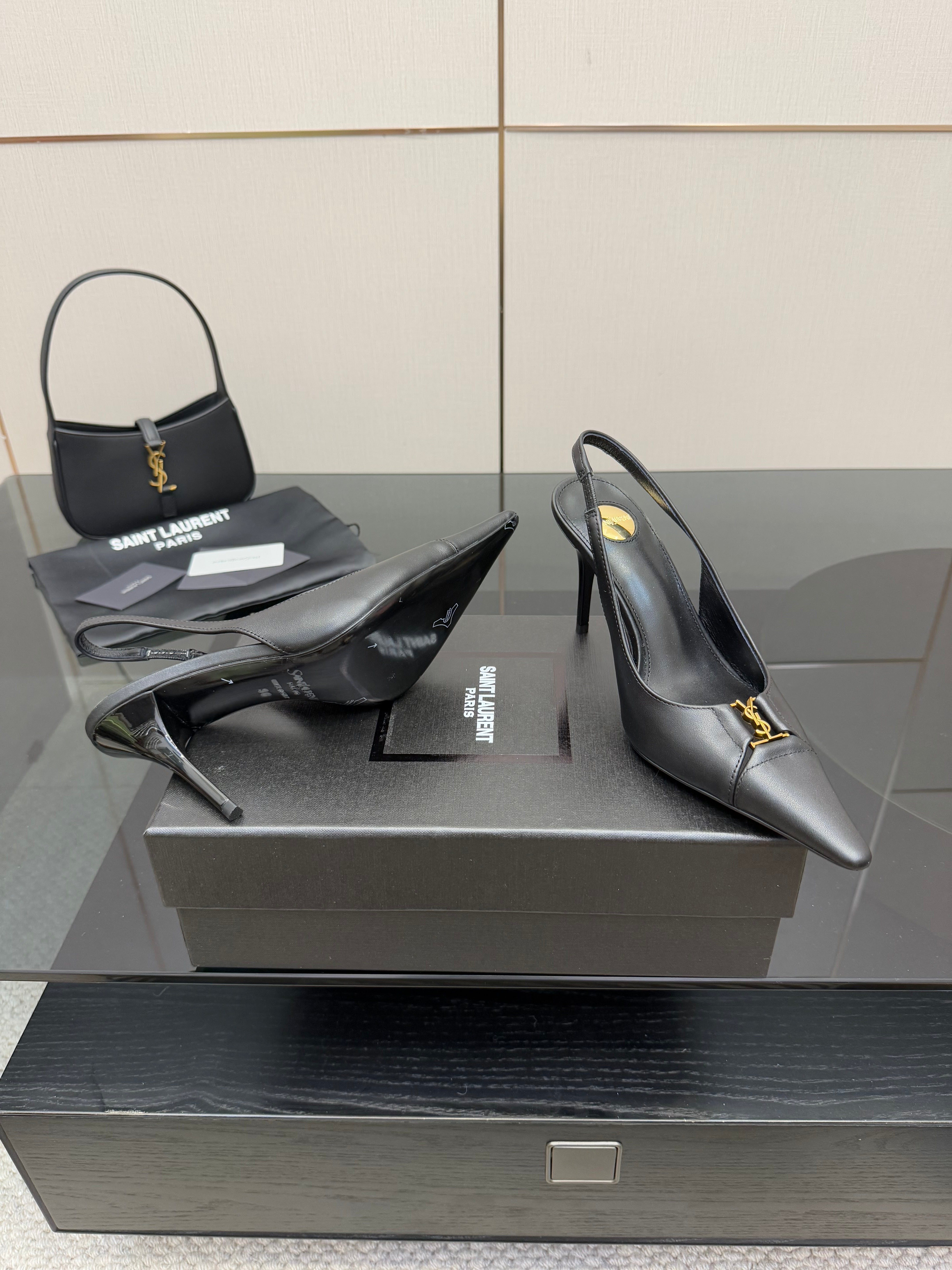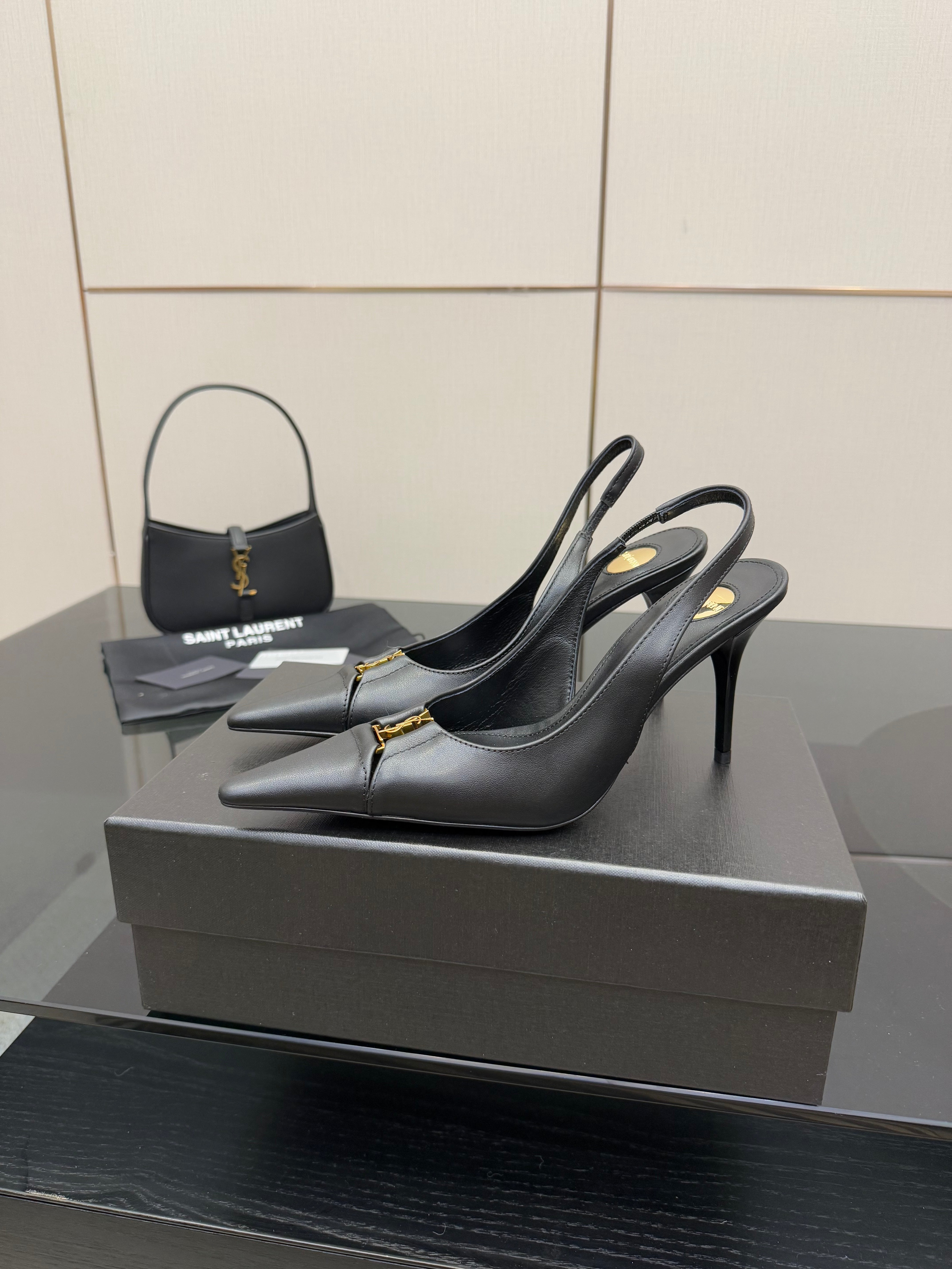 YSL 25S SLINGBACK HIGH HEELS 90 MM IN BLACK SMOOTH LAMBSKIN WITH GOLD HARDWARE STYLE 3