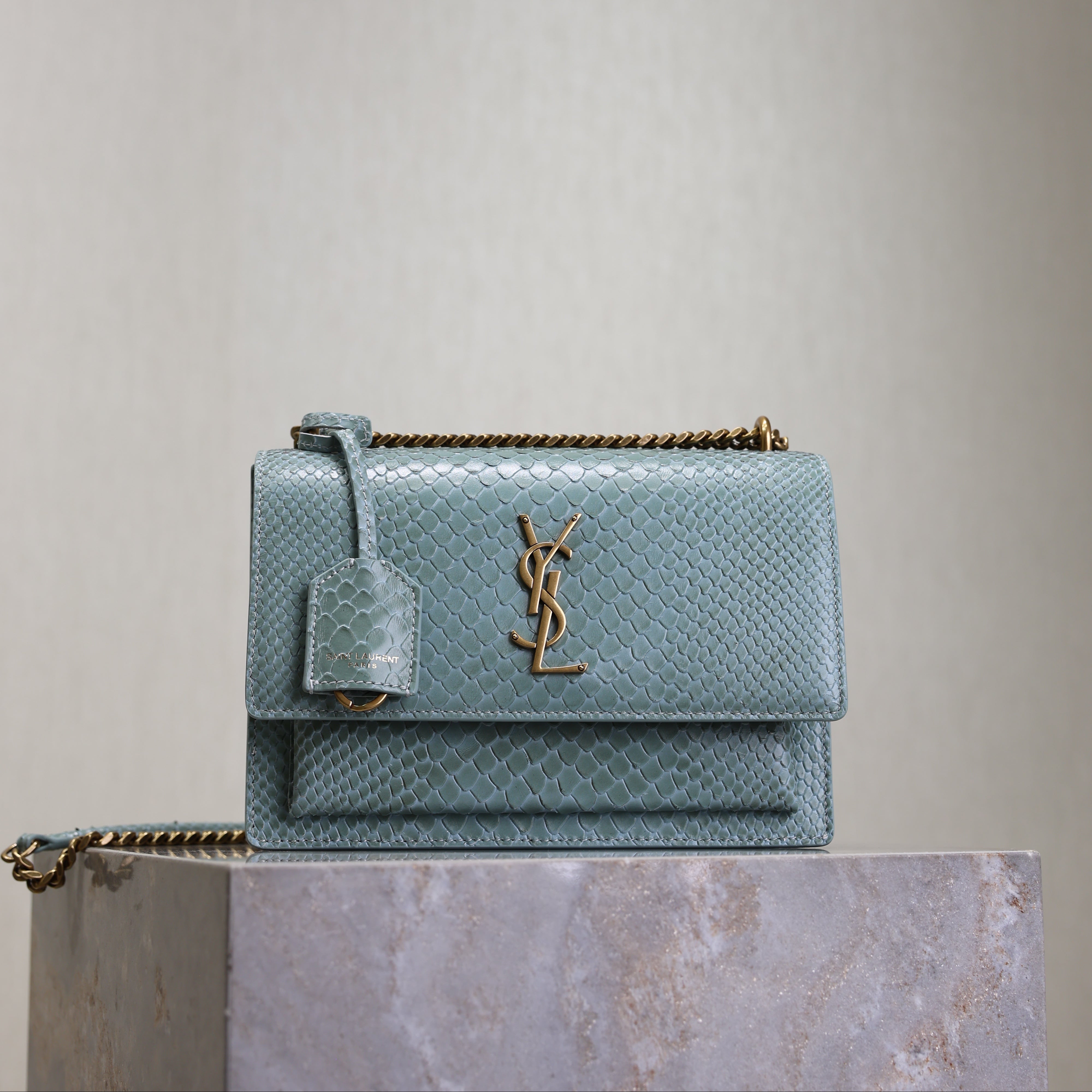 YSL 25S SUNSET MEDIUM 22 IN LIGHT BLUE CROCODILE-EMBOSSED CALFSKIN GOLD HARDWARE